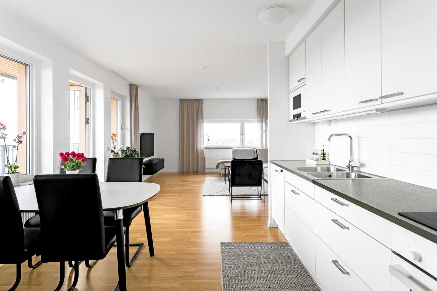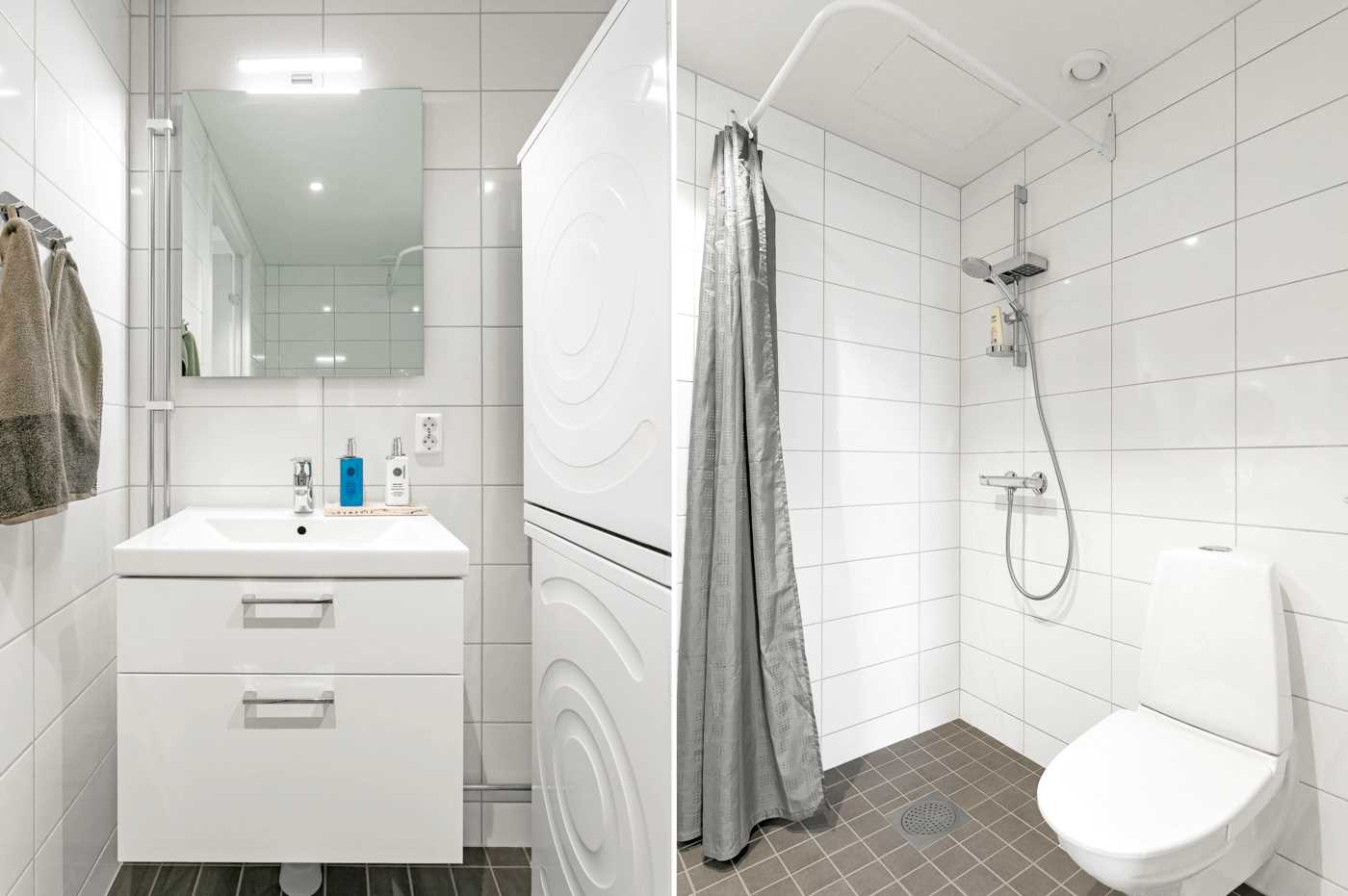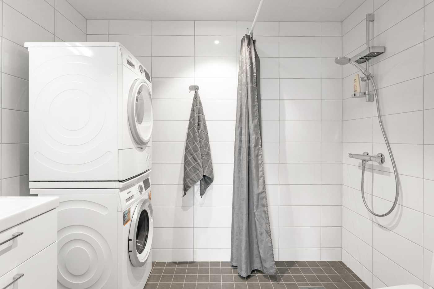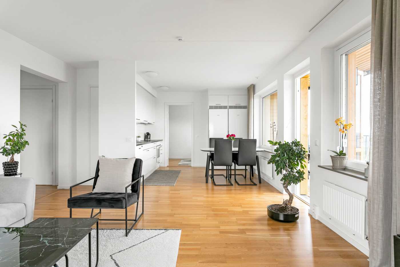 Lägenheten präglas av en modern och stilren design med fönster i två väderstreck som fyller hemmet med naturligt ljus. Det helkaklade badrummet är både smakfullt och funktionellt, utrustat med dusch samt kombinerad tvättmaskin och torktumlare. De vita väggarna och de genomgående parkettgolven skapar en enhetlig, varm och inbjudande atmosfär i hela bostaden.