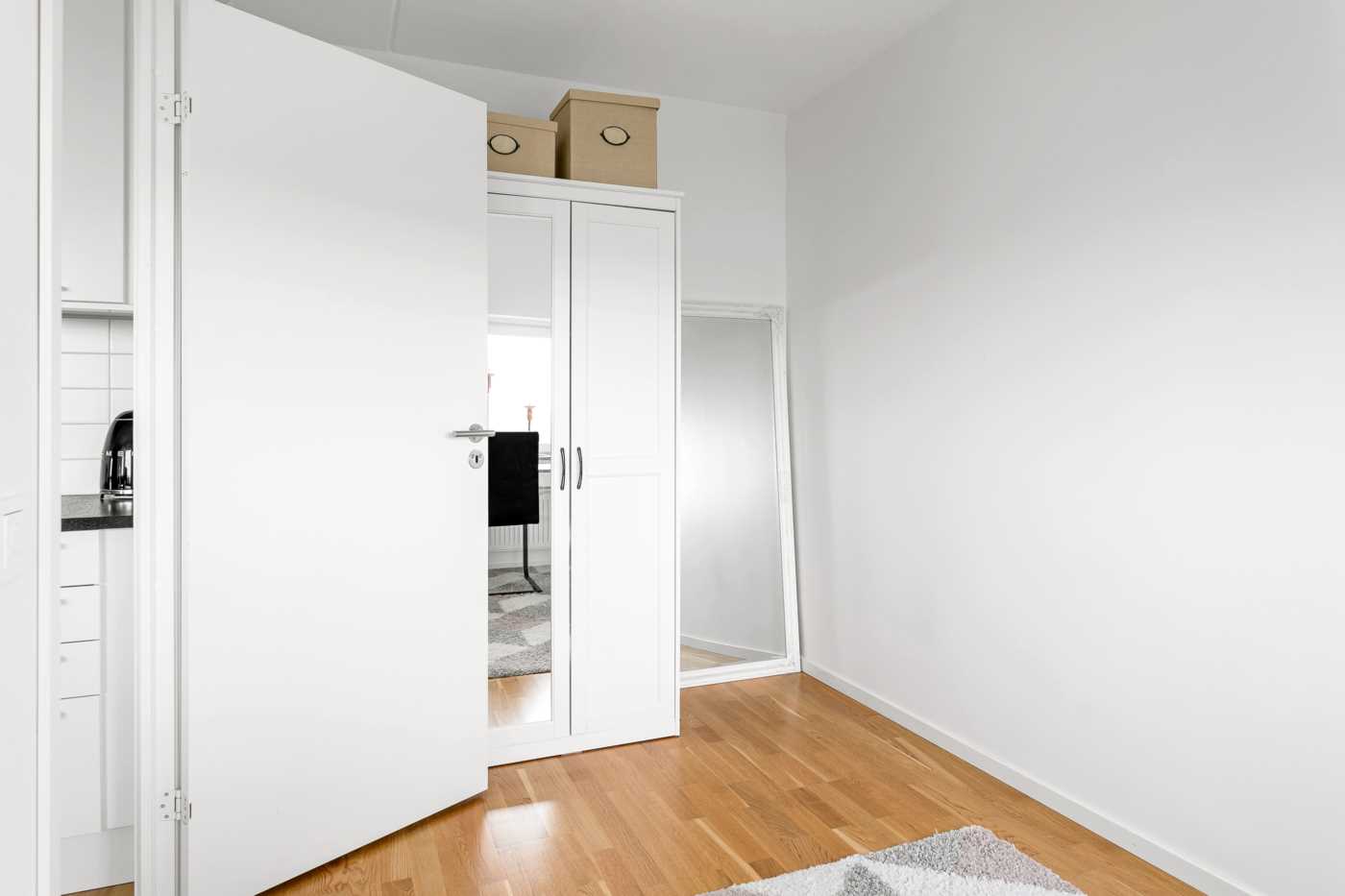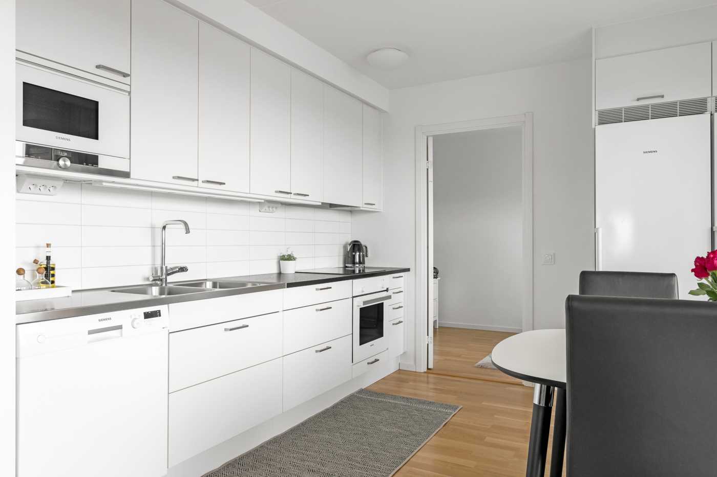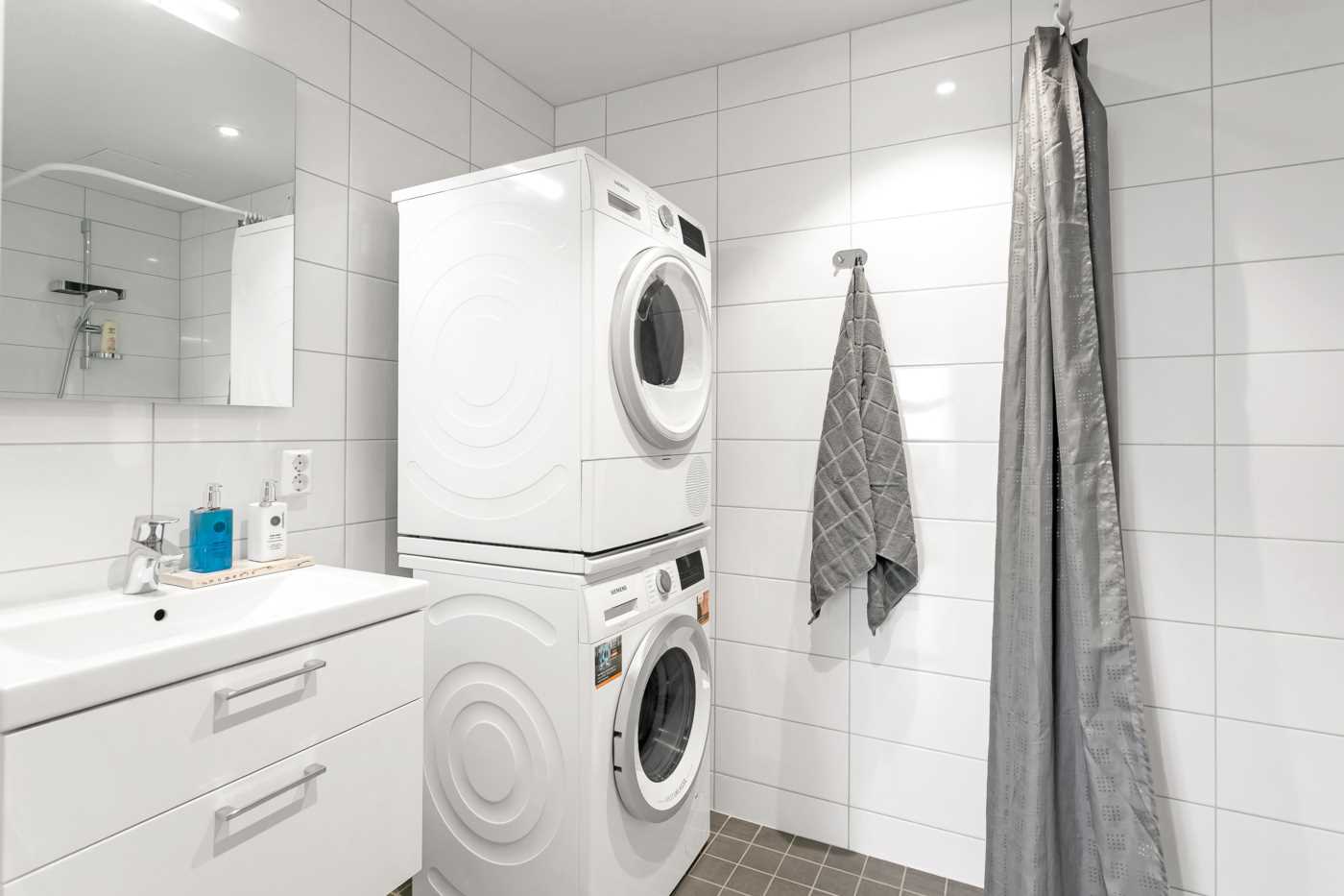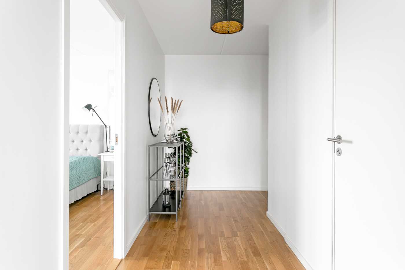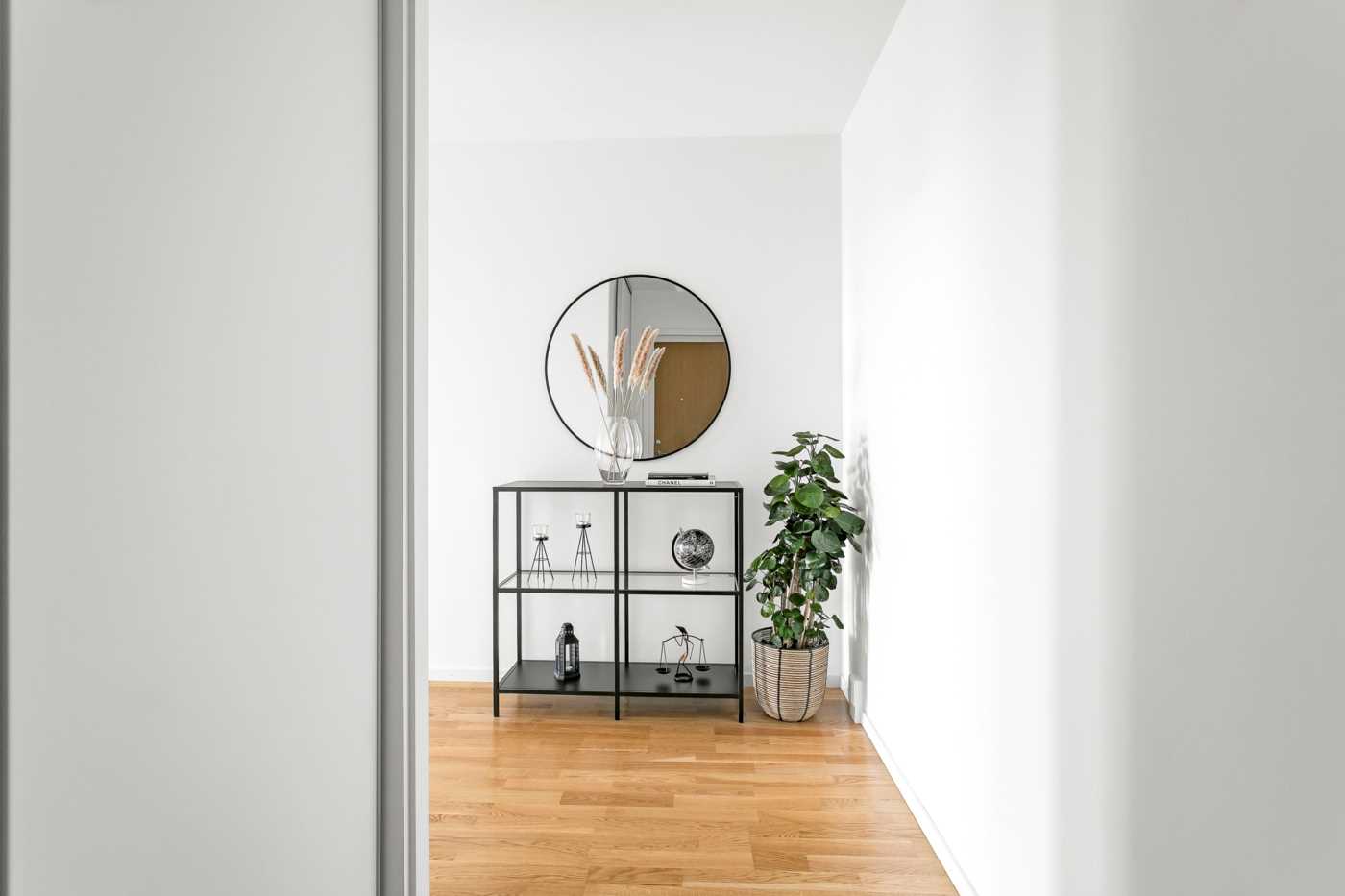 Lägenheten präglas av en modern och stilren design med fönster i två väderstreck som fyller hemmet med naturligt ljus. Det helkaklade badrummet är både smakfullt och funktionellt, utrustat med dusch samt kombinerad tvättmaskin och torktumlare. De vita väggarna och de genomgående parkettgolven skapar en enhetlig, varm och inbjudande atmosfär i hela bostaden.
