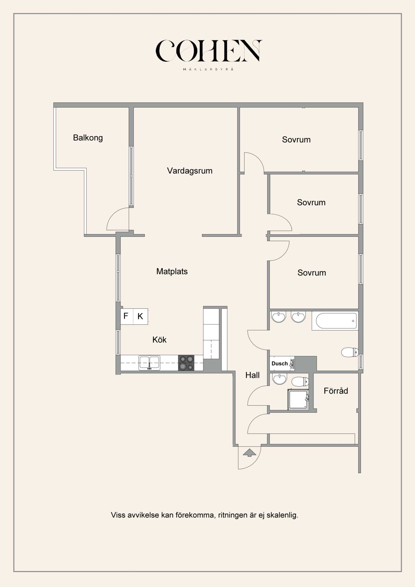 Här erbjuds en smart planlösning med ett rymligt kök och öppet matrum som leder till ett stort vardagsrum. Från vardagsrummet når ni balkongen i bästa solläge vilket passar perfekt för avkoppling och sociala stunder utomhus. I bostaden finns två badrum och fyra sovrum, vilket gör denna lägenheten till den optimala platsen för familjeliv och umgänge.