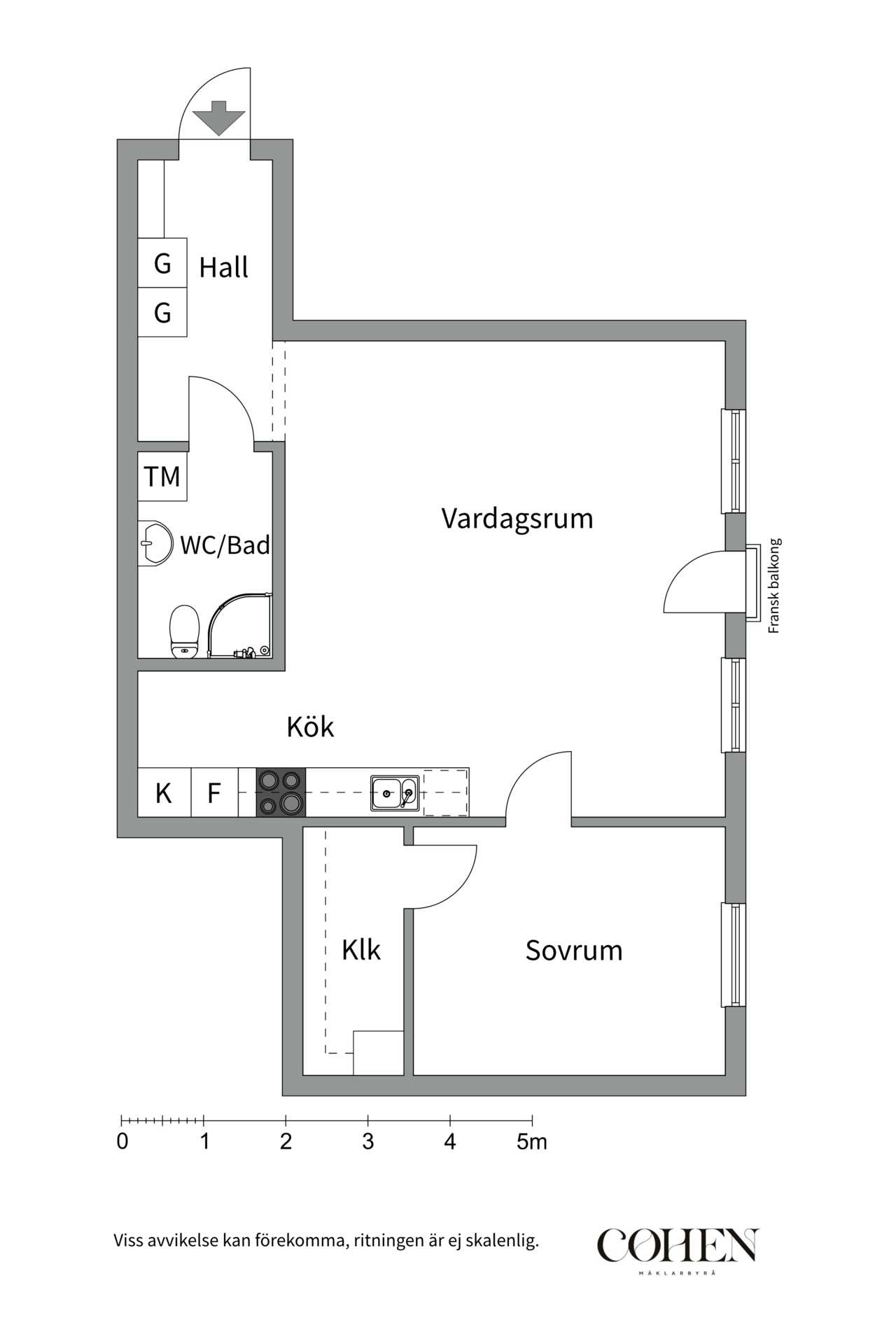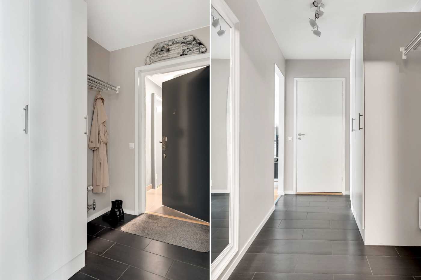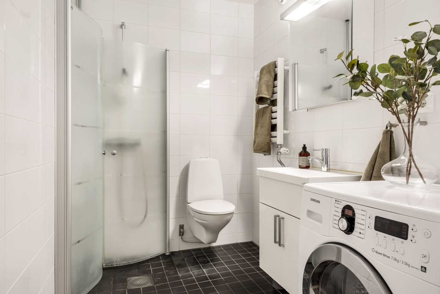 Lägenheten är belägen på våning tre med hiss direkt från markplan. Välkomnande rymlig hall med klinkergolv och gott om garderober. Rymligt helkaklat badrum med dusch och tvättmaskin, handfat med kommod. Ljust trevligt vardagsrum med parkettgolv, stora fönsterpartier och fransk balkong. Här ryms både soffgrupp och middagsbord. Köket, med vit skåpinredning, är fullt utrustat med ugn och micro i arbetshöjd, integrerad diskmaskin, kyl och frys. Kökets öppna placeringen mot vardagsrummet ger en trivsam social planlösning. Mysigt sovrum i sober mörk ton och heltäckande matta. Walk in closet med direktaccess från sovrummet.