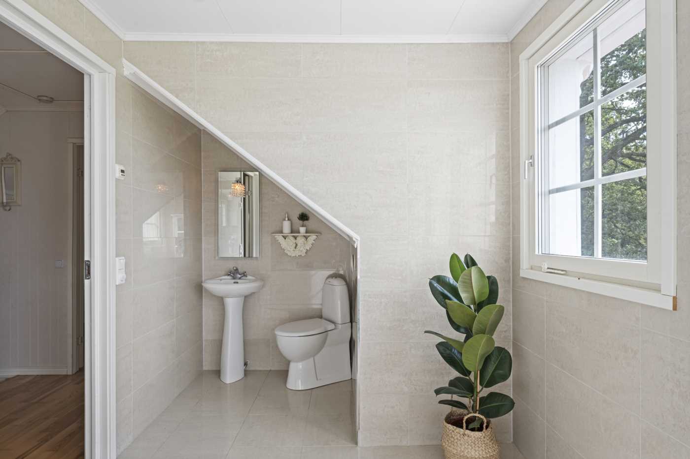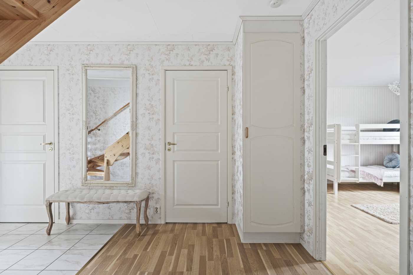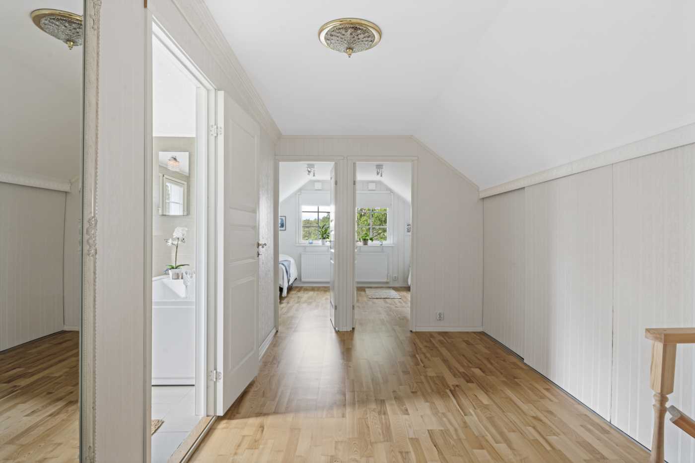 Från hallen leder en trappa upp till det övre planet och allrummet med generöst med förvaring bakom skjutdörrar i kattvinden. Ljust randig tapet och parkettgolv.