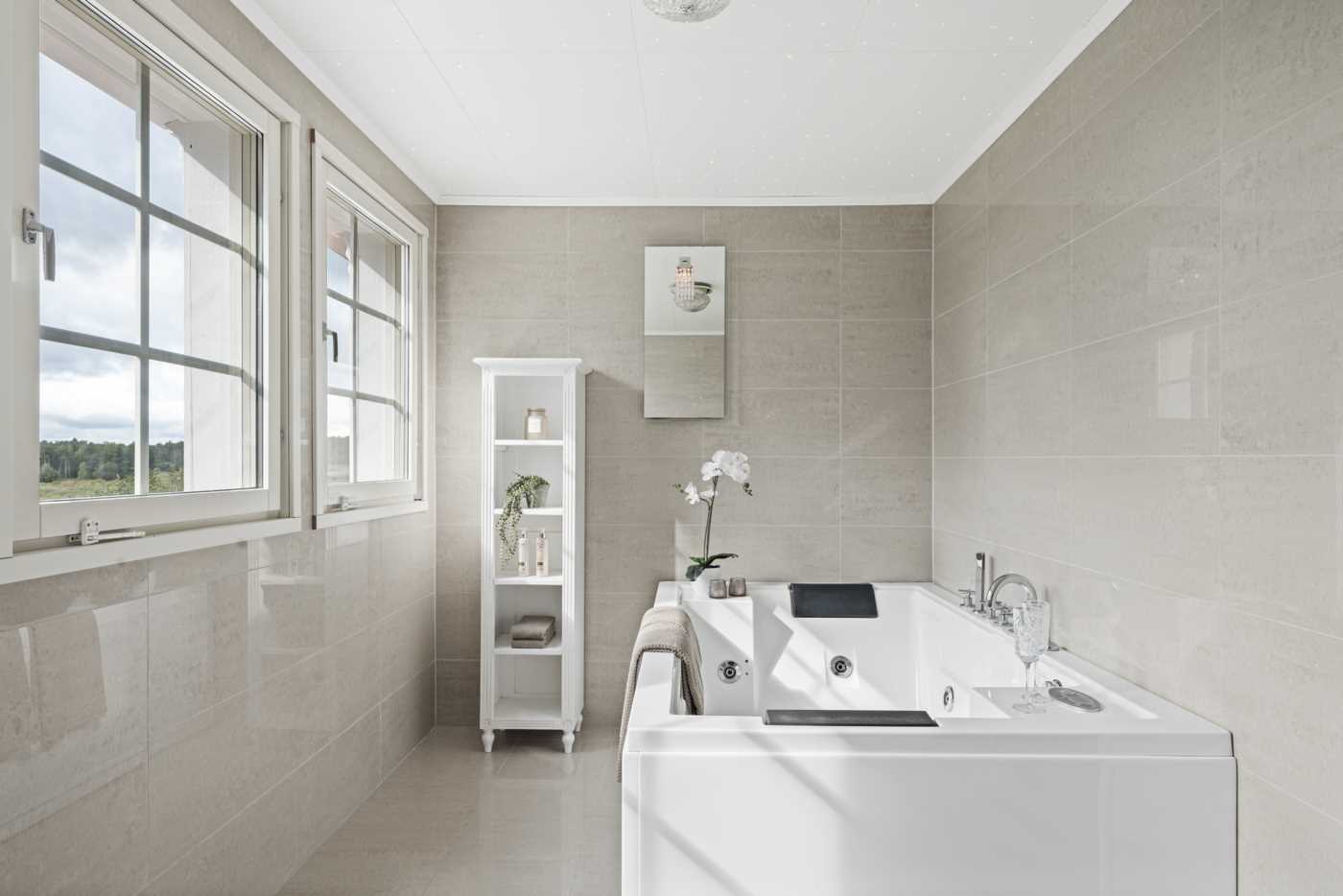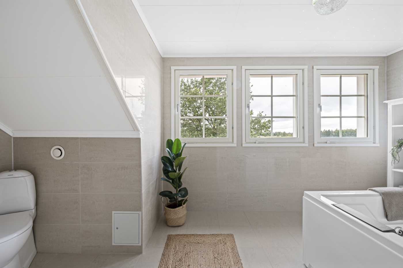 Helkaklat badrum med fint ljusinsläpp via tre fönster i takkupa. Här finns ett spabad med plats för 2 personer, spegel ovan tvättställ och wc. Badrummet har stjärnhimmel i taket och elburen golvvärme.
