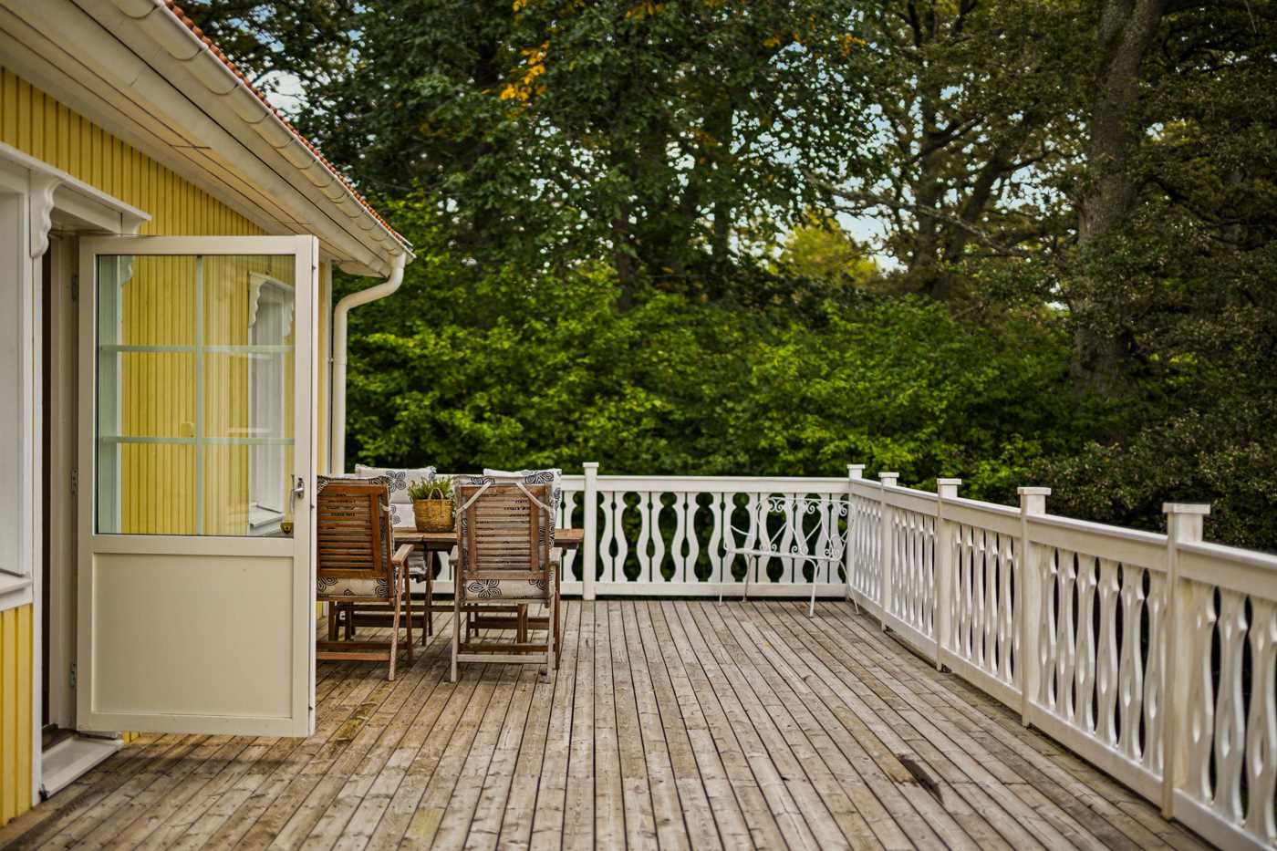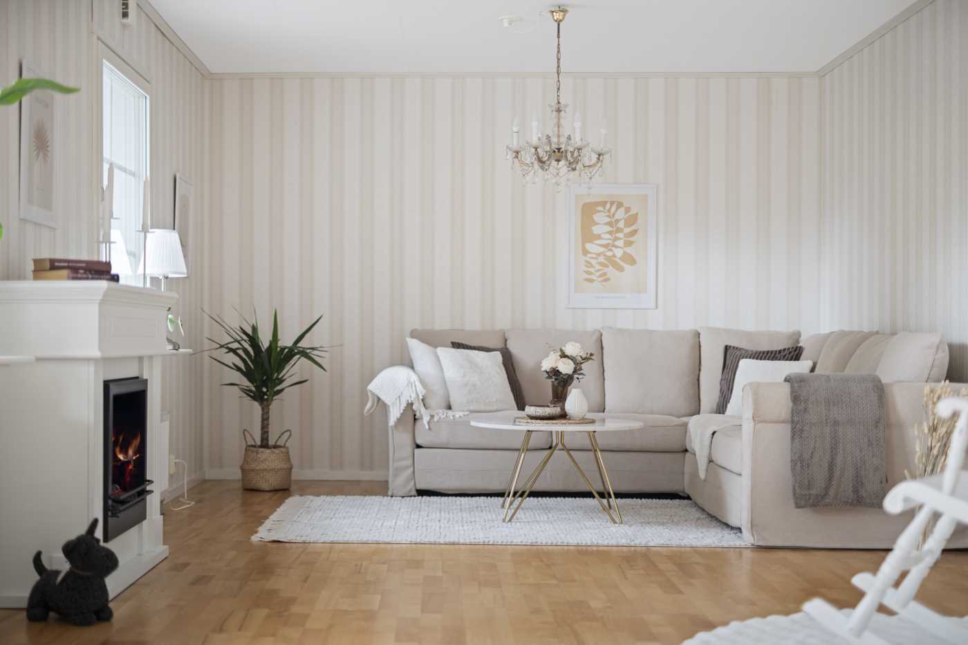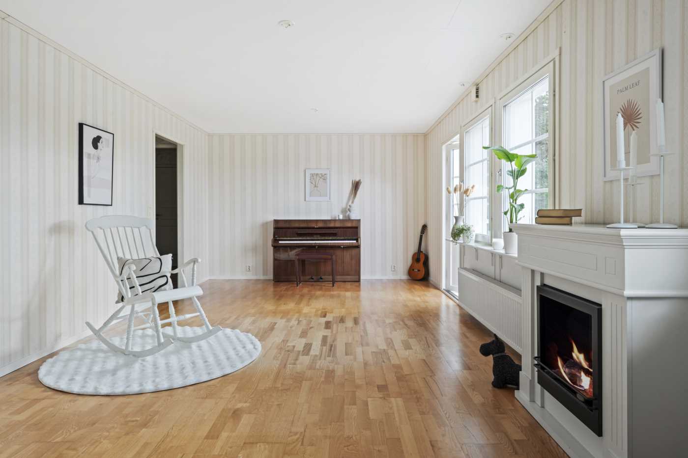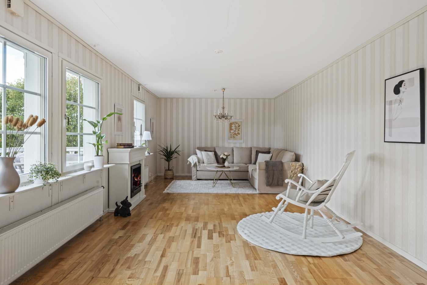 Rymligt vardagsrum med fint ljusinsläpp via tre fönster och en halvglasad altandörr som leder ut till det generösa trädäcket. Vardagsrummet har plats både för soffgrupp och matgrupp eller annat möblemang. Ljust randig tapet och parkettgolv. För den som önskar ytterligare ett rum finns möjlighet att dela av vardagsrummet.