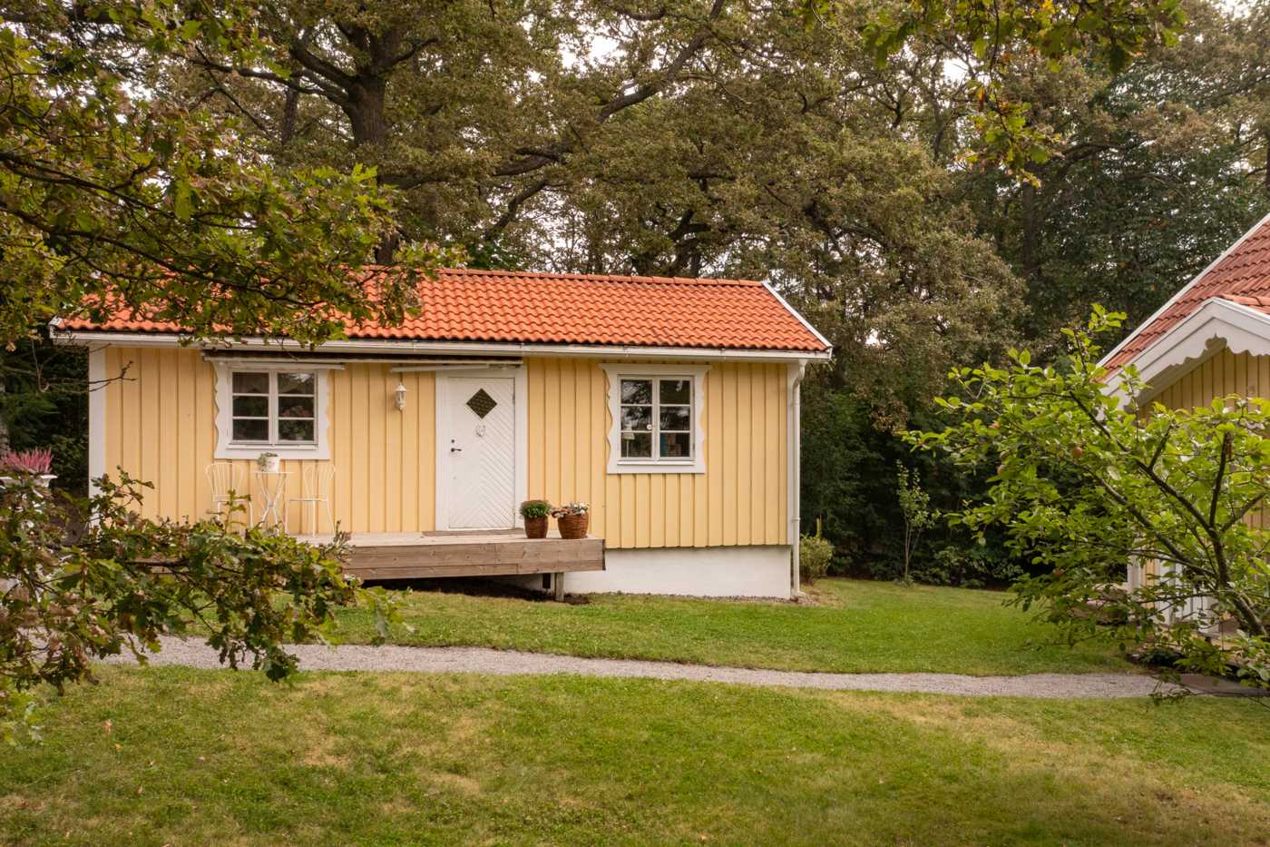 Entrén till gästrummet sker via en altan. Rummet har ljusinsläpp via två fönsterpartier i två väderstreck, beige väggar ovan bröstpanel i furu och laminatgolv med elburen golvvärme. Här finns ett pentry, observera att det inte är anslutet till V/A.