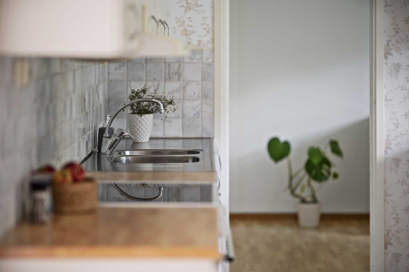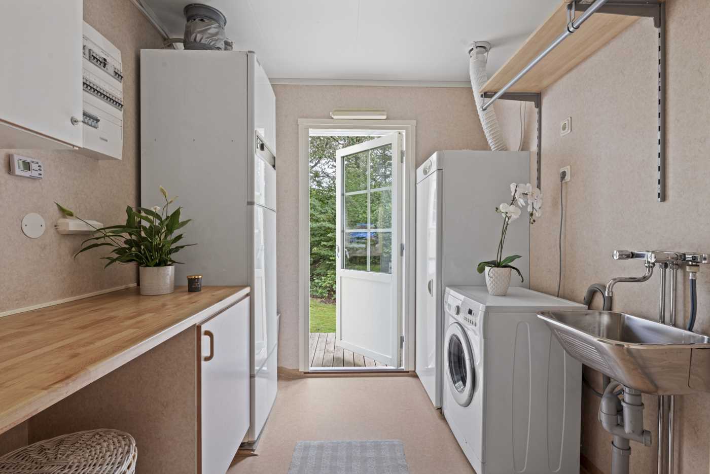 Tvättstuga med våtrumsmatta på golv och våtrumstapet på väggar. Här finns en tvättho, tvättmaskin och torkskåp, praktisk arbetsbänk samt förvaring i ett över- och ett underskåp. Husets frånluftsvärmepump finns även här. Från tvättstugan leder en halvglasad altandörr till husets gavel och trädäcket.