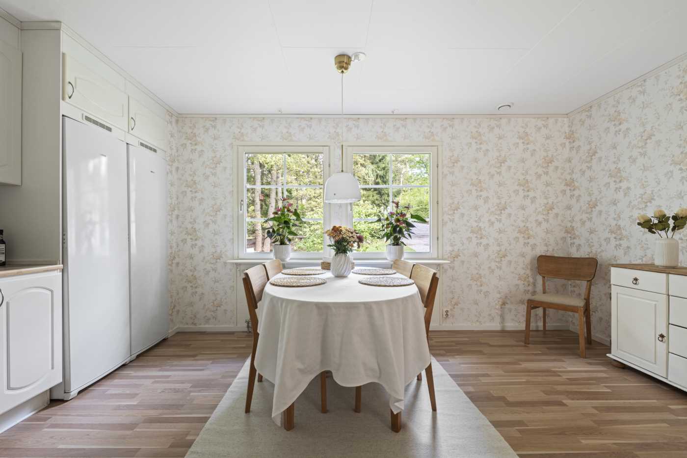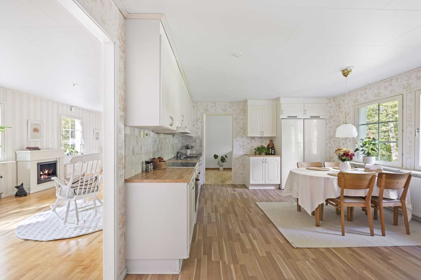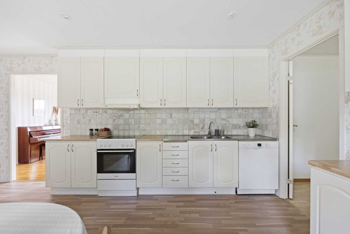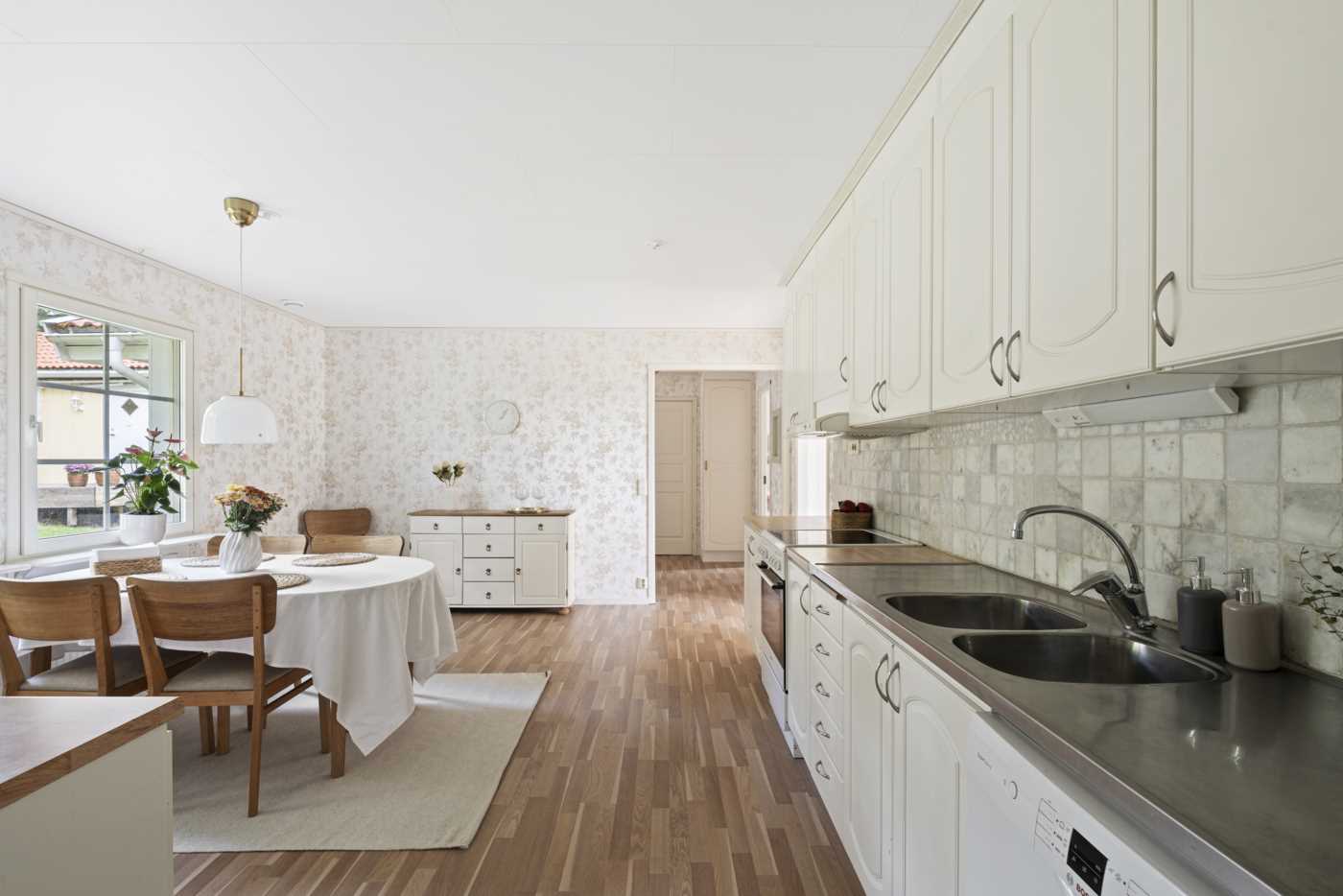 Stort kök med skåpinredning med vita luckor och kakel ovan arbetsbänkar. Köket har plats för större matgrupp framför dubbla fönster med vy mot entrésidan, här finns även möjlighet att addera ytterligare skåpinredning eller annan möblering. Ljust mönstrad tapet och laminatgolv.