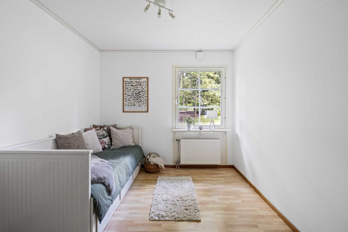 Med ingång från köket nås entréplanets andra sovrum med ett fönster mot entrésidan, en dubbelgarderob och vitmålade väggar samt vinylgolv.