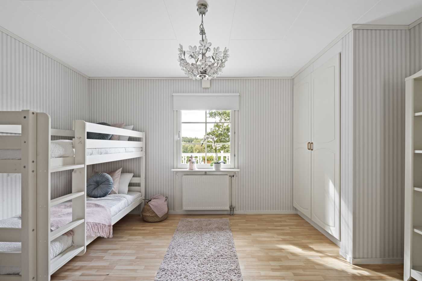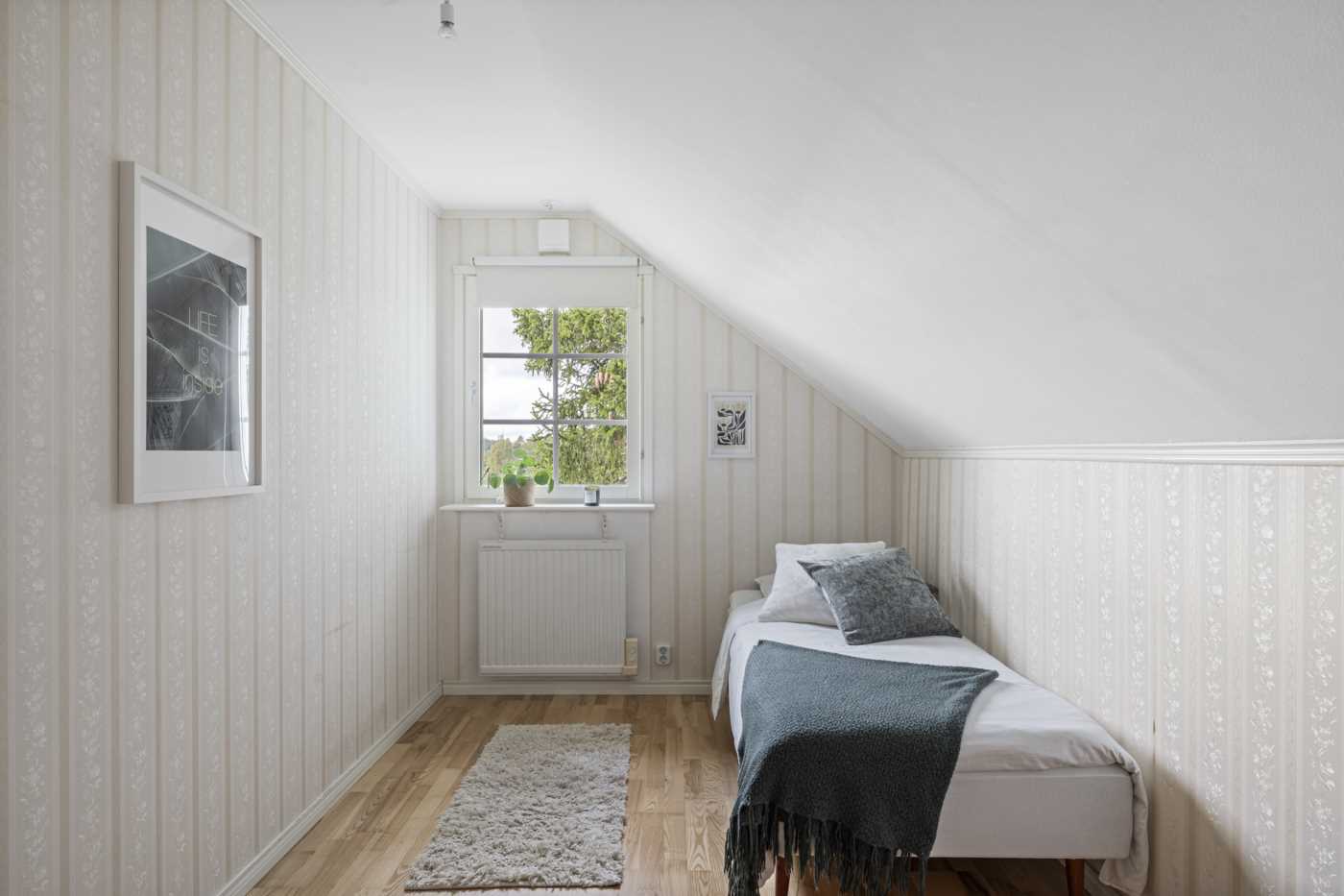 Sovrum med ett gavelfönster, ljust randig tapet och parkettgolv.