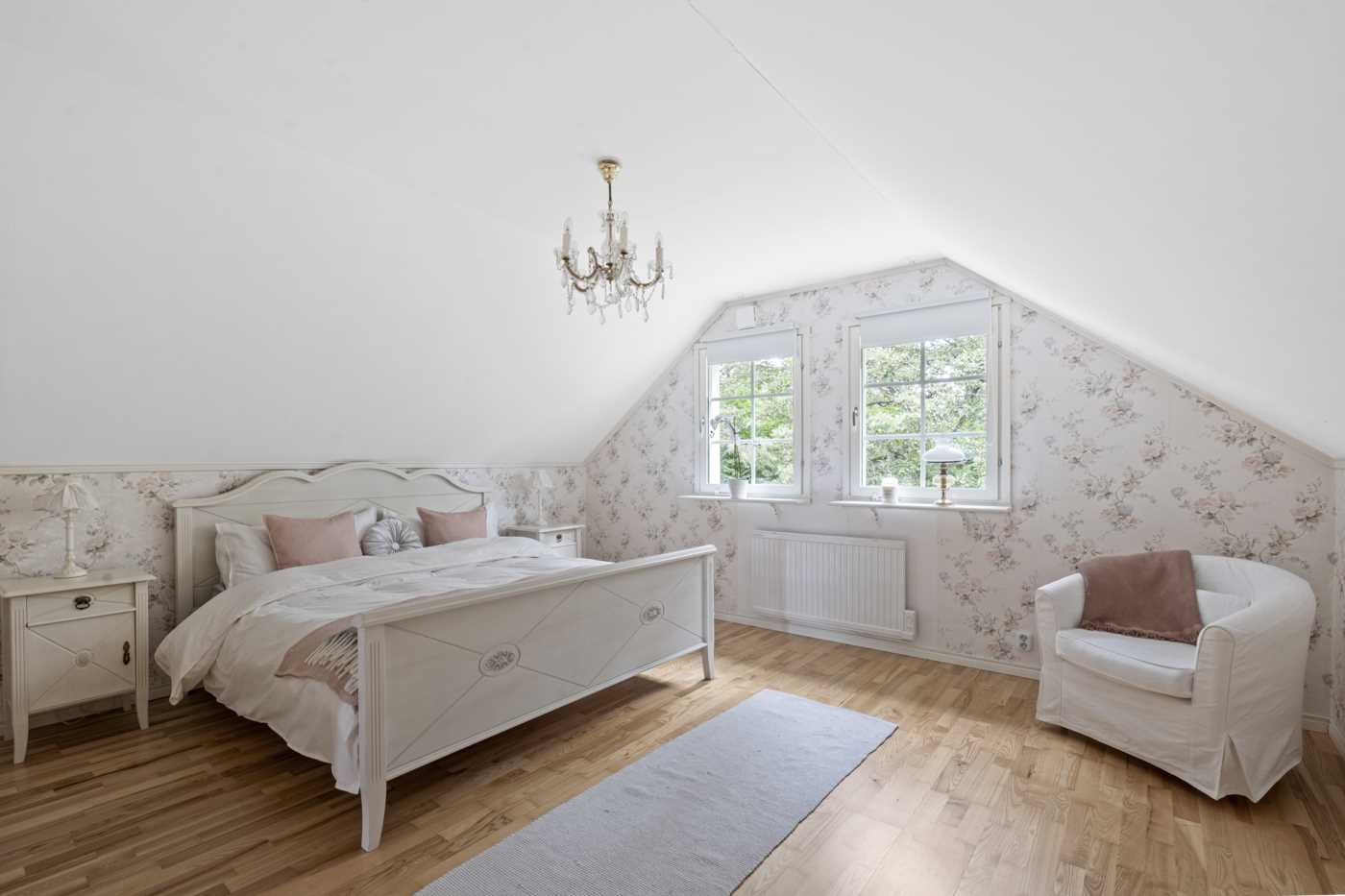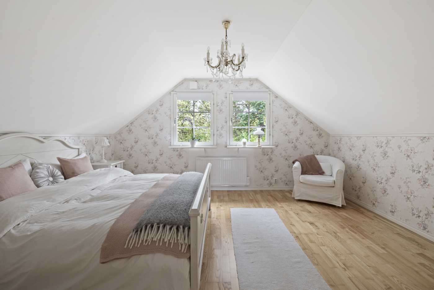 Stort sovrum med två gavelfönster och plats för både dubbelsäng och ytterligare möbler. Ljust mönstrad tapet och parkettgolv.