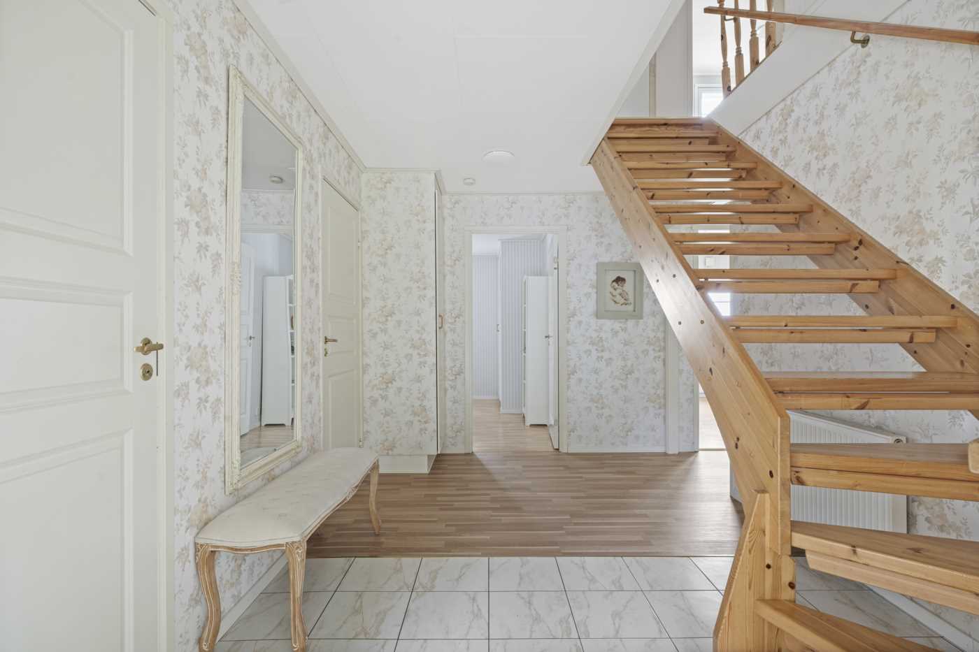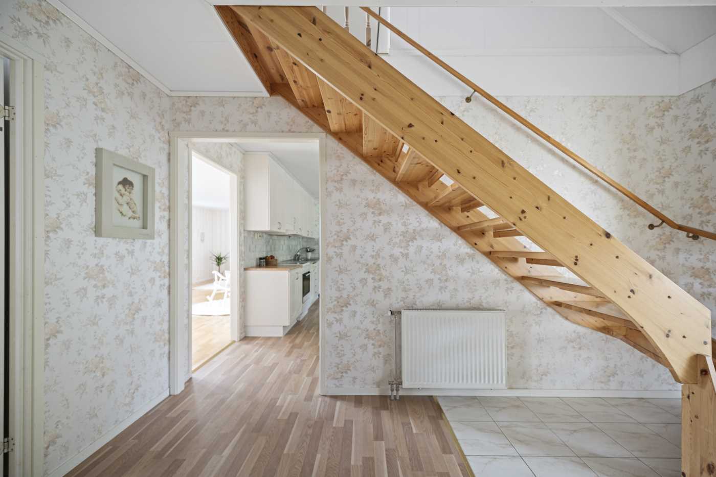 Entré via farstukvist med skyddande tak. Hallen har praktisk klinker innanför dörren som övergår i laminatgolv och ljust mönstrad tapet. Här finns en garderob och plats för byrå eller liknande förvaring under trappan som leder till det övre planet.