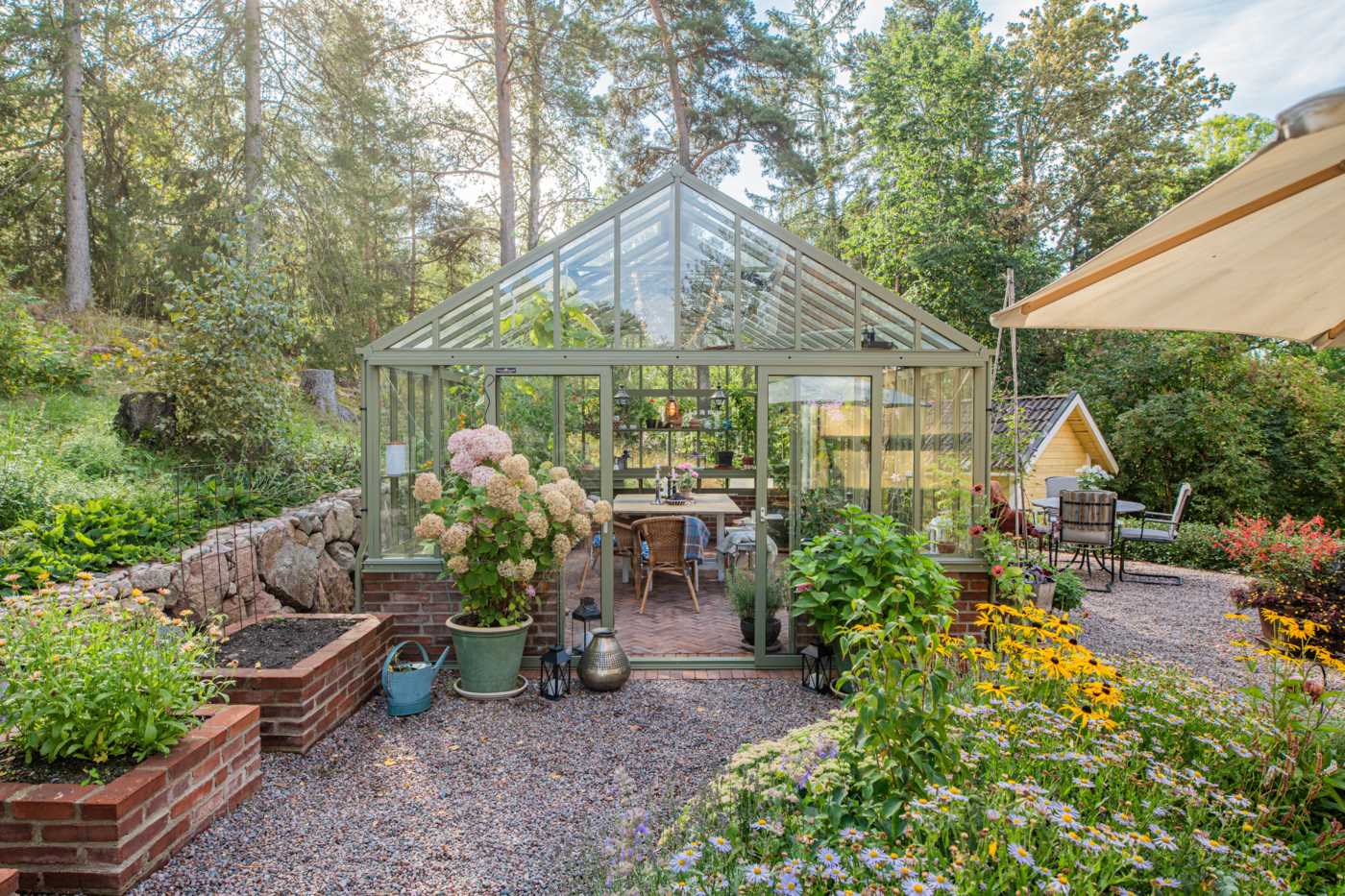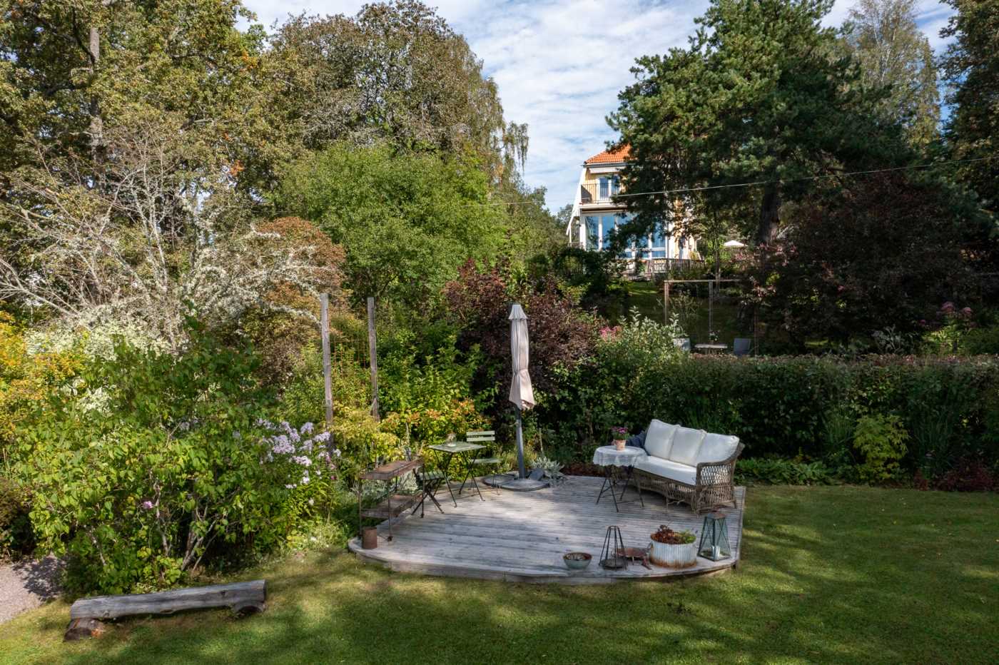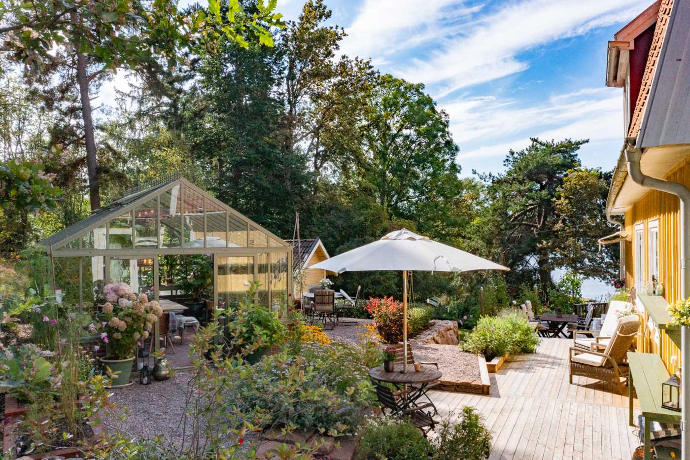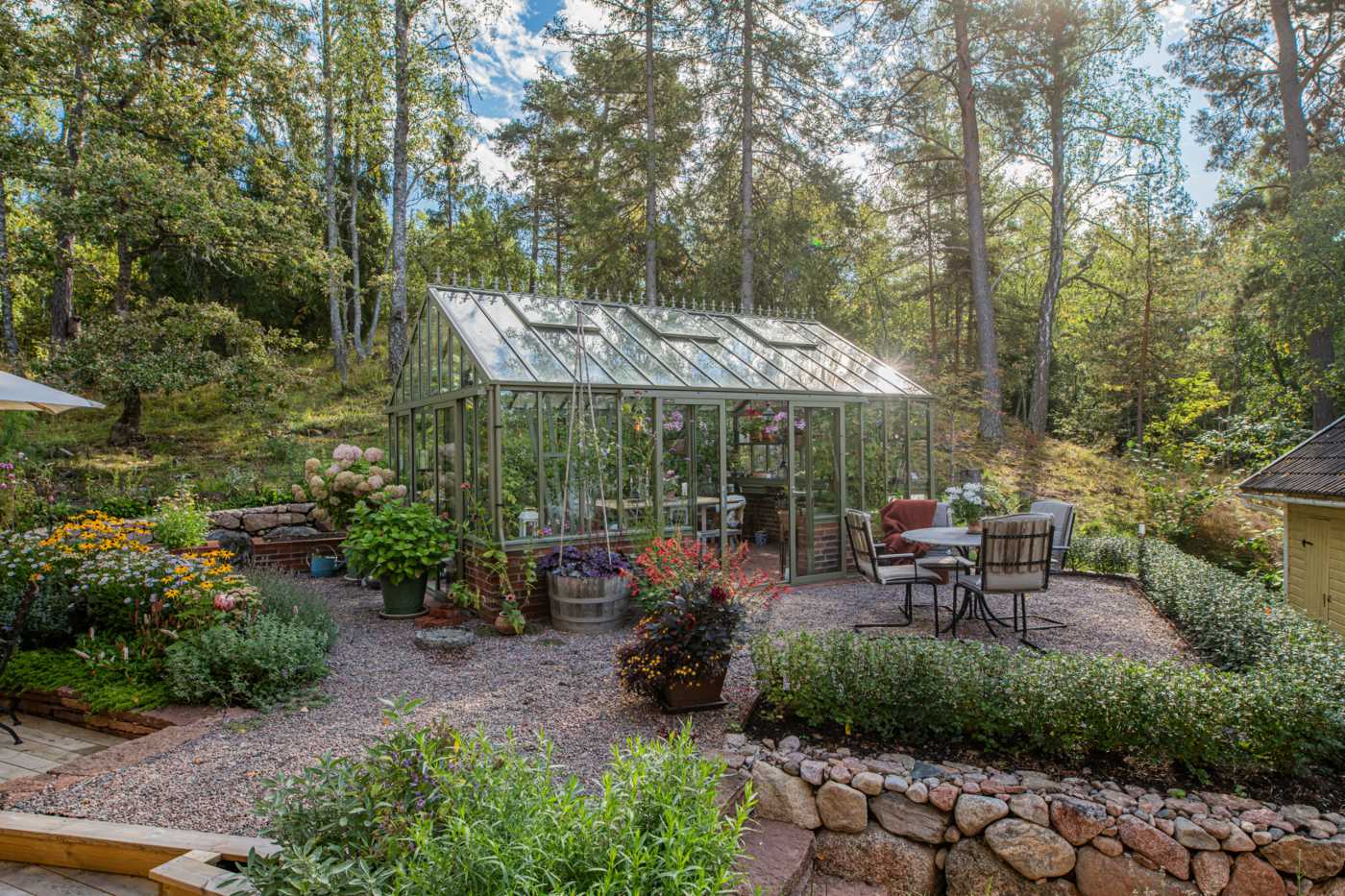 Den stora tomten erbjuder både en parkliknade trädgård med vackra träd, buskar och perenner och en egen skogsbacke med både lingon, blåbär och kantareller. För den odlingsintresserade finns här förutom det vackra växthuset även ett trädgårdslandland med planteringslådor på fastighetens nedre etage. Här finns även bärbuskar och fruktträd och härliga gräsytor nära vattenspegeln och den egna sandstranden.