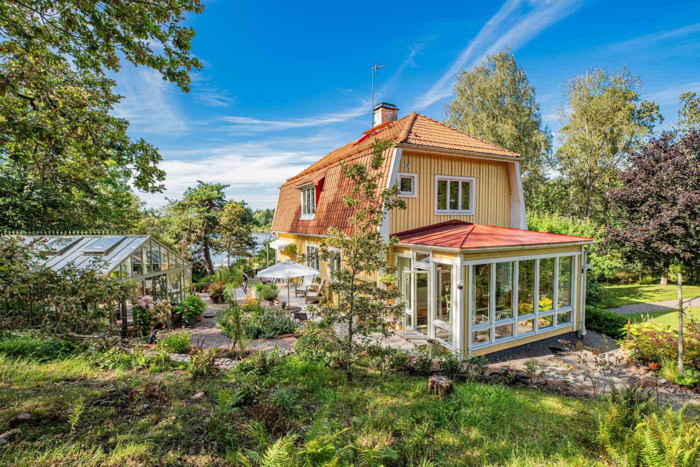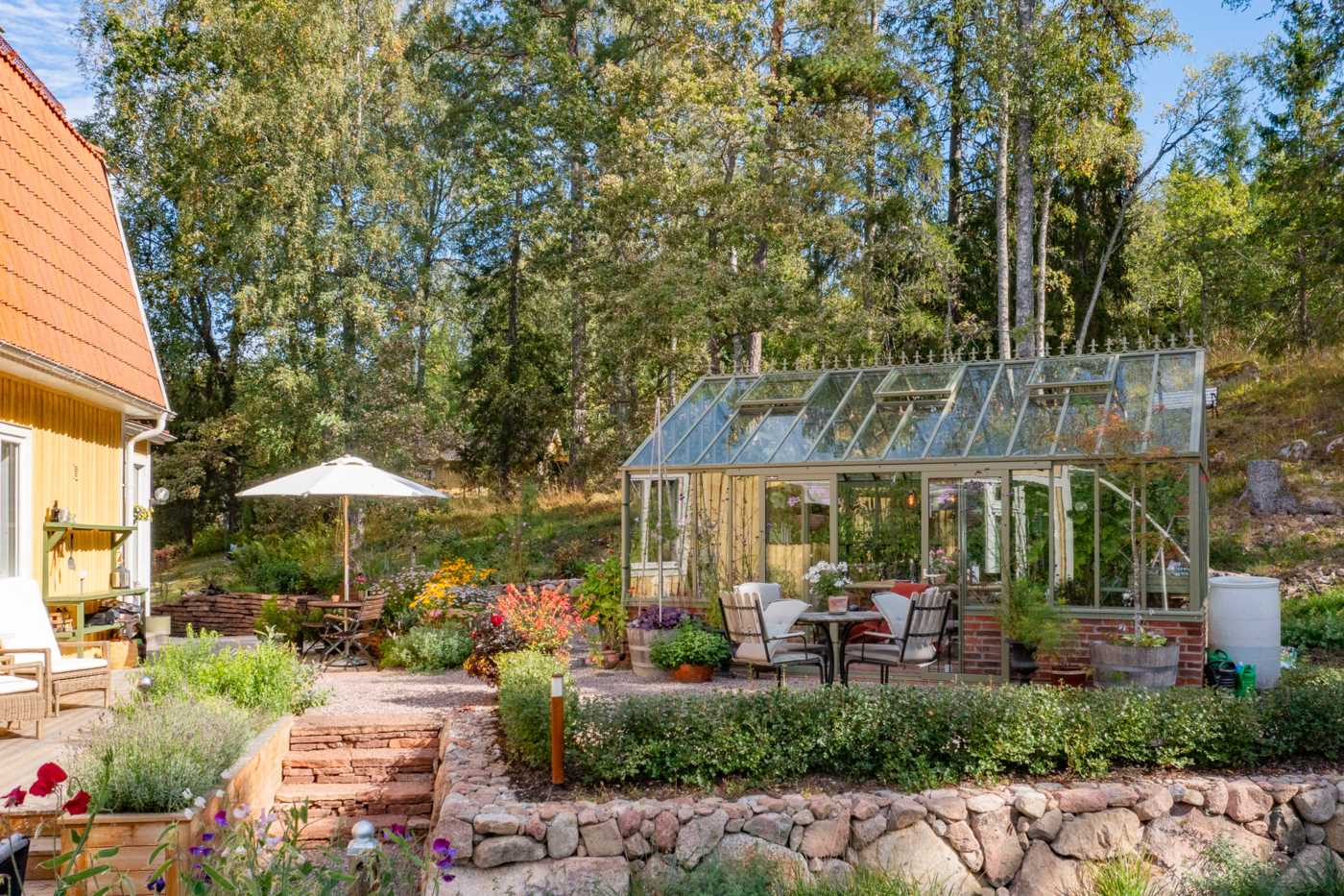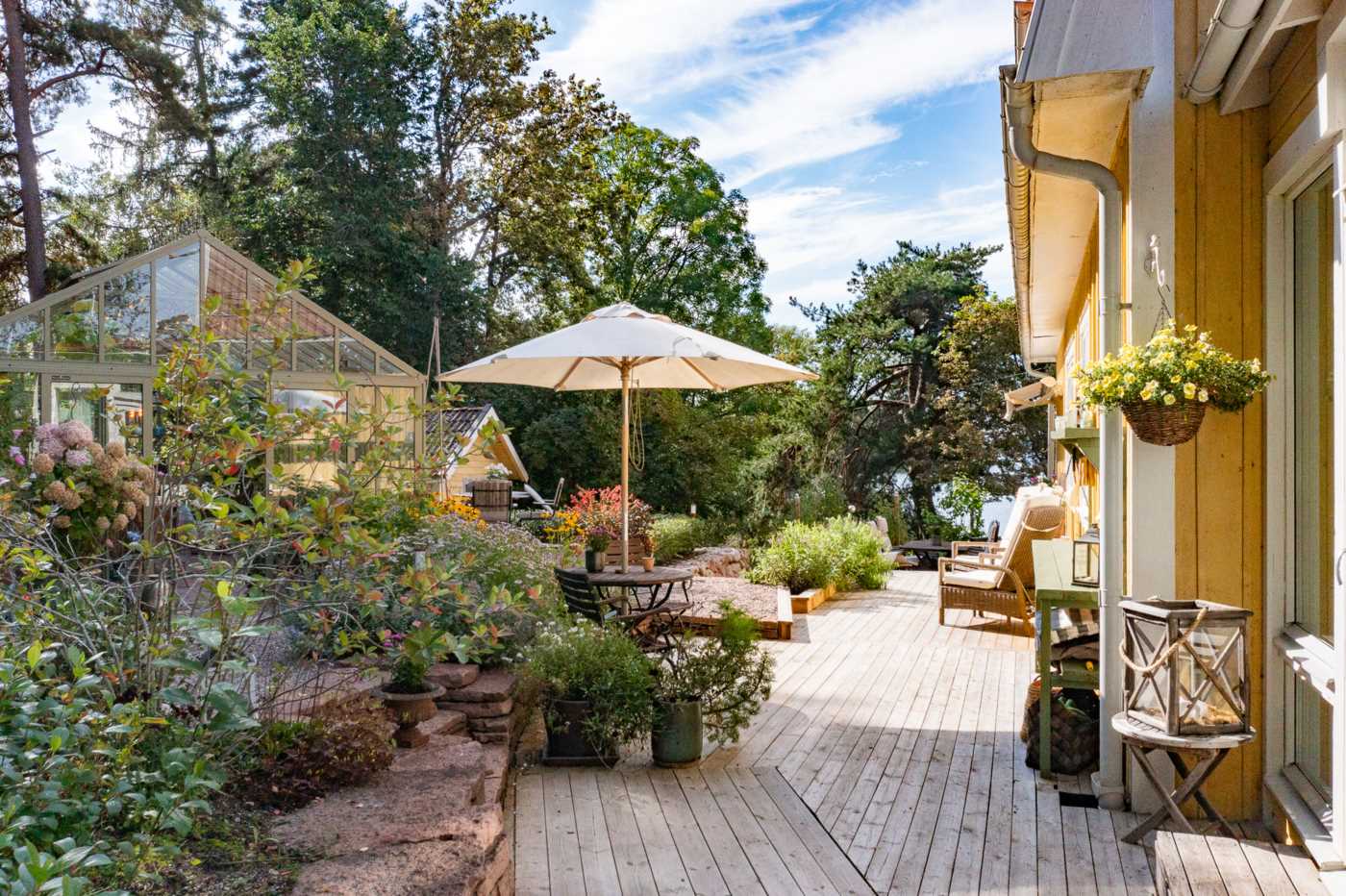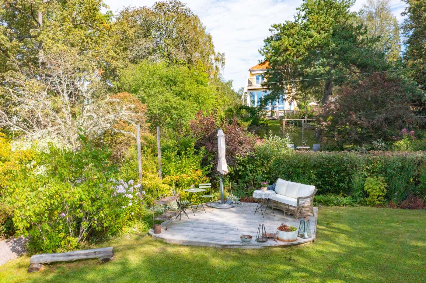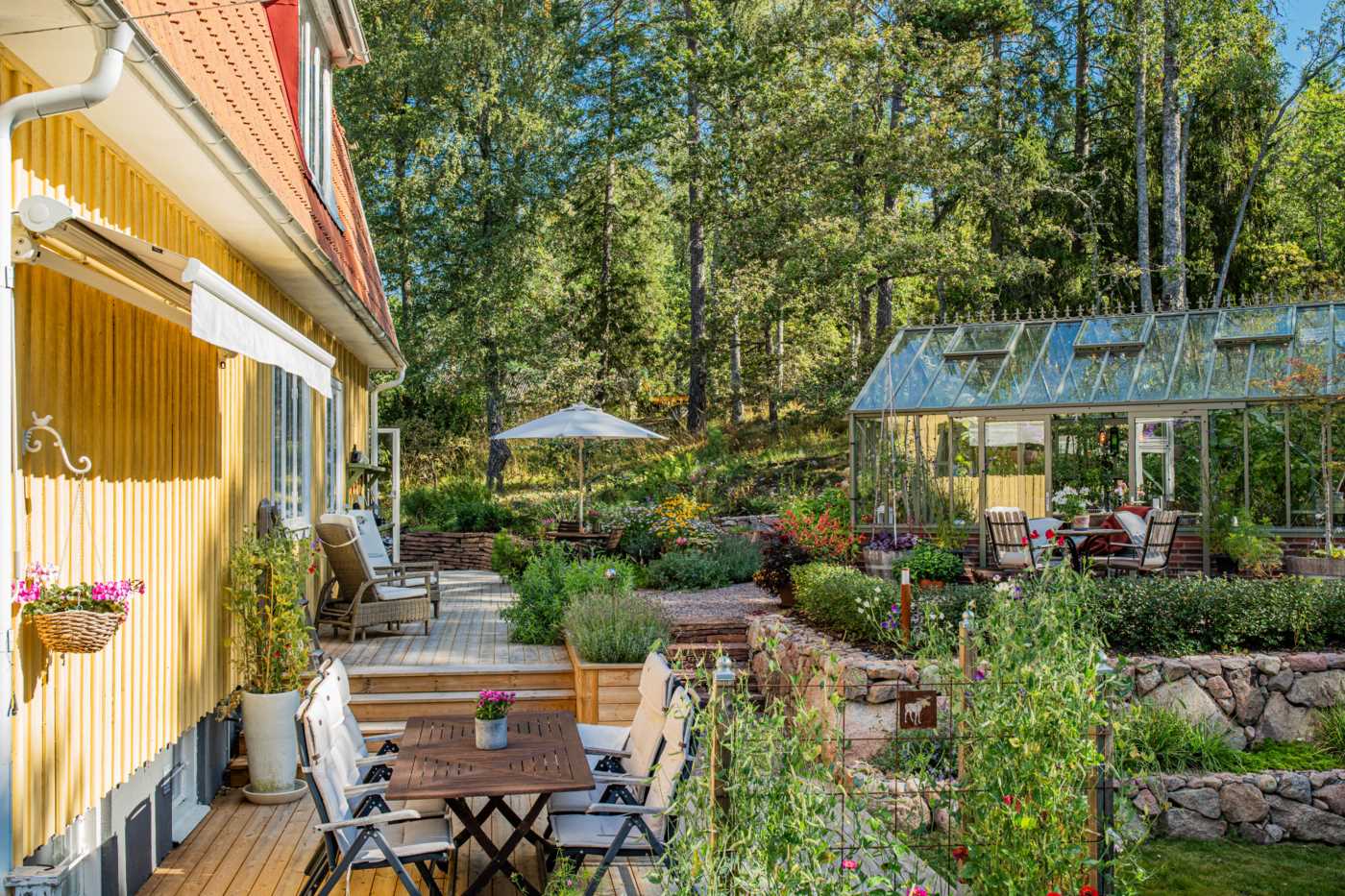 Den stora tomten erbjuder både en parkliknade trädgård med vackra träd, buskar och perenner och en egen skogsbacke med både lingon, blåbär och kantareller. För den odlingsintresserade finns här förutom det vackra växthuset även ett trädgårdslandland med planteringslådor på fastighetens nedre etage. Här finns även bärbuskar och fruktträd och härliga gräsytor nära vattenspegeln och den egna sandstranden.