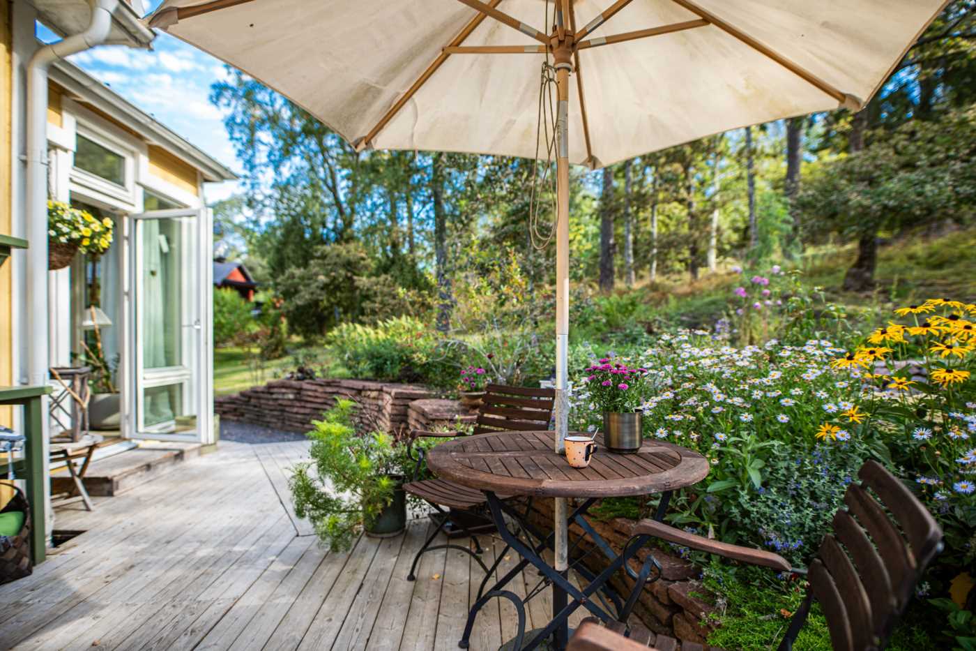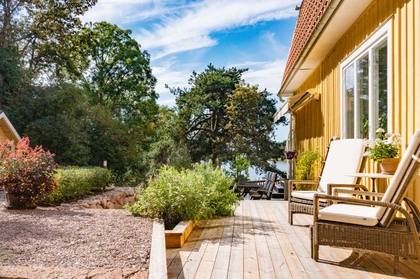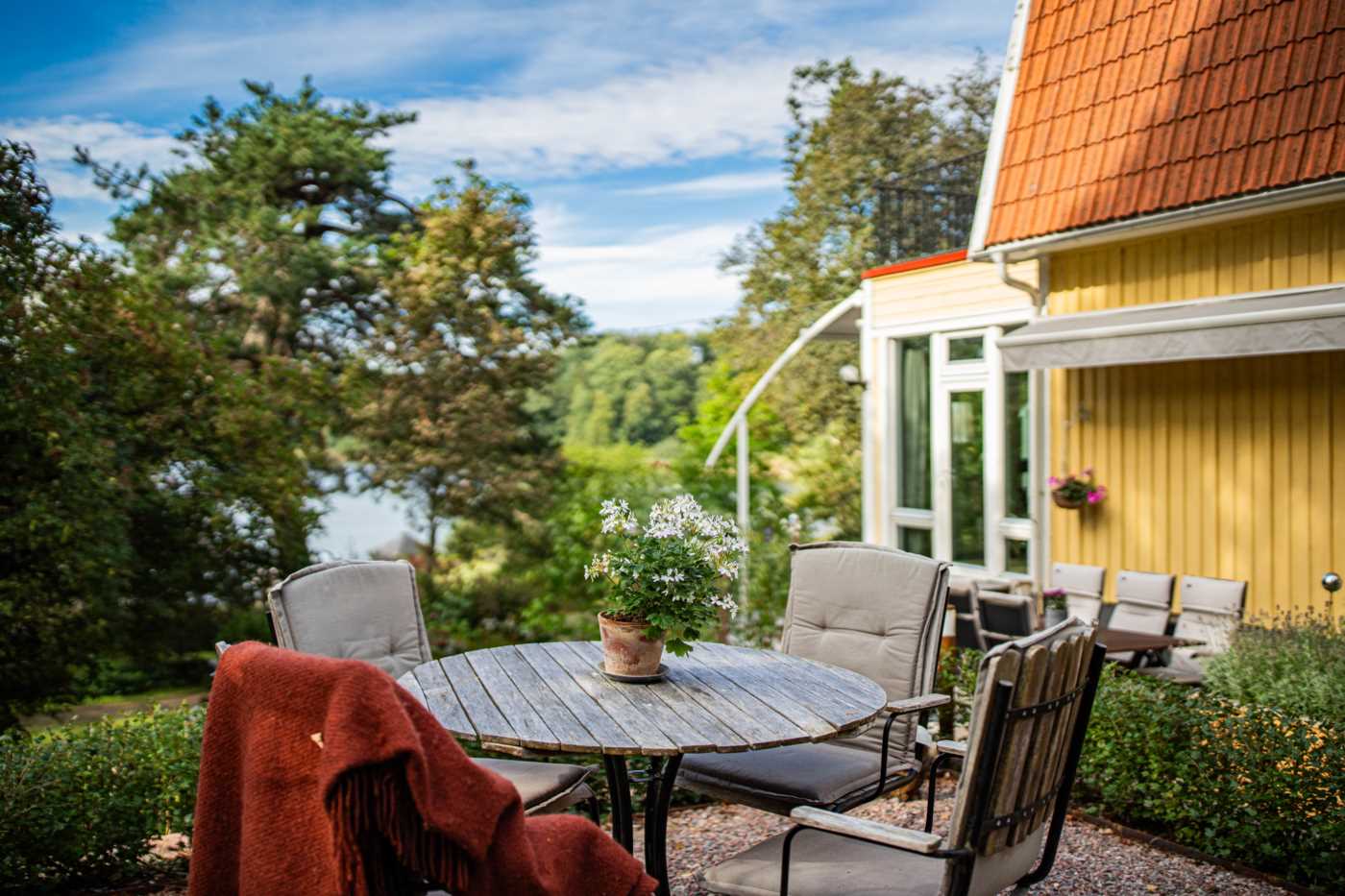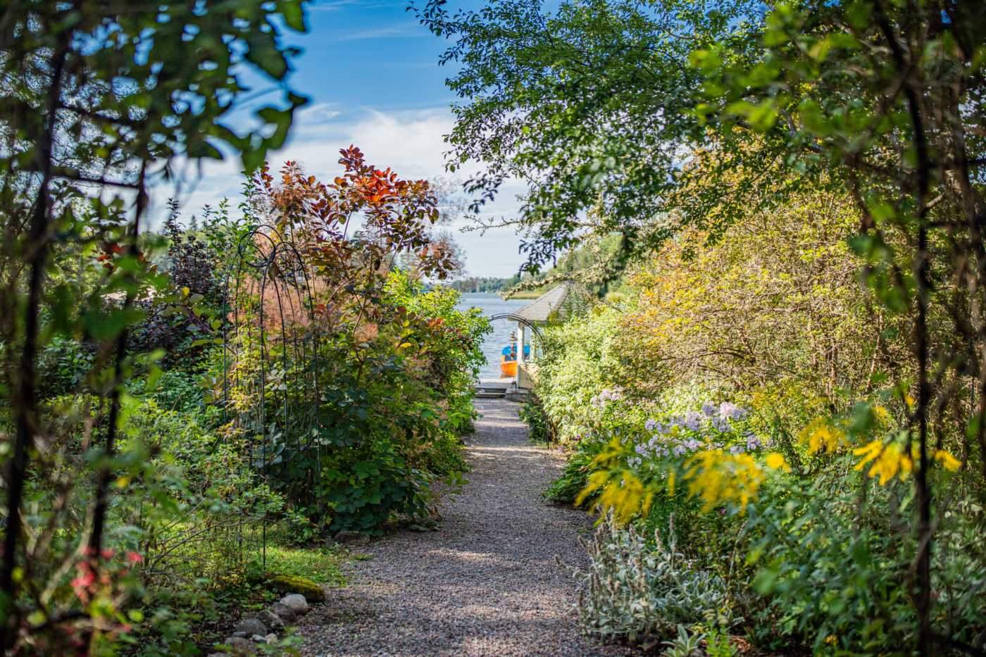 Den stora tomten erbjuder både en parkliknade trädgård med vackra träd, buskar och perenner och en egen skogsbacke med både lingon, blåbär och kantareller. För den odlingsintresserade finns här förutom det vackra växthuset även ett trädgårdslandland med planteringslådor på fastighetens nedre etage. Här finns även bärbuskar och fruktträd och härliga gräsytor nära vattenspegeln och den egna sandstranden.