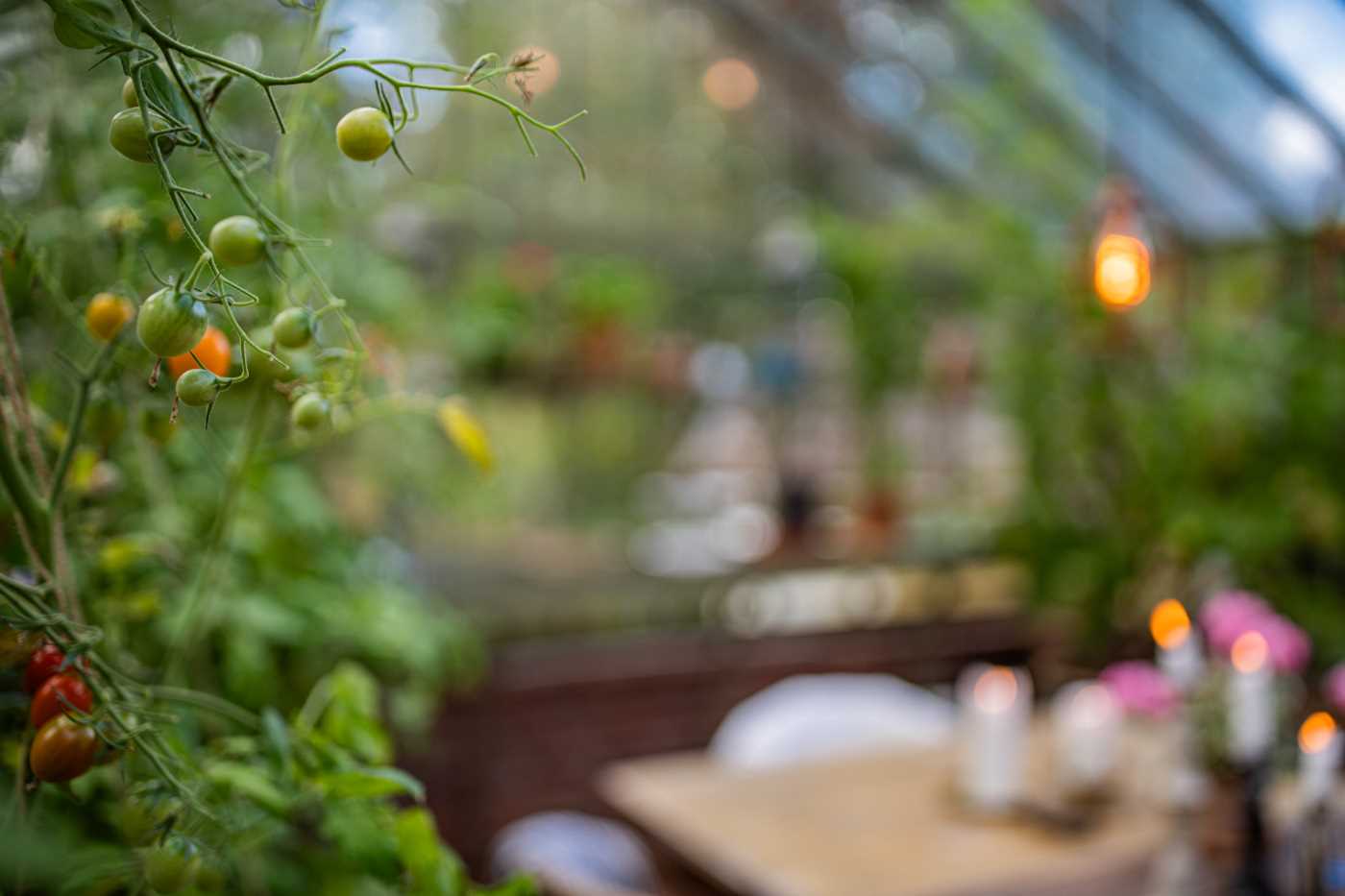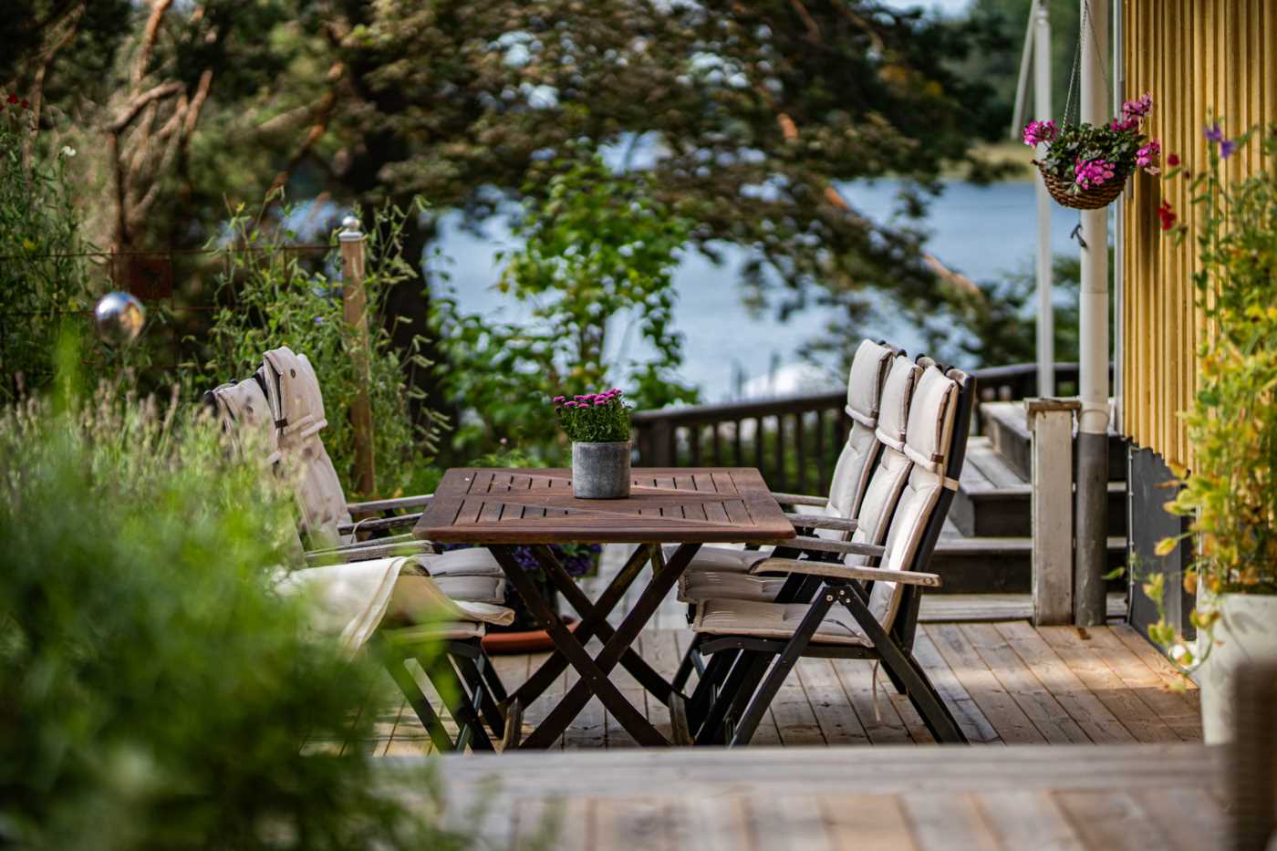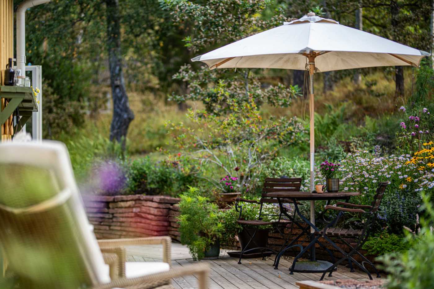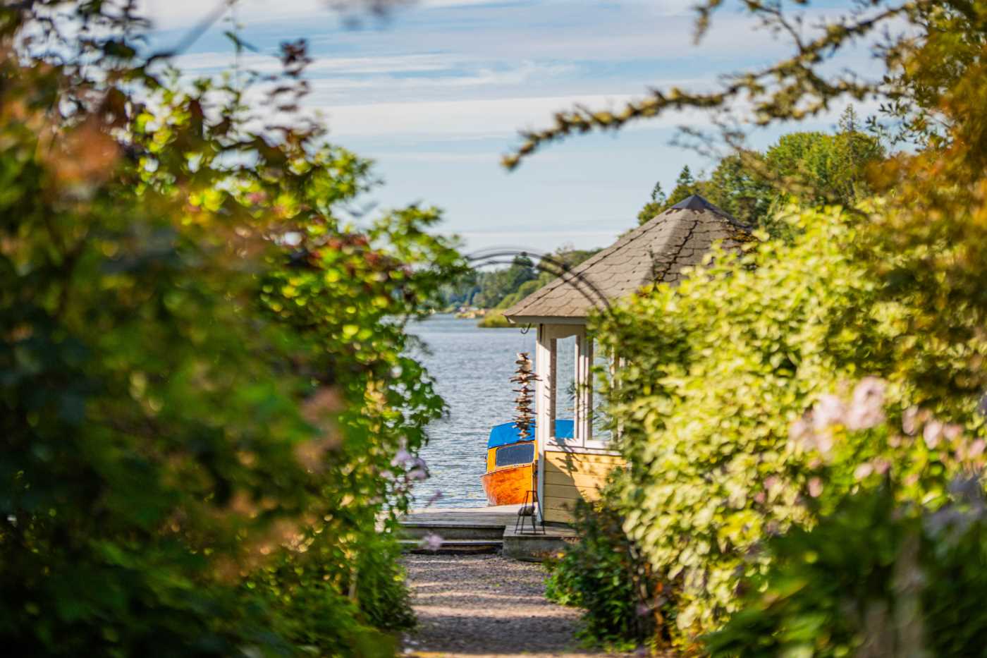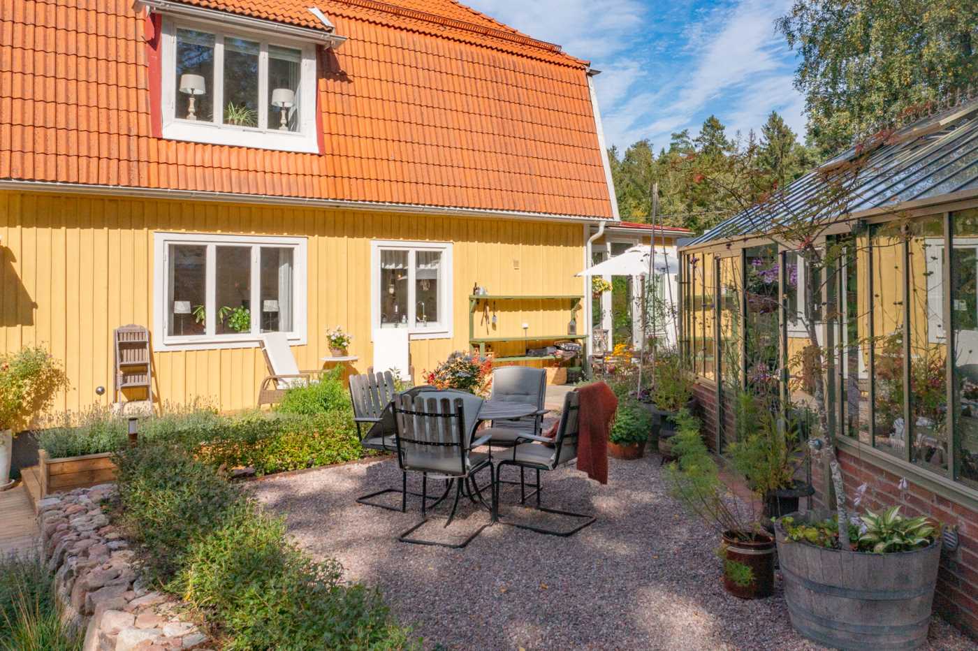 Den stora tomten erbjuder både en parkliknade trädgård med vackra träd, buskar och perenner och en egen skogsbacke med både lingon, blåbär och kantareller. För den odlingsintresserade finns här förutom det vackra växthuset även ett trädgårdslandland med planteringslådor på fastighetens nedre etage. Här finns även bärbuskar och fruktträd och härliga gräsytor nära vattenspegeln och den egna sandstranden.