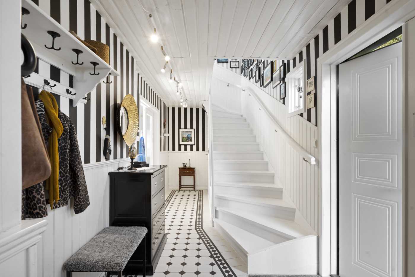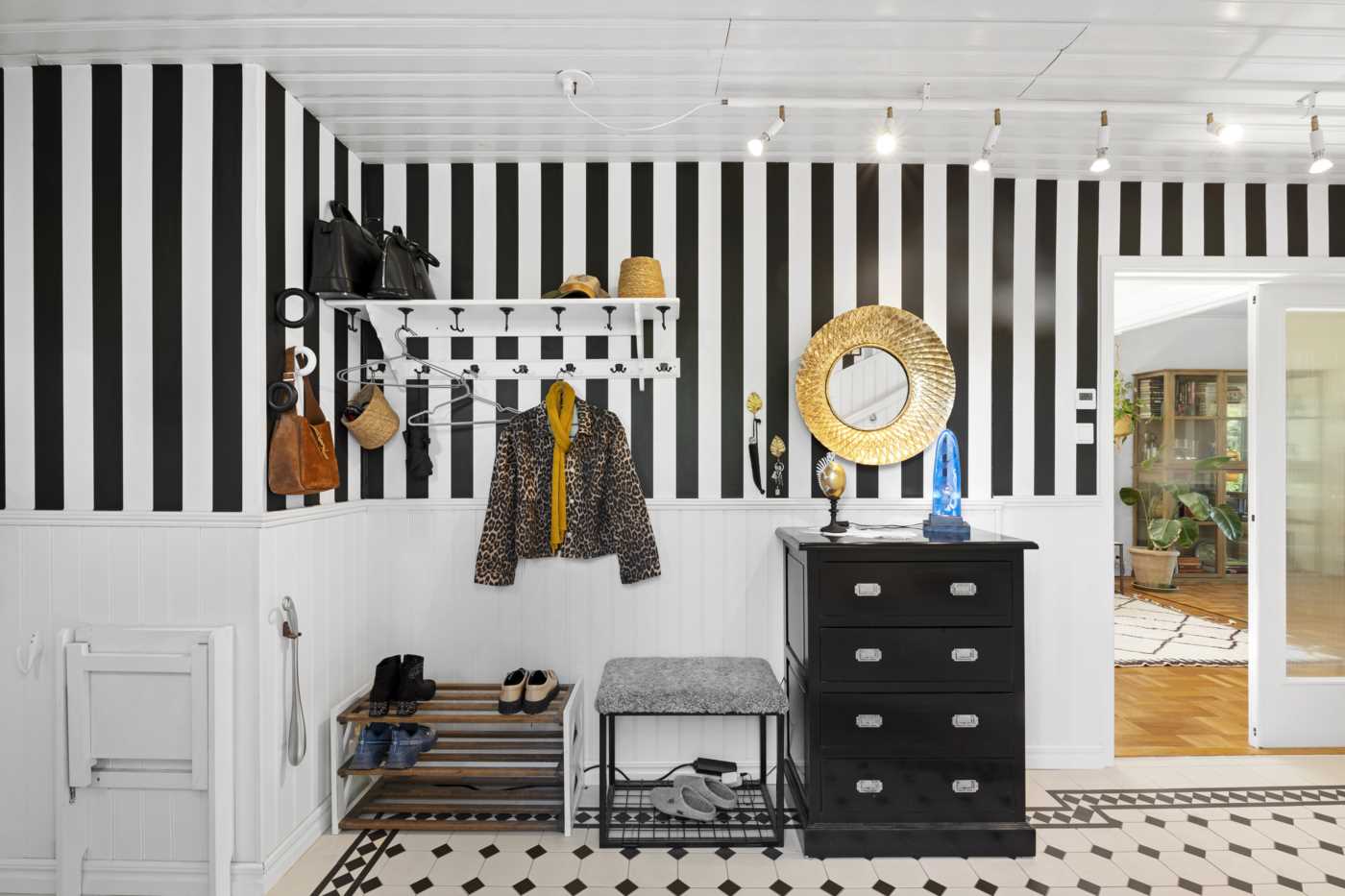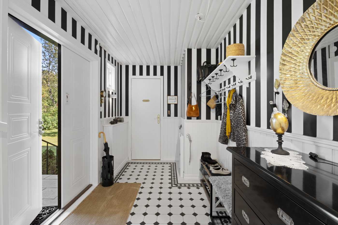 Välkomnande entré via vackra dubbeldörrar, i anslutning till entrén finns plats för ytterkläder i hatthylla. Vackert golv med vattenburen golvvärme och oktagonklinker i klassiskt viktorianskt mönster i svartvitt med matchande svartvit randig tapet från Ralph Lauren ovan vit bröstpanel.
