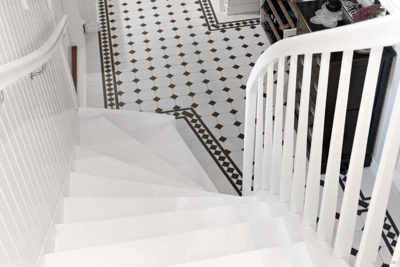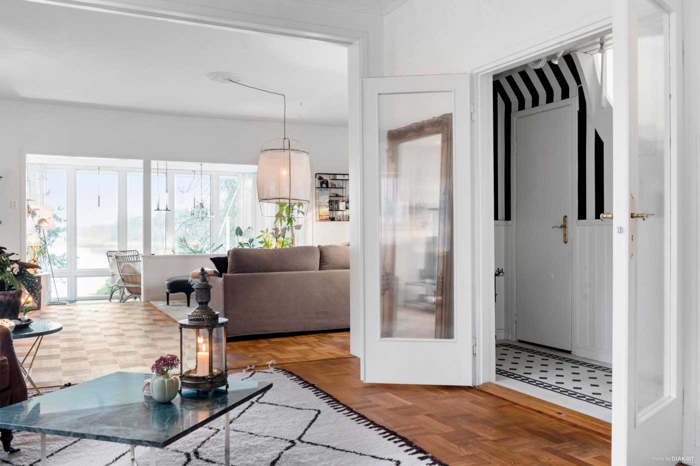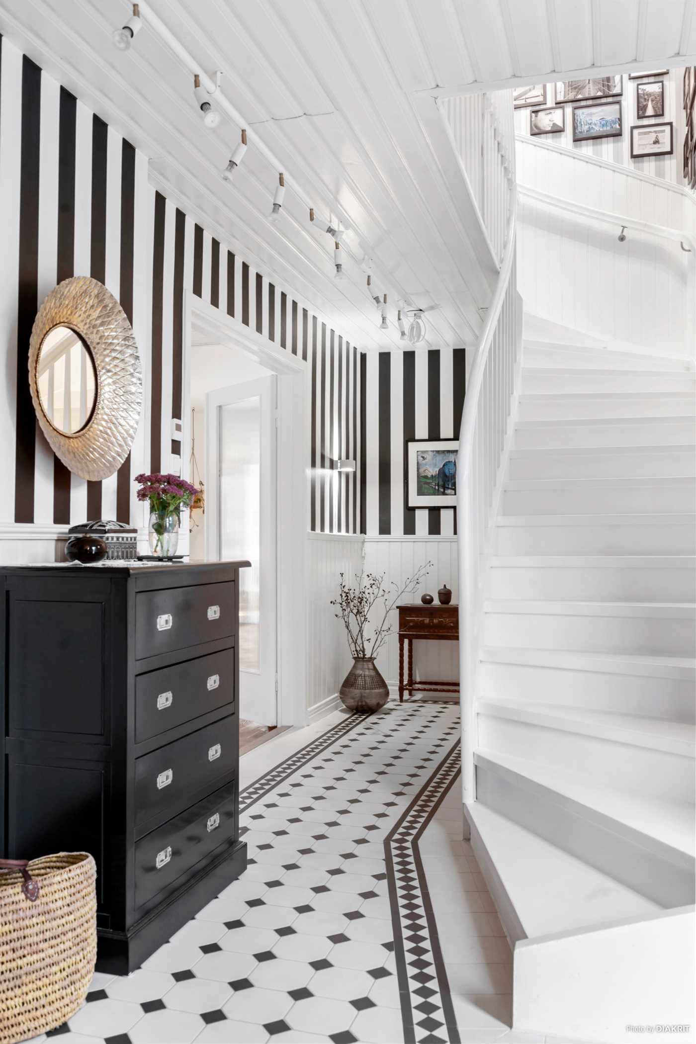 Välkomnande entré via vackra dubbeldörrar, i anslutning till entrén finns plats för ytterkläder i hatthylla. Vackert golv med vattenburen golvvärme och oktagonklinker i klassiskt viktorianskt mönster i svartvitt med matchande svartvit randig tapet från Ralph Lauren ovan vit bröstpanel.