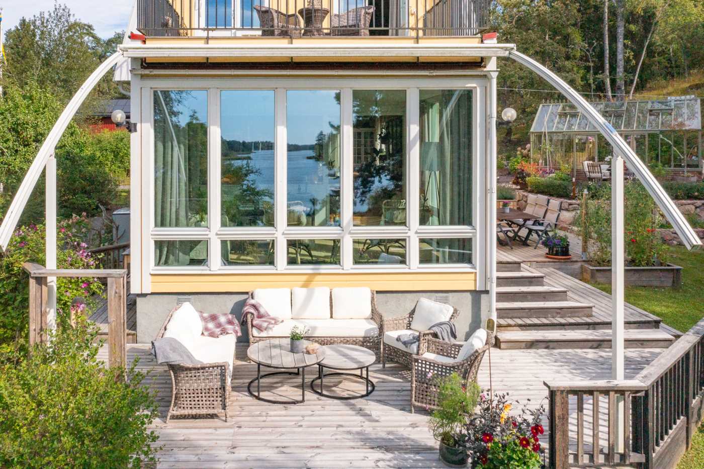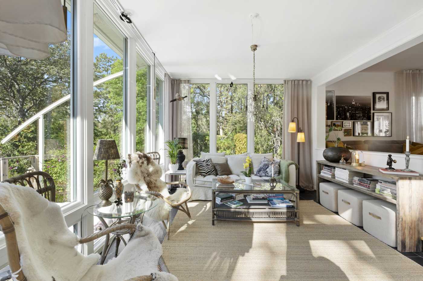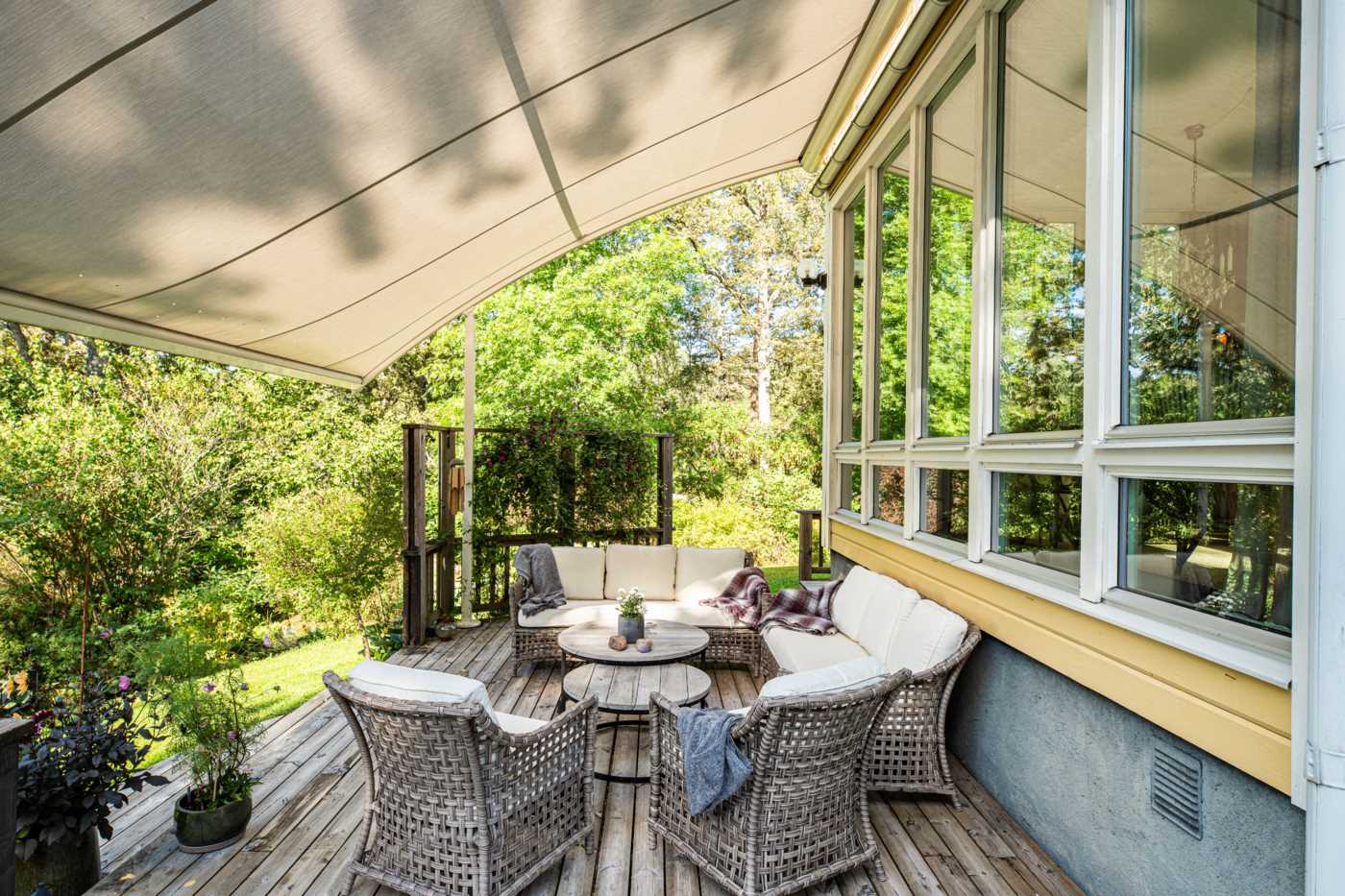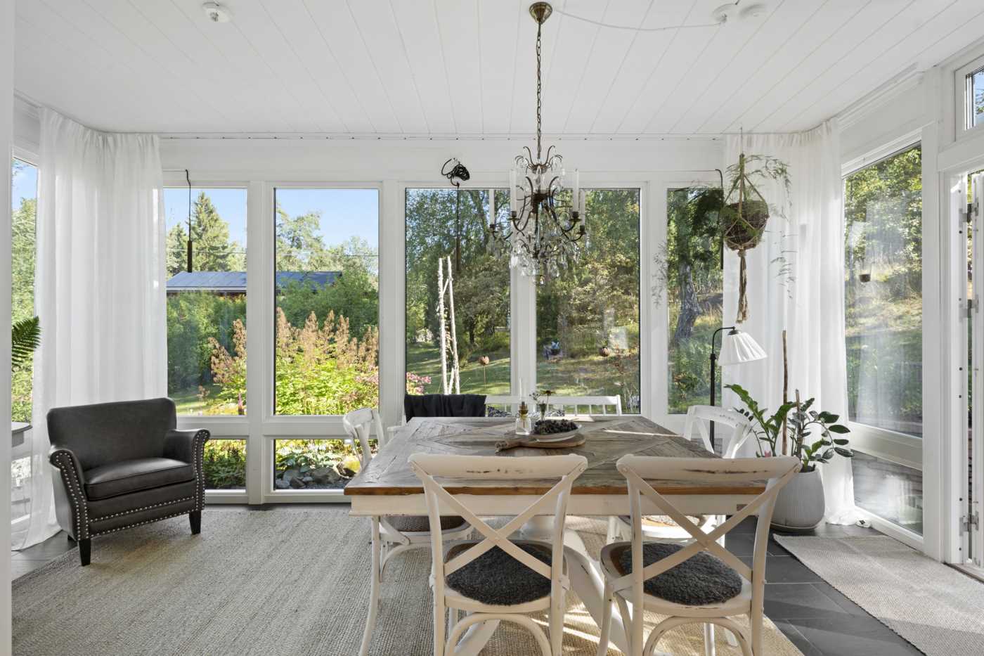 Två trappsteg ned från vardagsrummet nås den inglasade verandan med den fantastiska utsikten mot sjön Trehörningen. Rummet har härlig rymd tack vare takhöjd om drygt 2,65 m och de tre glasade väggarna mot den vackra trädgården. Via glasad dörr nås trädecket med flera uteplatser som löper längs ena långsidan av huset och vidare till husets gavel med samma ljuvliga vy över sjön. Rummet har svart klinker med vattenburen golvvärme och den tredje halvväggen är vitmålad.