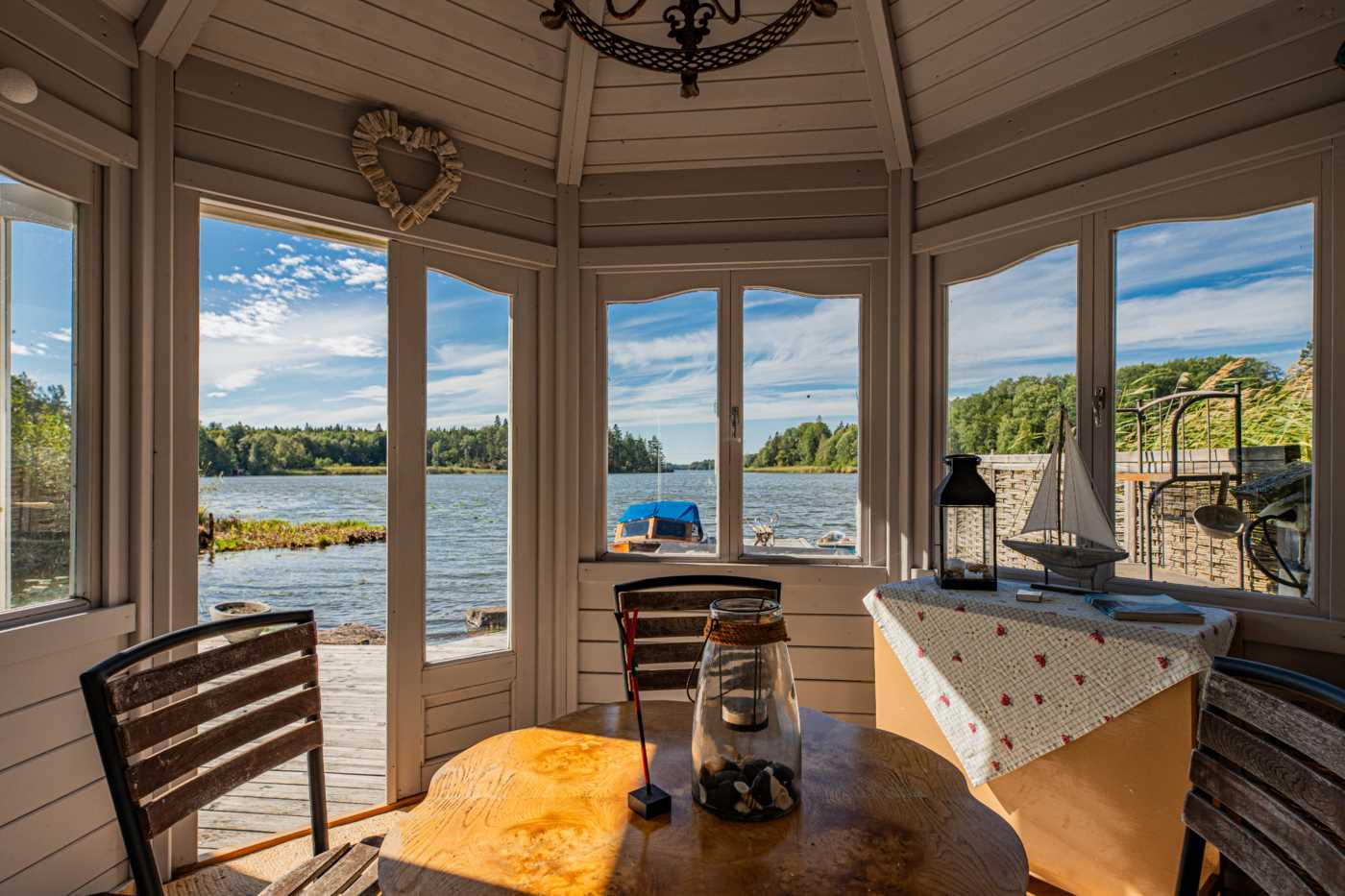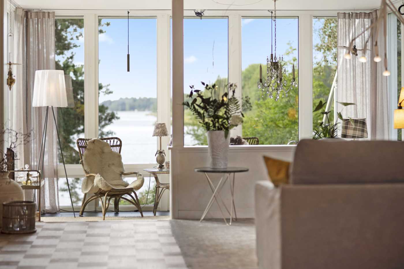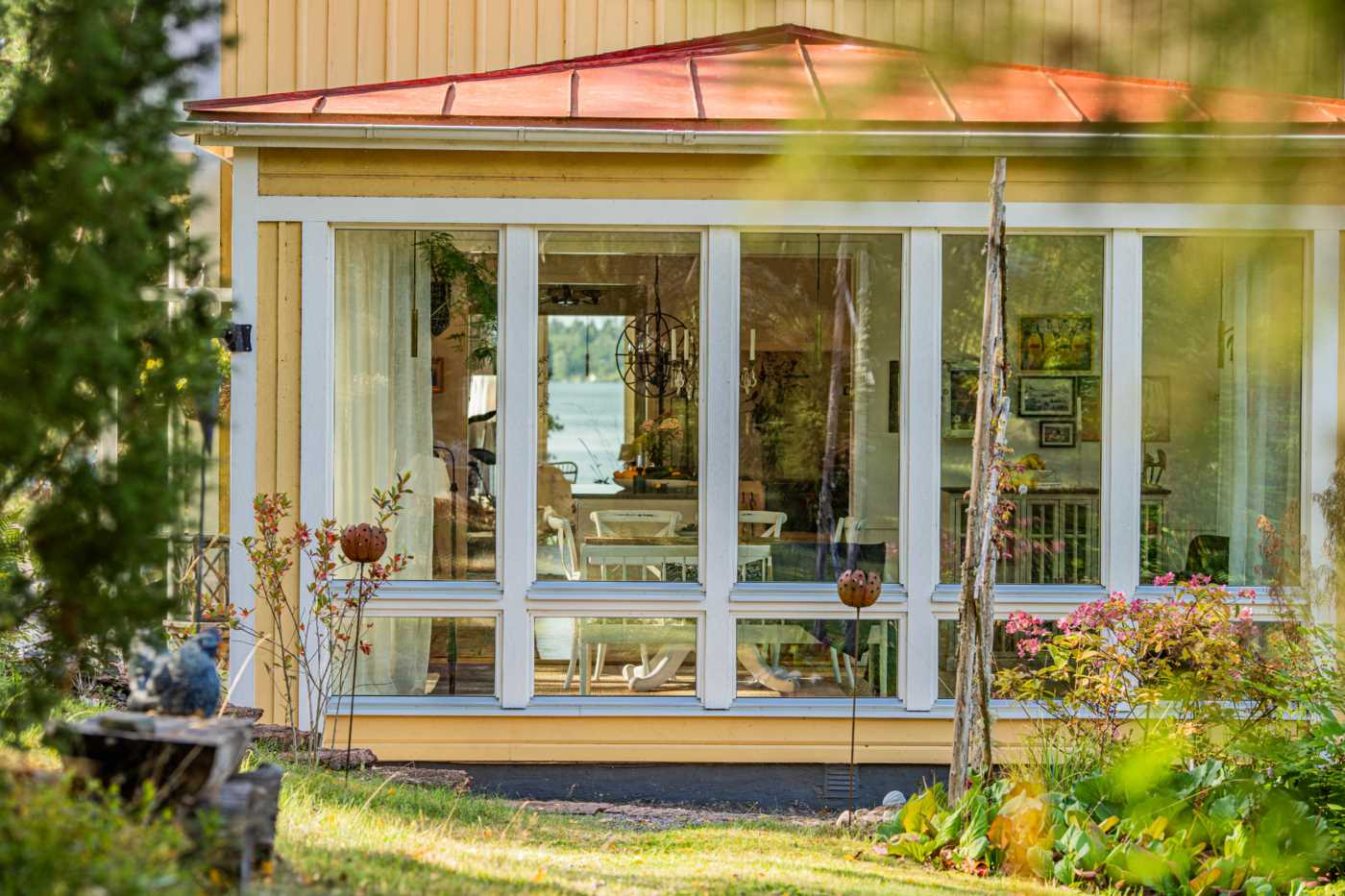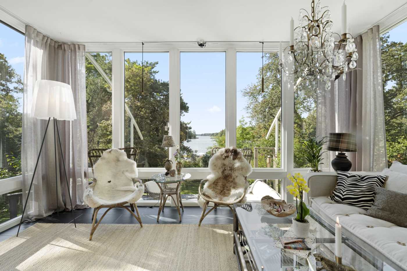 Två trappsteg ned från vardagsrummet nås den inglasade verandan med den fantastiska utsikten mot sjön Trehörningen. Rummet har härlig rymd tack vare takhöjd om drygt 2,65 m och de tre glasade väggarna mot den vackra trädgården. Via glasad dörr nås trädecket med flera uteplatser som löper längs ena långsidan av huset och vidare till husets gavel med samma ljuvliga vy över sjön. Rummet har svart klinker med vattenburen golvvärme och den tredje halvväggen är vitmålad.