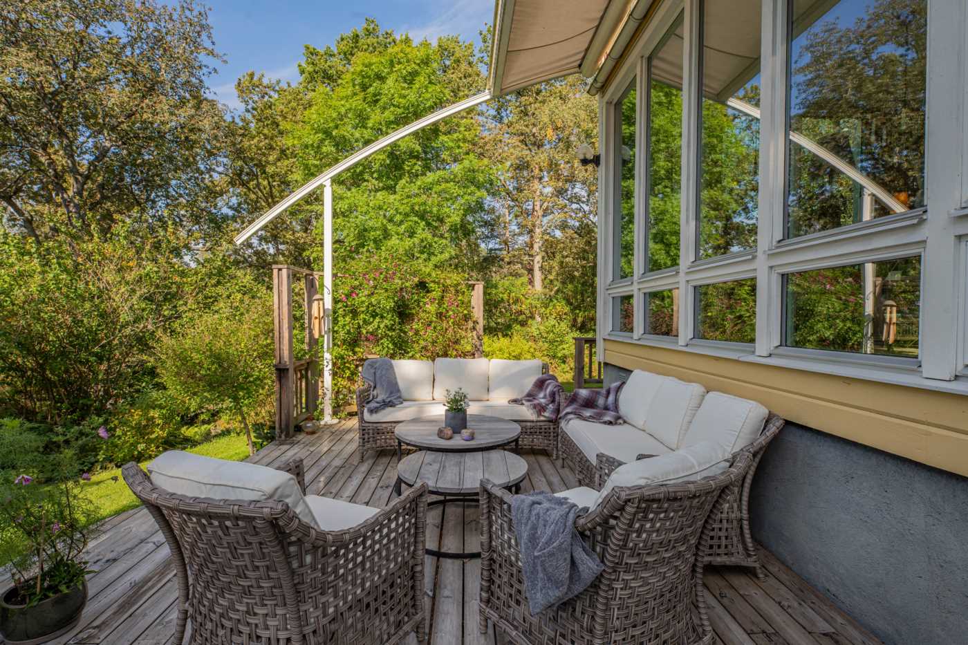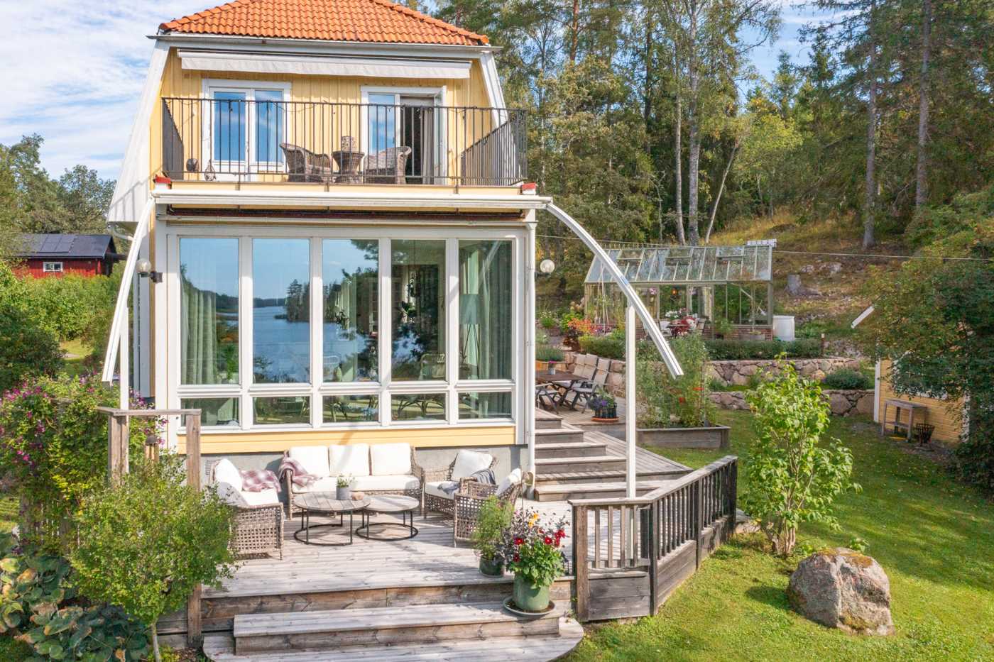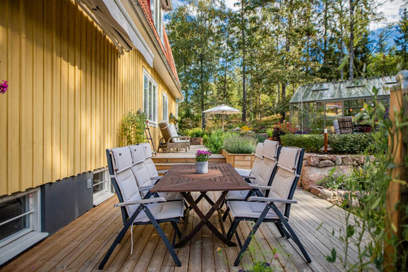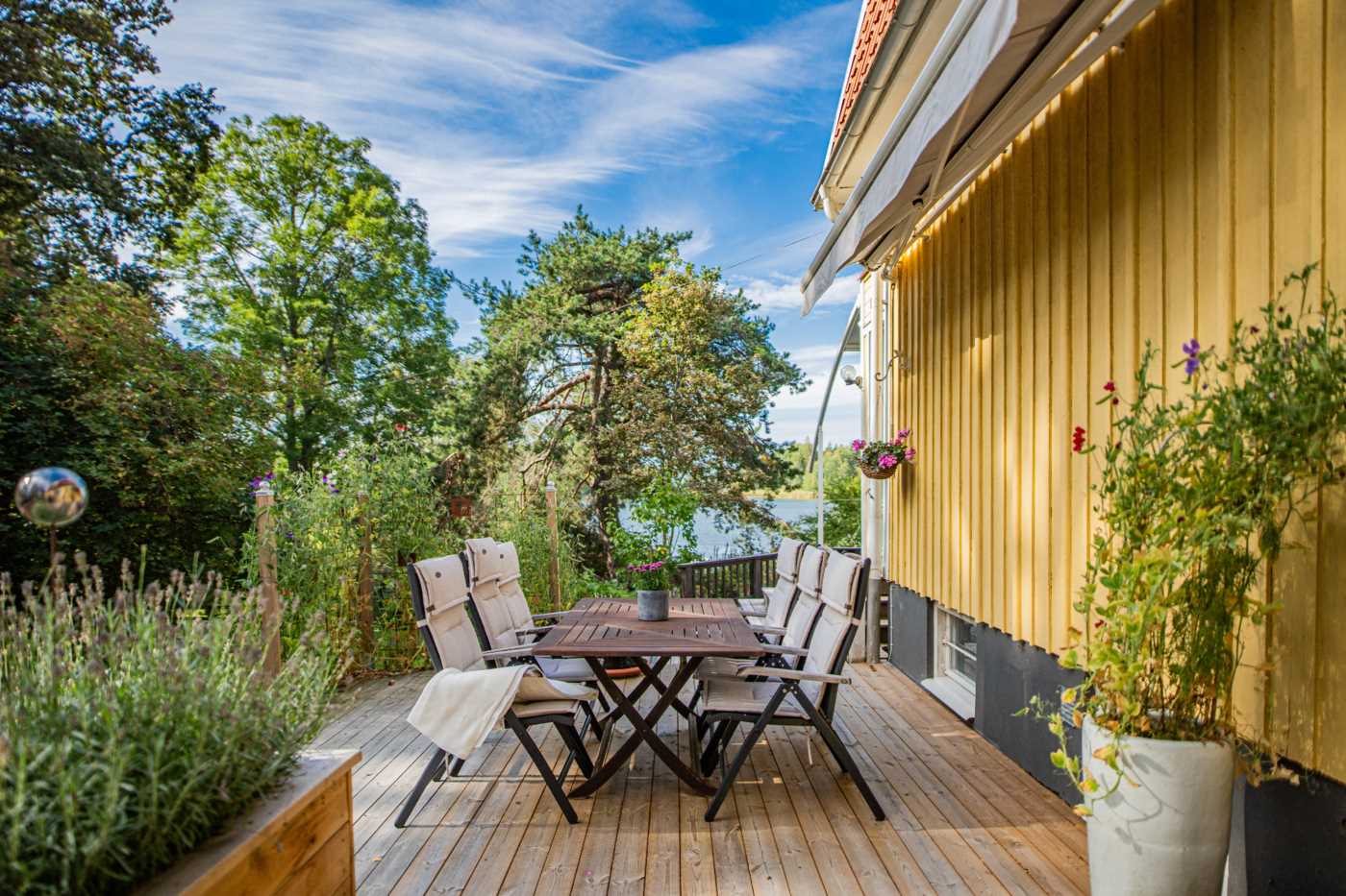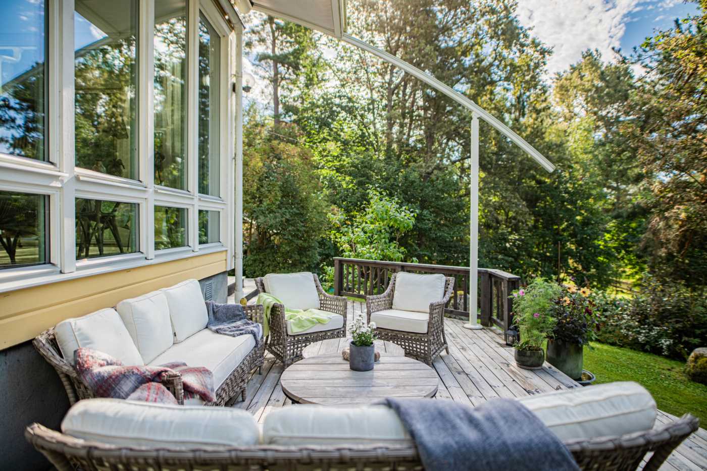 Två trappsteg ned från vardagsrummet nås den inglasade verandan med den fantastiska utsikten mot sjön Trehörningen. Rummet har härlig rymd tack vare takhöjd om drygt 2,65 m och de tre glasade väggarna mot den vackra trädgården. Via glasad dörr nås trädecket med flera uteplatser som löper längs ena långsidan av huset och vidare till husets gavel med samma ljuvliga vy över sjön. Rummet har svart klinker med vattenburen golvvärme och den tredje halvväggen är vitmålad.