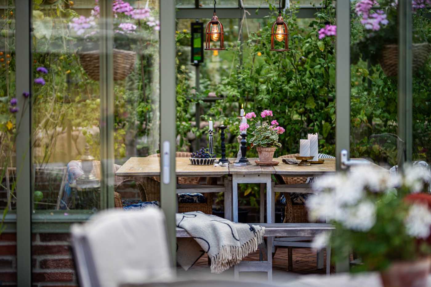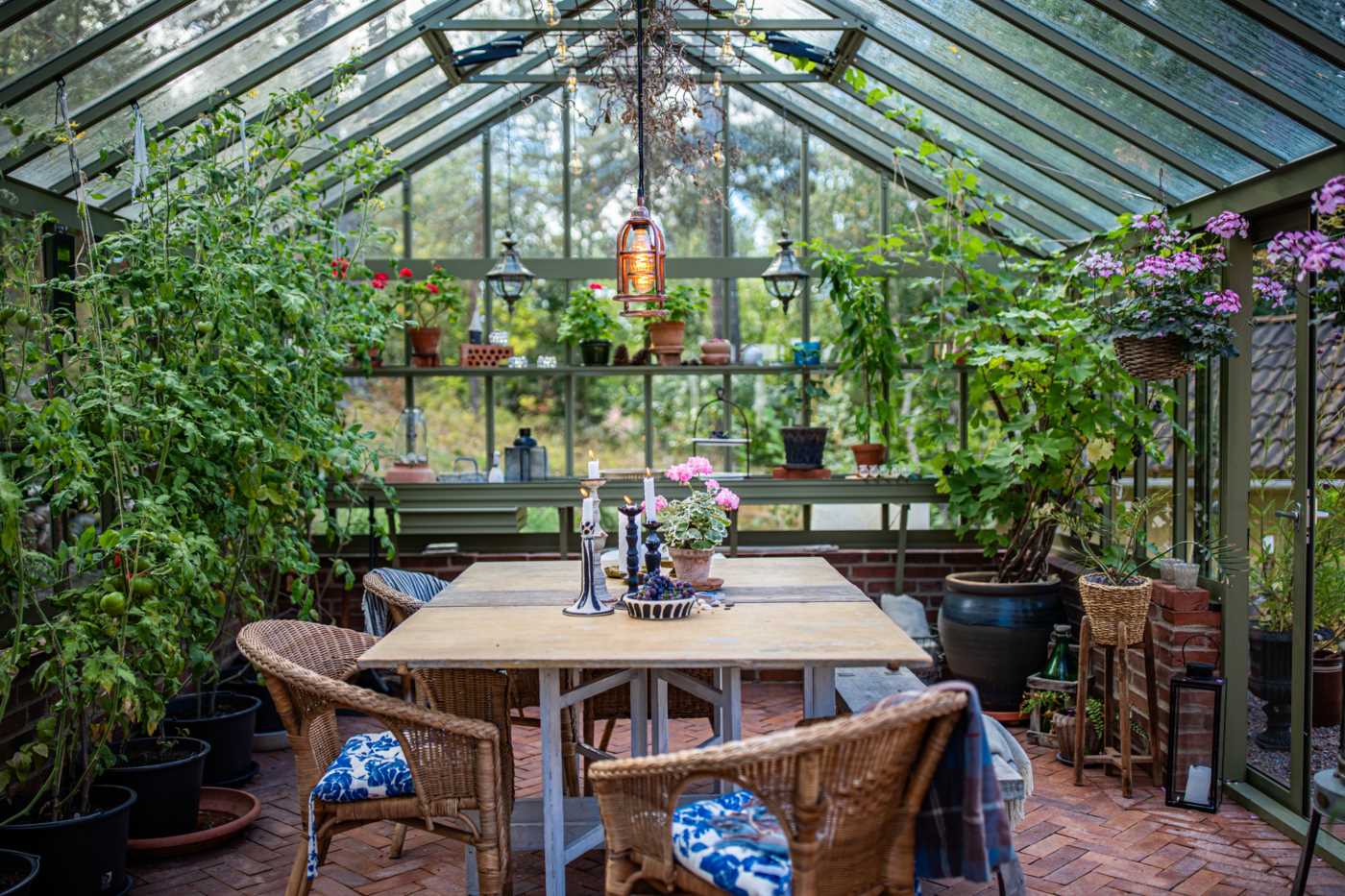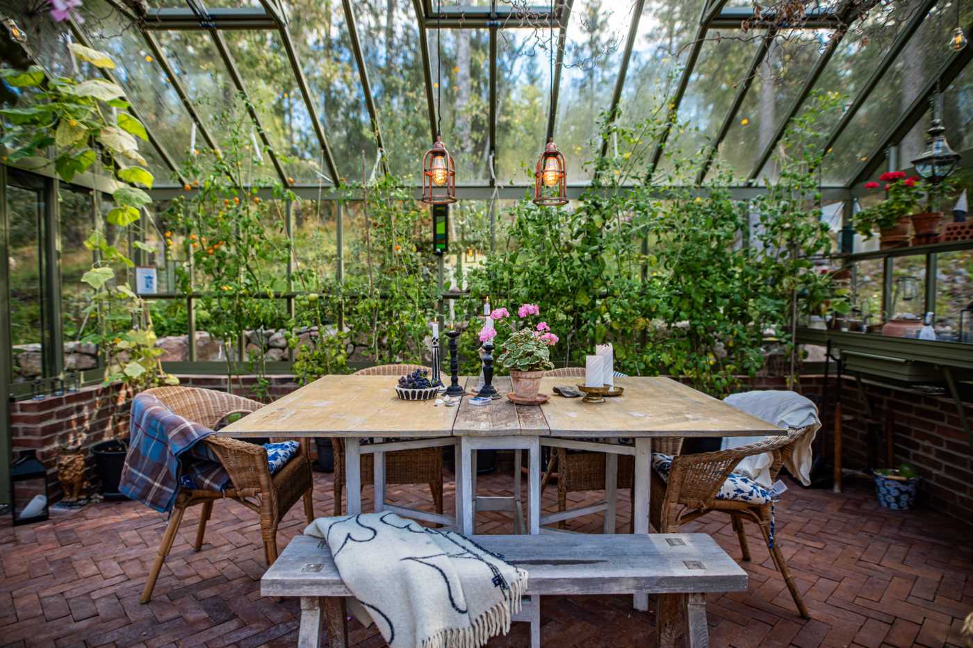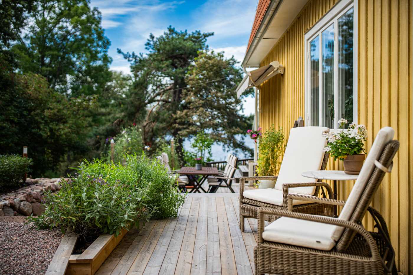 Två trappsteg ned från vardagsrummet nås den inglasade verandan med den fantastiska utsikten mot sjön Trehörningen. Rummet har härlig rymd tack vare takhöjd om drygt 2,65 m och de tre glasade väggarna mot den vackra trädgården. Via glasad dörr nås trädecket med flera uteplatser som löper längs ena långsidan av huset och vidare till husets gavel med samma ljuvliga vy över sjön. Rummet har svart klinker med vattenburen golvvärme och den tredje halvväggen är vitmålad.
