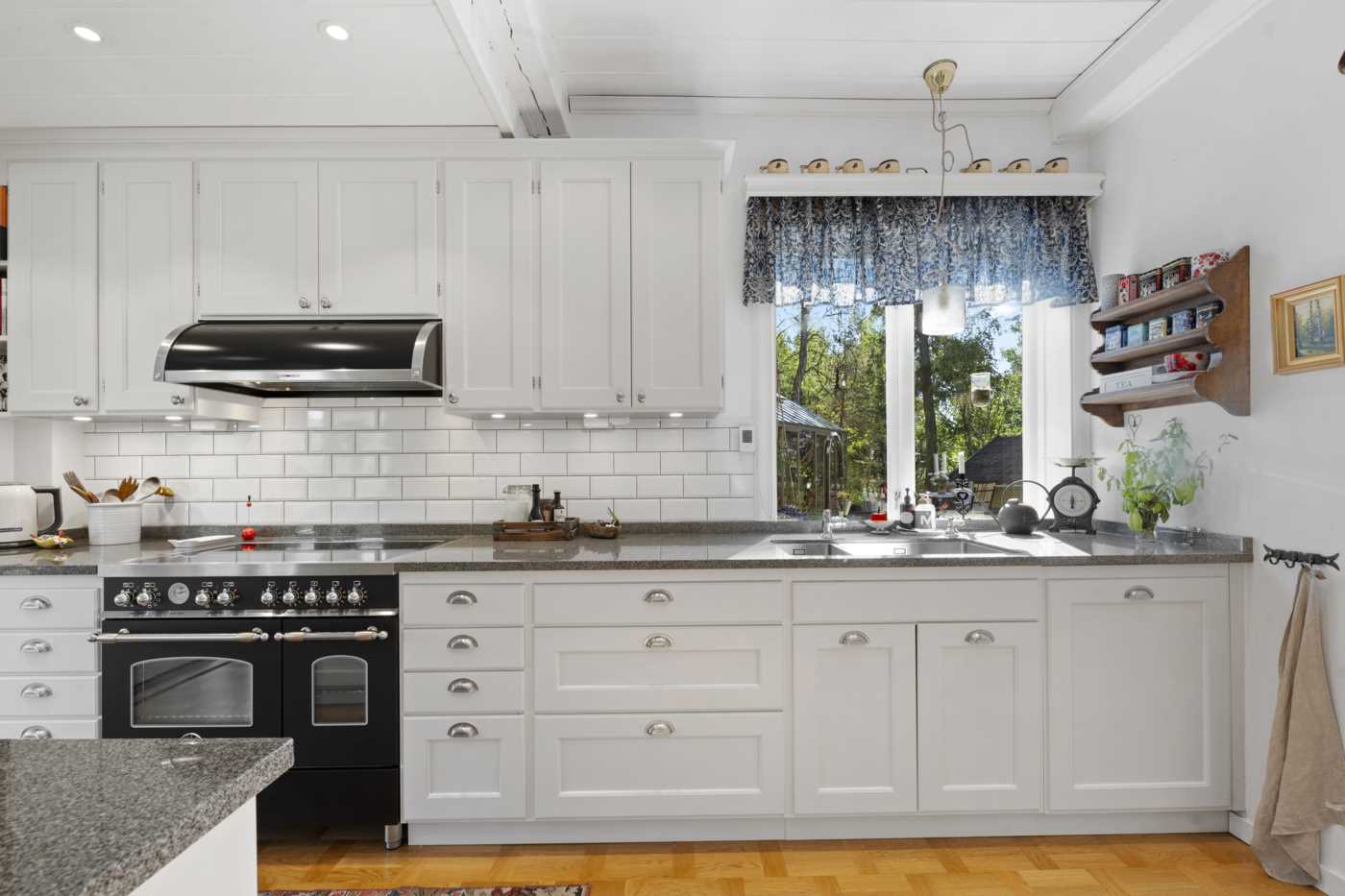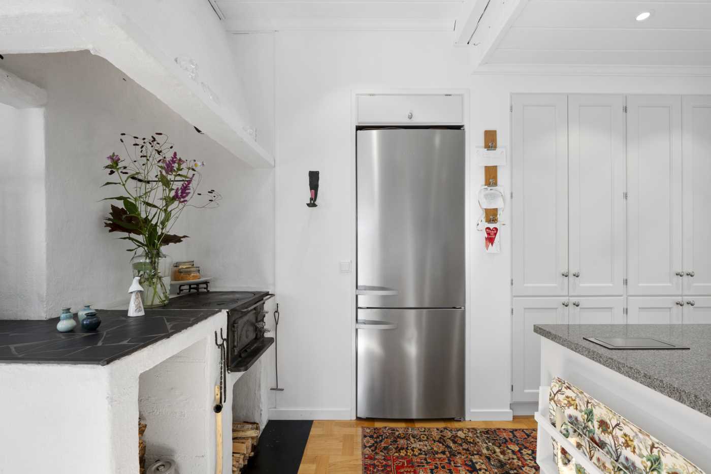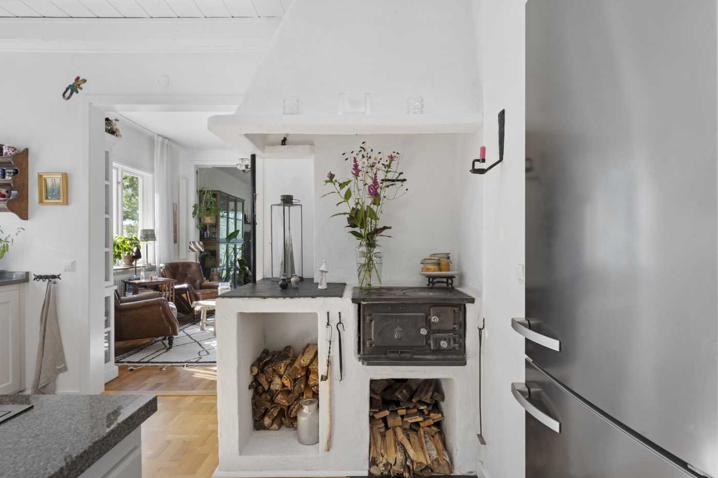 Stort påkostat lantkök för den matlagningsintresserade med vackert och platsbyggt kök i sandfärg med inredning i vitmålad ek från CLAESSONKÖK installerat 2017. Ovan de tjocka 70 cm djupa bänkskivorna med kantlist i vacker grå Bohusgranit finns stänkskydd i vitt kakel. Här finns även en matchande köksö med både extra förvaring och fin arbetsyta, praktisk detalj är det infällda eluttagen i bänkskivan. Spisen från Bertazzoni erbjuder två ugnar och en bred induktionshäll, självklart har detta lantkök även en vedspis Husqvarna Vapenfabrik No 271 med praktisk arbetsyta bredvid och vedförvaring under. Bakom två högskåp döljer sig praktisk förvaring och plats för bland annat micro. Vitmålade väggar, ekparkett i Holländskt förband med vattenburen golvvärme samt infällda spotlights och synliga vitmålade balkar i tak.rnrnKöksutrustning:rn* Spis med induktionshäll, Bertazzoni -17rn* Fläkt, Fjärråskupan -17rn* Kyl/frys, 75 cm bred, Miele -17rn* Diskmaskin, Miele -17rn* Vedspis Husqvarna Vapenfabrik No 271