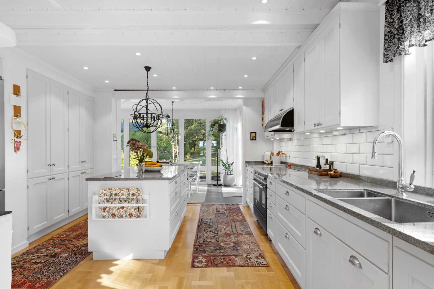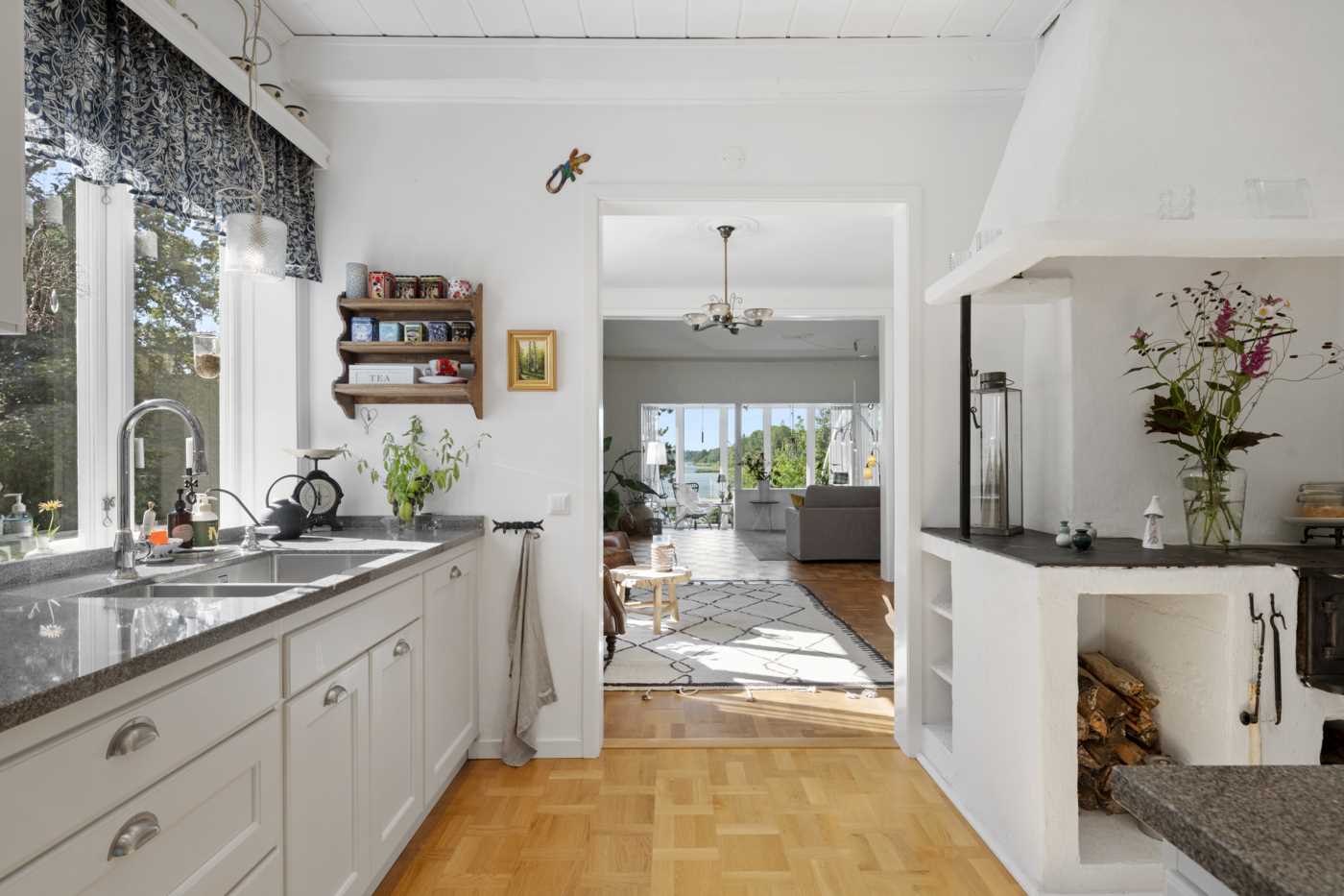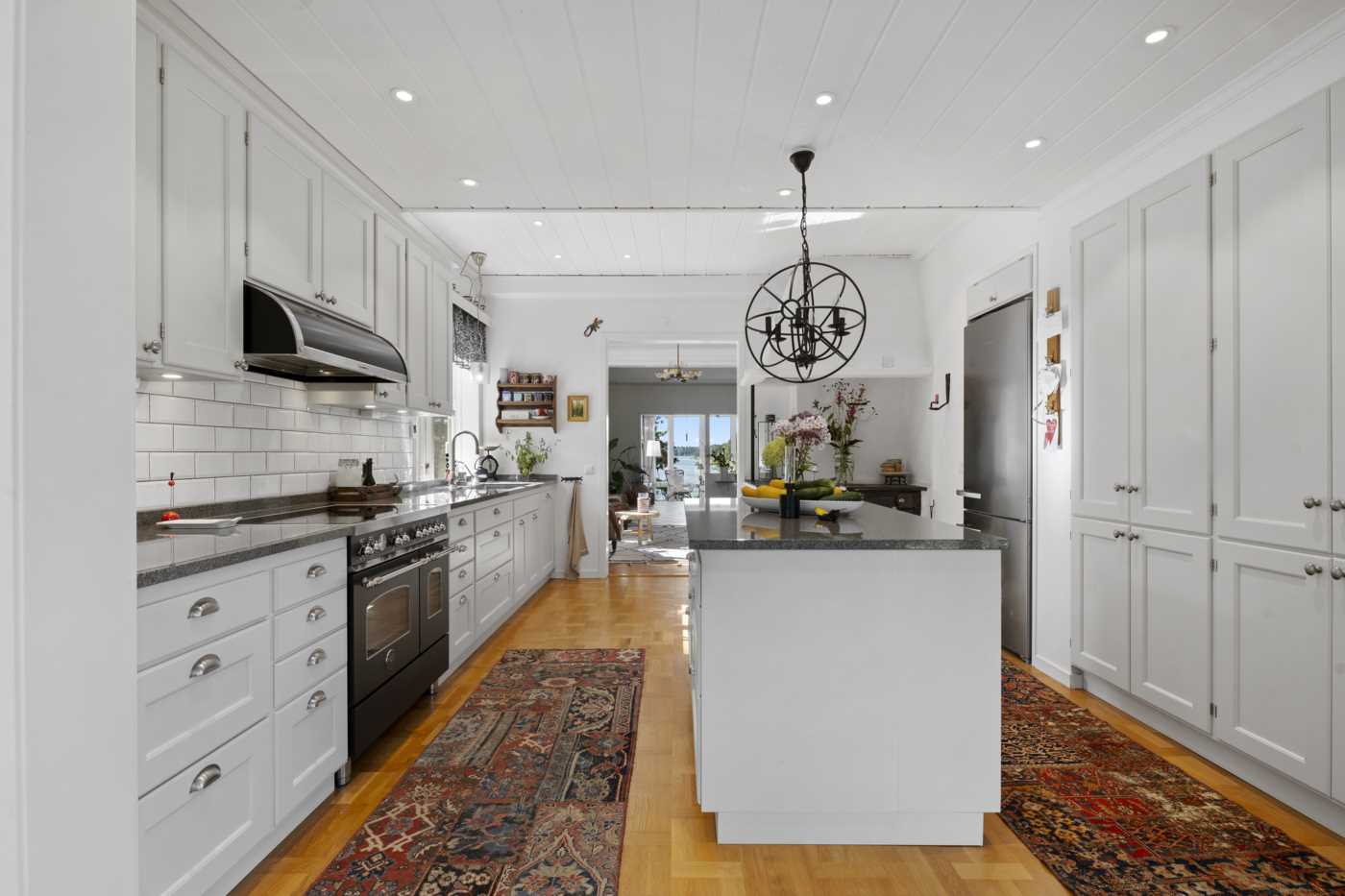 Stort påkostat lantkök för den matlagningsintresserade med vackert och platsbyggt kök i sandfärg med inredning i vitmålad ek från CLAESSONKÖK installerat 2017. Ovan de tjocka 70 cm djupa bänkskivorna med kantlist i vacker grå Bohusgranit finns stänkskydd i vitt kakel. Här finns även en matchande köksö med både extra förvaring och fin arbetsyta, praktisk detalj är det infällda eluttagen i bänkskivan. Spisen från Bertazzoni erbjuder två ugnar och en bred induktionshäll, självklart har detta lantkök även en vedspis Husqvarna Vapenfabrik No 271 med praktisk arbetsyta bredvid och vedförvaring under. Bakom två högskåp döljer sig praktisk förvaring och plats för bland annat micro. Vitmålade väggar, ekparkett i Holländskt förband med vattenburen golvvärme samt infällda spotlights och synliga vitmålade balkar i tak.rnrnKöksutrustning:rn* Spis med induktionshäll, Bertazzoni -17rn* Fläkt, Fjärråskupan -17rn* Kyl/frys, 75 cm bred, Miele -17rn* Diskmaskin, Miele -17rn* Vedspis Husqvarna Vapenfabrik No 271