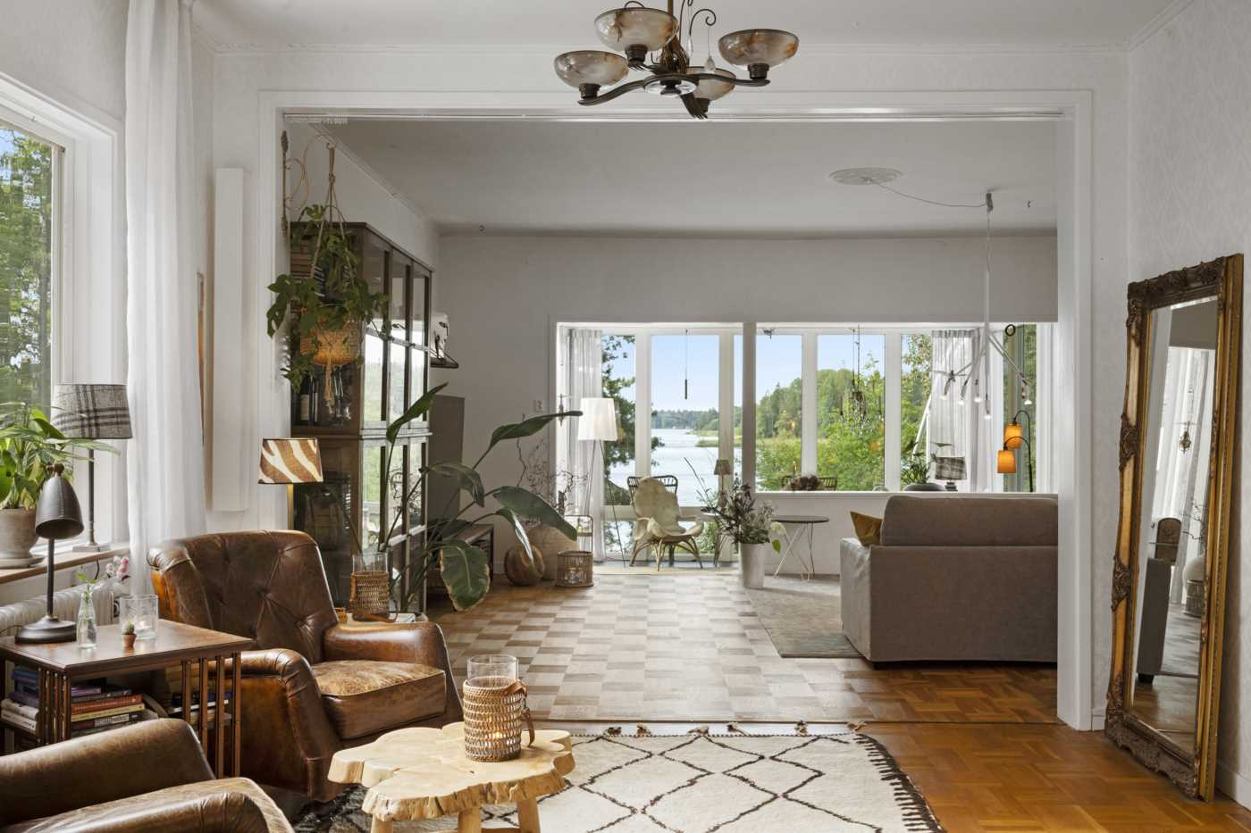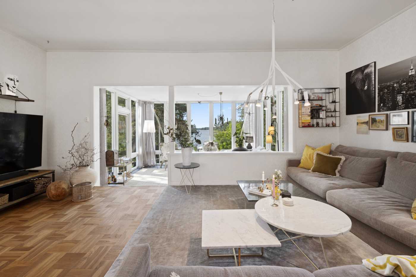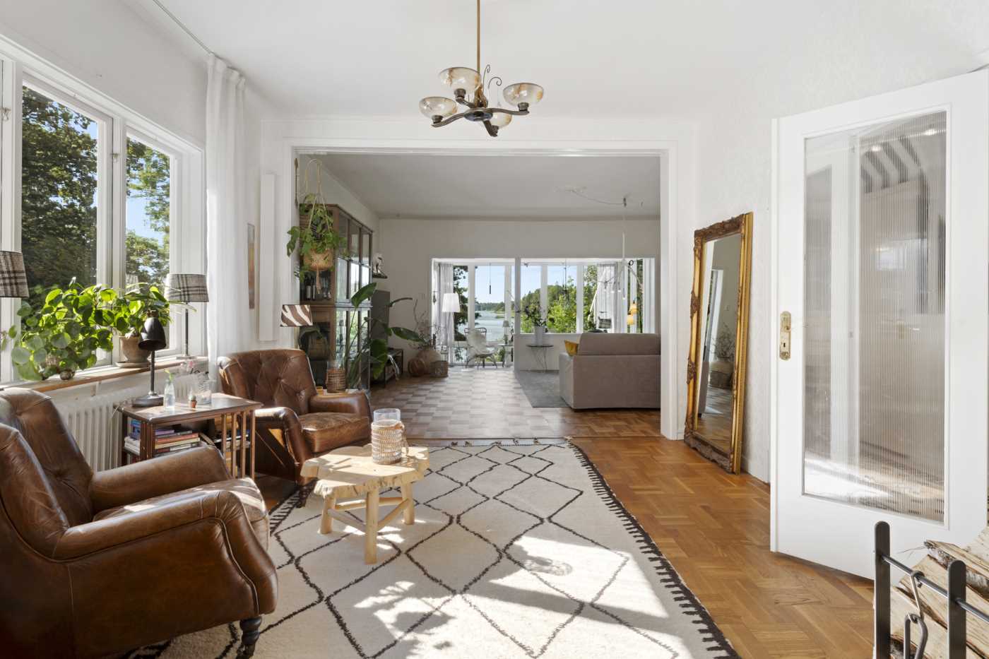 Vardagsrum med öppen planlösning mot sällskapsrummet och den inglasade verandan, även detta rum har vacker oljad ekparkett i Holländskt förband och ljust mönstrad tapet. Ljusinsläpp från ett fönster och självklart samma underbara utsikt över tomten och sjön.