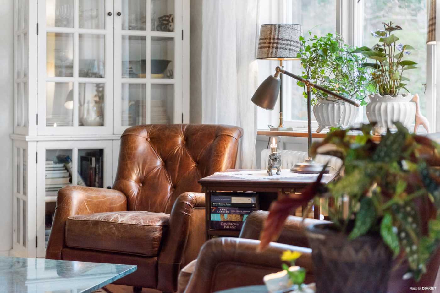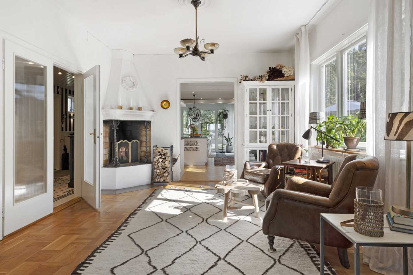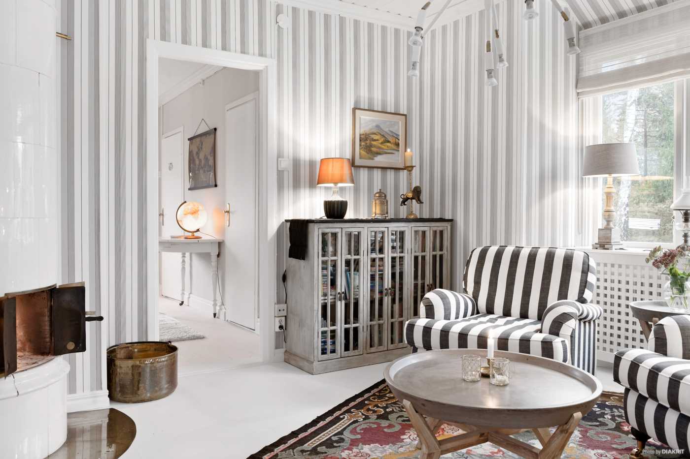Vardagsrum med öppen planlösning mot sällskapsrummet och den inglasade verandan, även detta rum har vacker oljad ekparkett i Holländskt förband och ljust mönstrad tapet. Ljusinsläpp från ett fönster och självklart samma underbara utsikt över tomten och sjön.