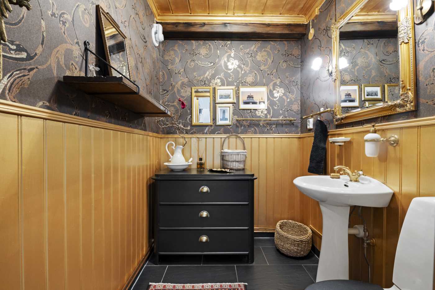 Läcker gäst wc med mönstrad tapet, guldmålad bröstpanel och svart klinker med vattenburen golvvärme. Guldspegel ovan tvättställ med snygg mässingskran och wc.