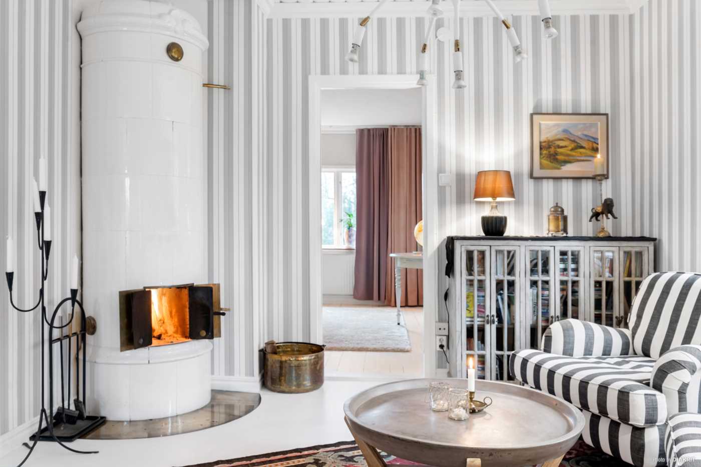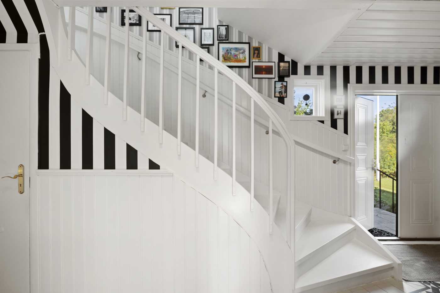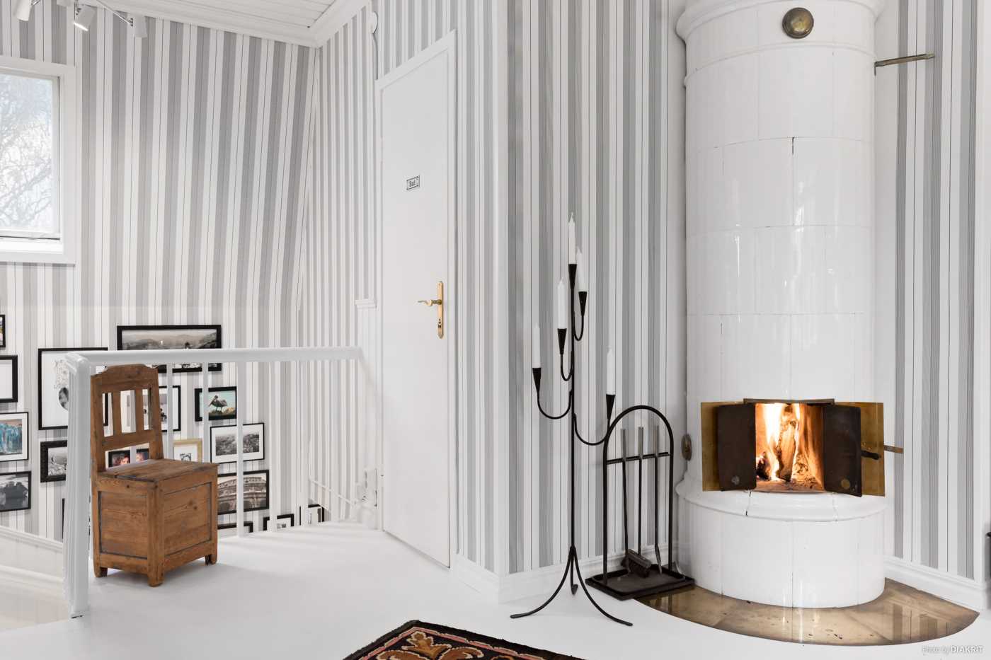 Från hallen leder en vitmålad trappa med randig tapet från Ralph Lauren ovan vit bröstpanel samt ljusinsläpp via ett takfönster upp till det övre planer och allrummet. Charmigt rum med vit kakelugn och ljusinsläpp via stort fönster i takkupa. Här är väggarna är tapetserade med samma tapet som i trappan och trägolvet är vitmålat.
