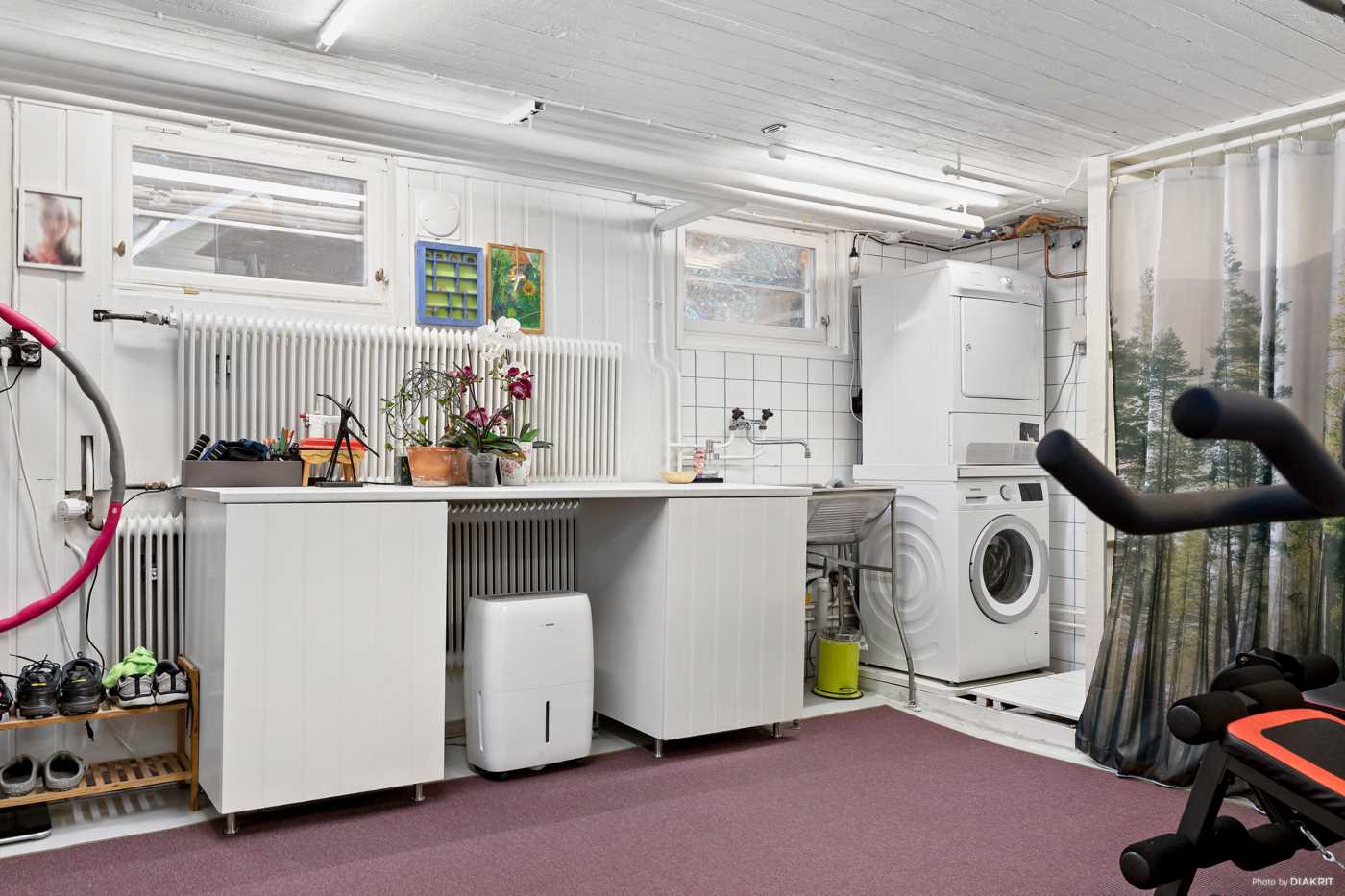 I hallen med gråmålat betonggolv och vita putsade väggar finns en frysbox och även husets vattenanläggning med nyare hydropress och partikelfilter.