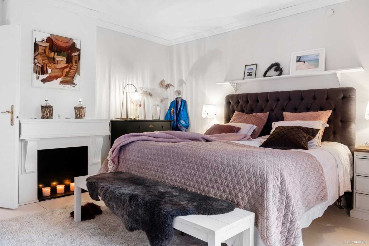 Stort sovrum med ingång till både eget badrum och garderob där den äldre inredningen delvis är bevarad och ljusinsläpp via stort fönster. Här finns en stämningshöjande dekorations brasa, ljust tapet och vitmålat trägolv.