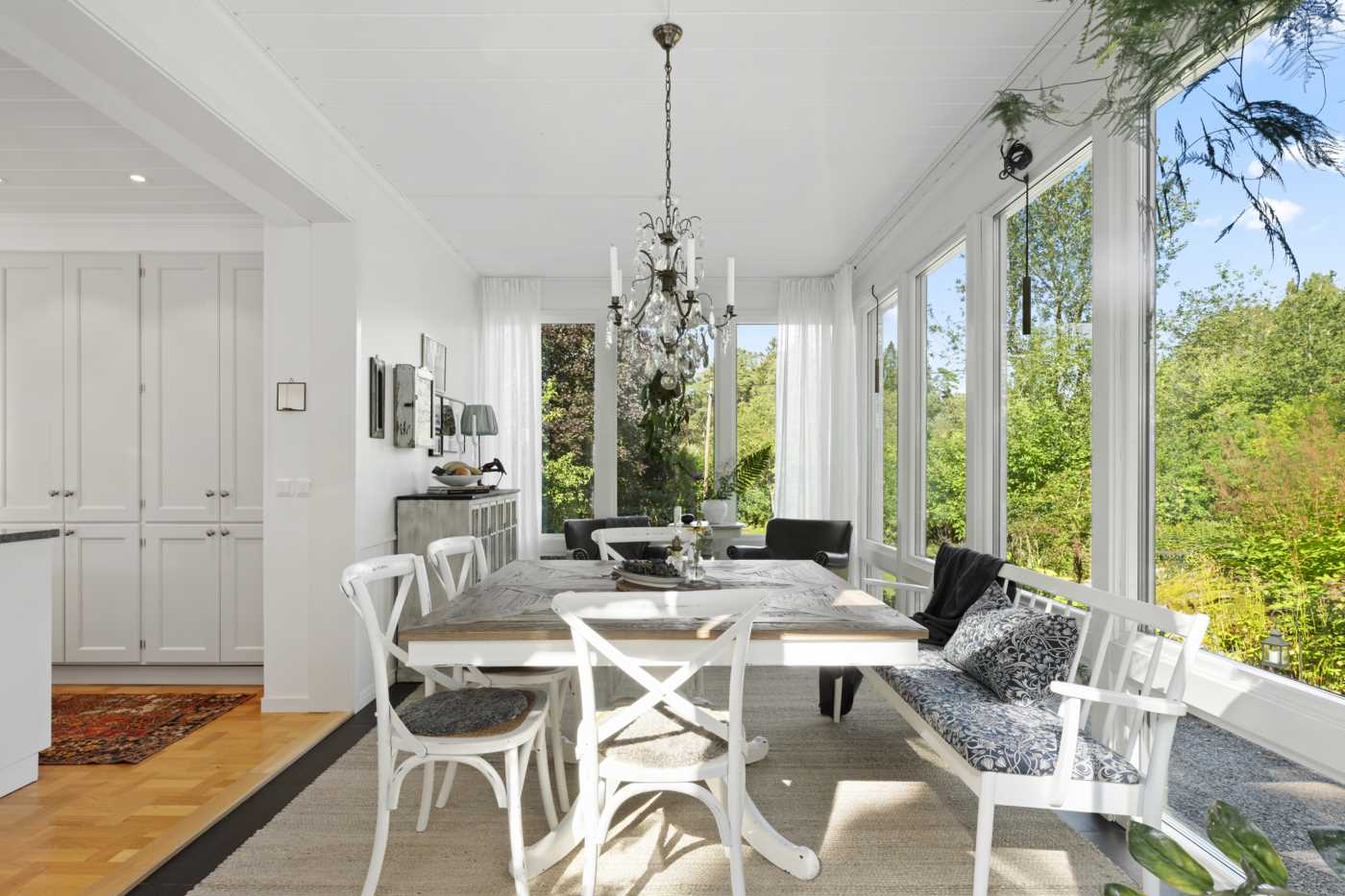 I anslutning till köket nås husets andra glasveranda tillika matsalen. Ett härligt rum med vy över trädgården och skogsbacke med utgång till trädecket som löper längs med husets ena långsida. Svart klinker med vattenburen golvvärme och en vitmålad vägg ovan vit pärlspont.