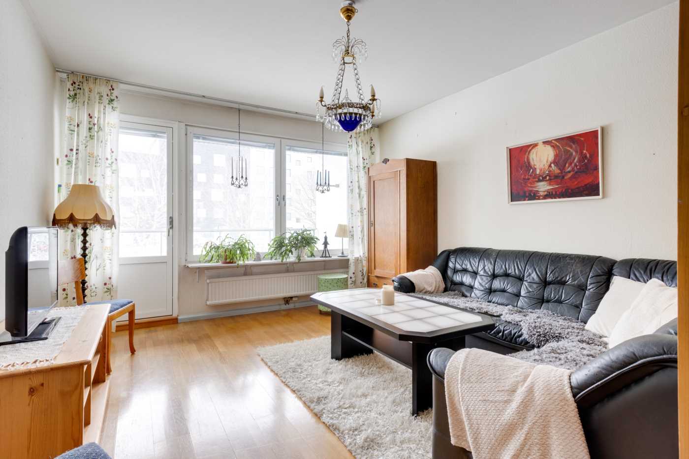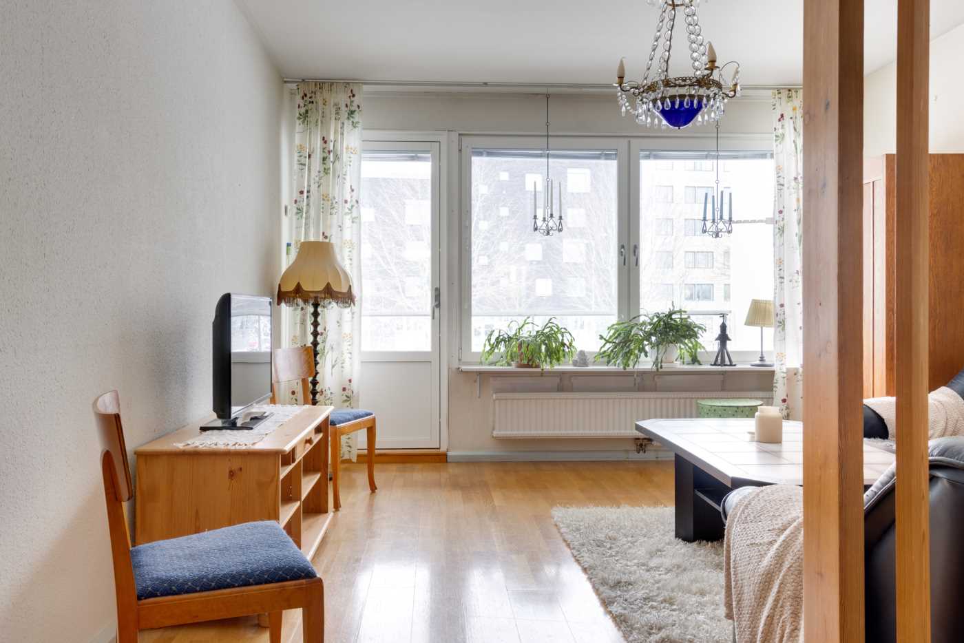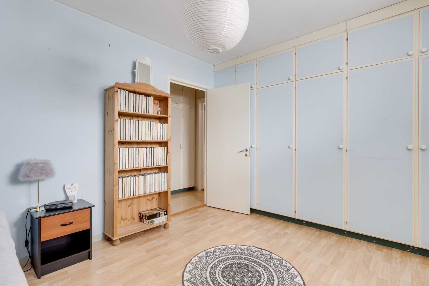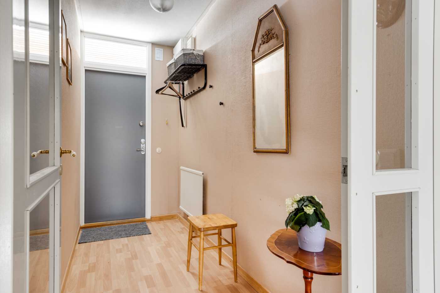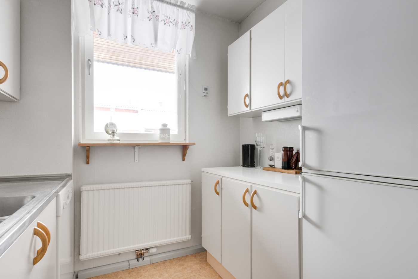 Öppen planlösning mellan kök och det generösa vardagsrummet med fint ljusinsläpp. Mellan vardagsrum och kök finns platsen för matbord. Köket har vita skåpsluckor och bra arbetsytor. Sovrummet har plats för dubbelsäng samt finns här en hel garderobsvägg och gott om förvaringsmöjligheter. Badrummet är stamrenoverat, här finns dusch, WC, handfat med kommod samt en tvättmaskin för extra bekvämlighet. K