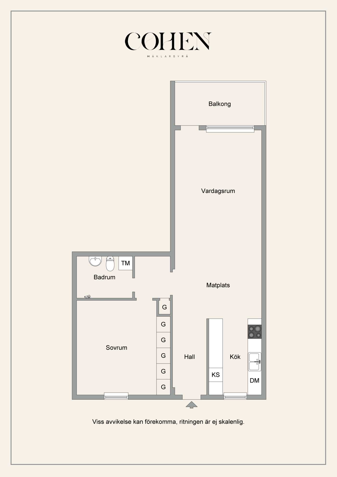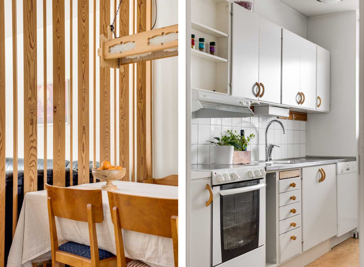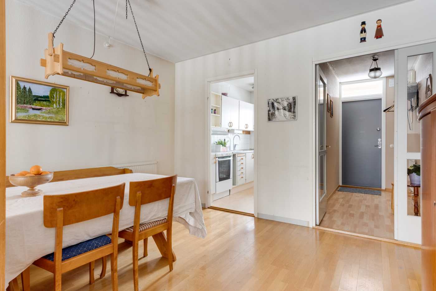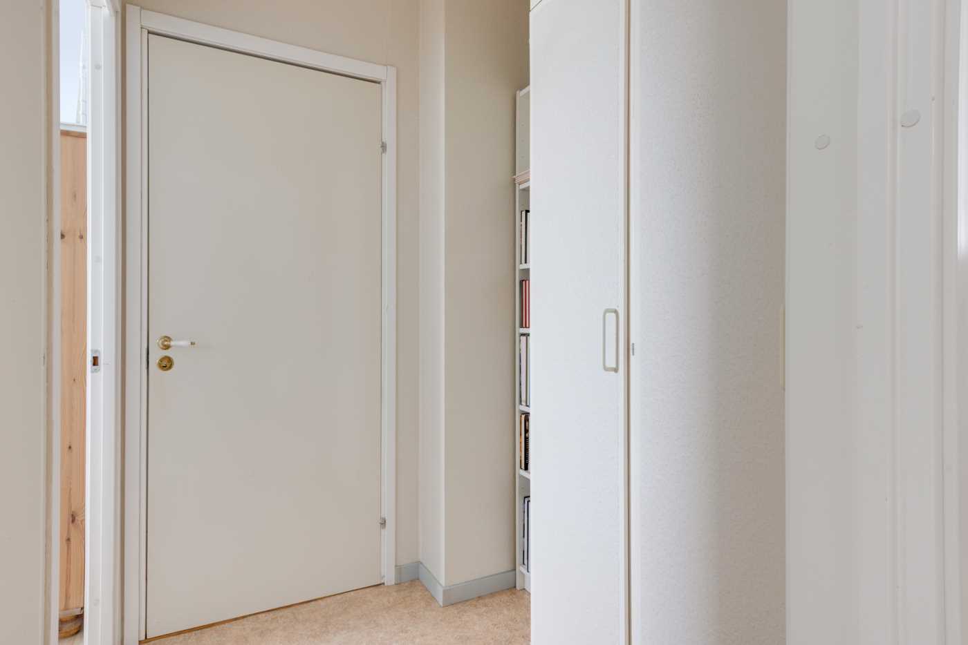 Öppen planlösning mellan kök och det generösa vardagsrummet med fint ljusinsläpp. Mellan vardagsrum och kök finns platsen för matbord. Köket har vita skåpsluckor och bra arbetsytor. Sovrummet har plats för dubbelsäng samt finns här en hel garderobsvägg och gott om förvaringsmöjligheter. Badrummet är stamrenoverat, här finns dusch, WC, handfat med kommod samt en tvättmaskin för extra bekvämlighet. K