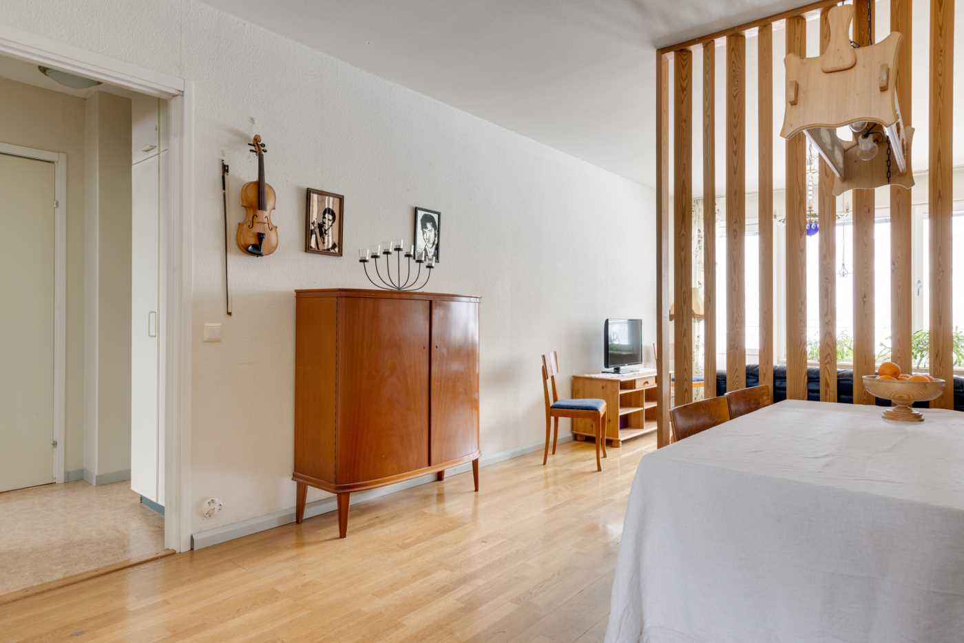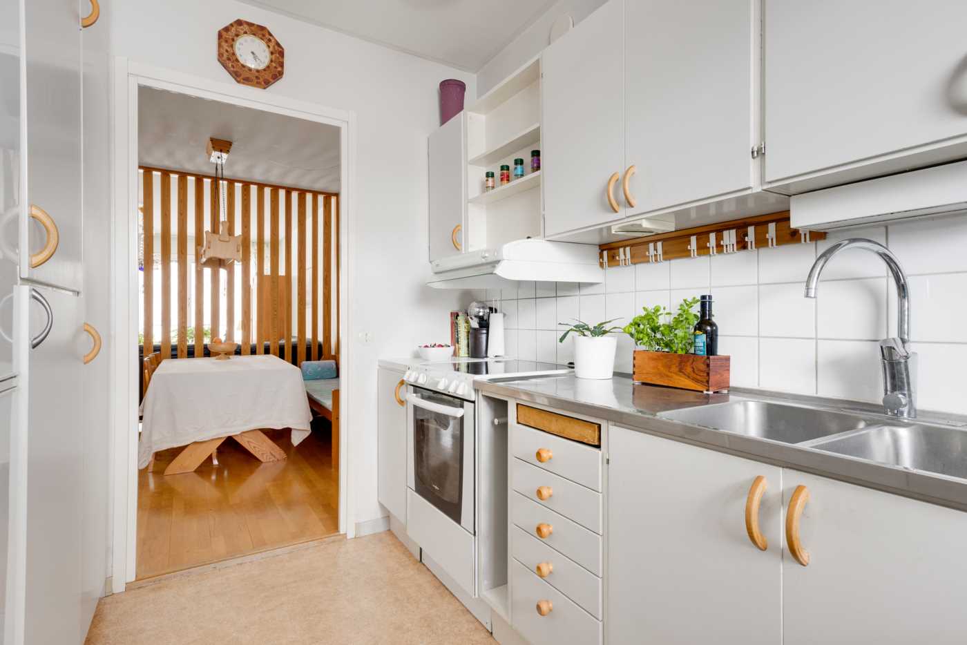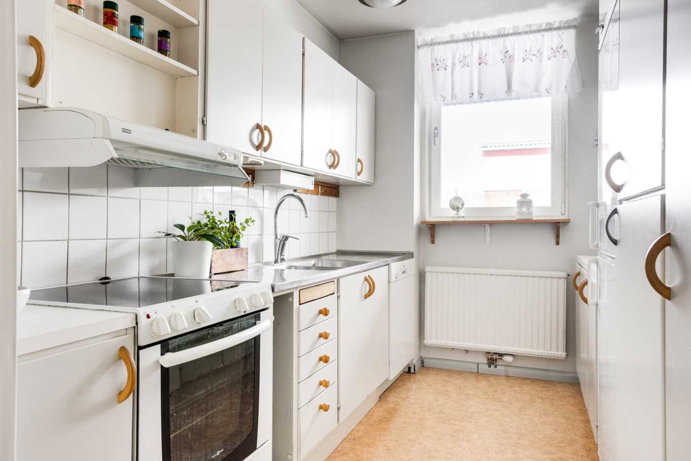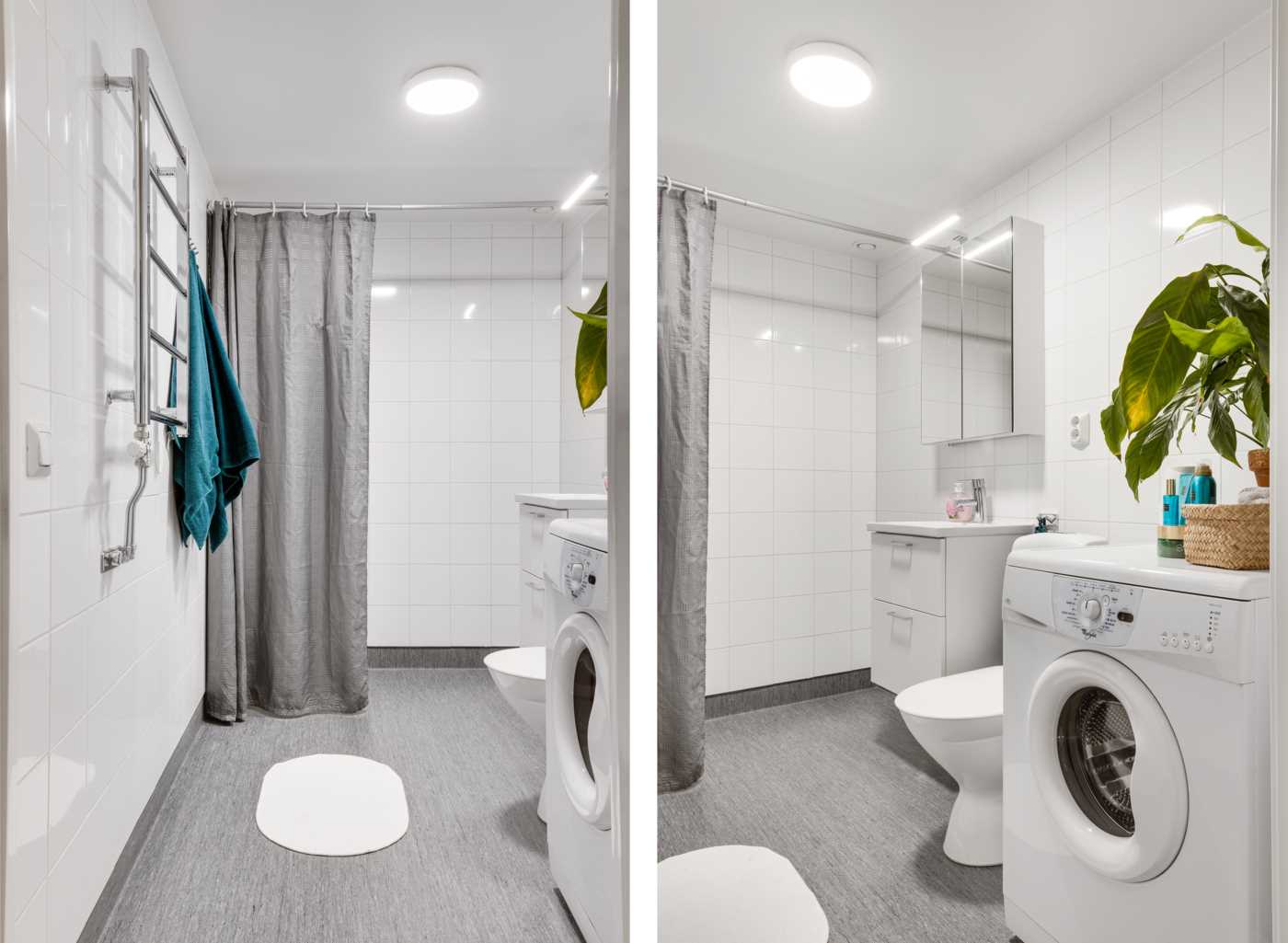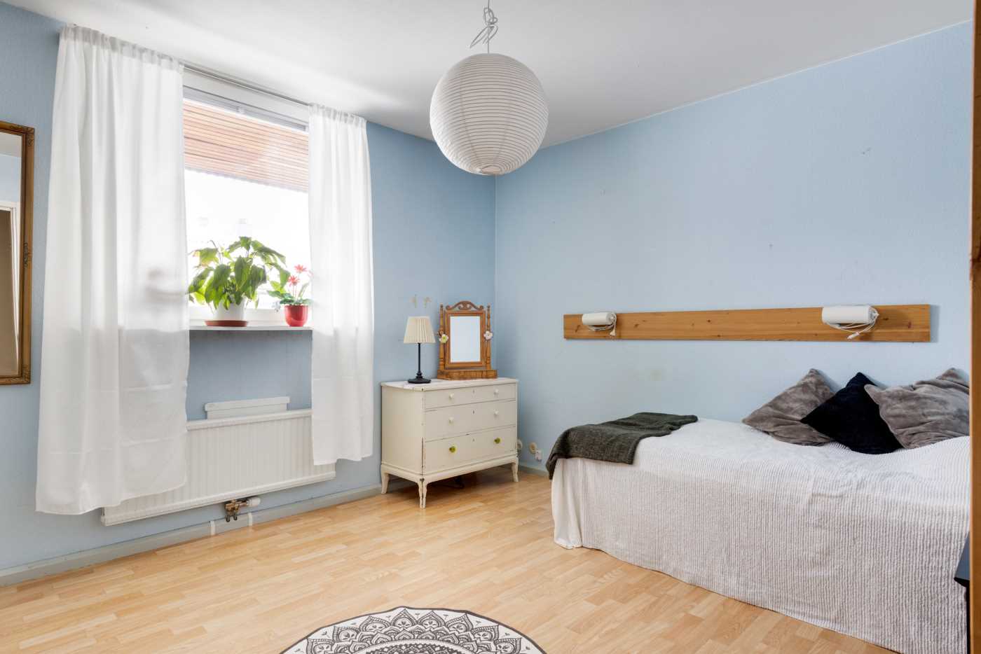Öppen planlösning mellan kök och det generösa vardagsrummet med fint ljusinsläpp. Mellan vardagsrum och kök finns platsen för matbord. Köket har vita skåpsluckor och bra arbetsytor. Sovrummet har plats för dubbelsäng samt finns här en hel garderobsvägg och gott om förvaringsmöjligheter. Badrummet är stamrenoverat, här finns dusch, WC, handfat med kommod samt en tvättmaskin för extra bekvämlighet. K
