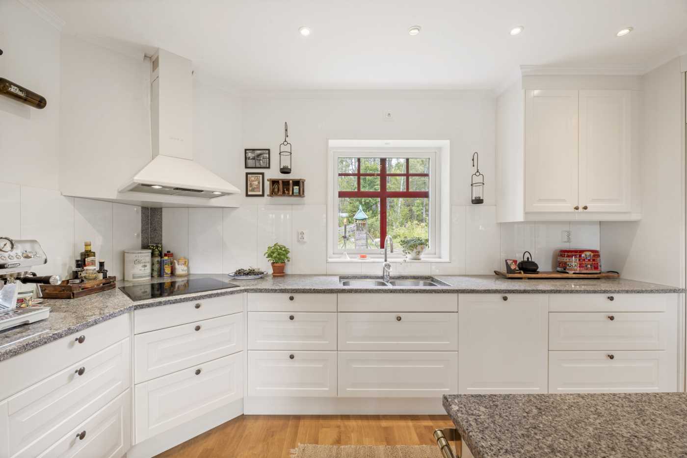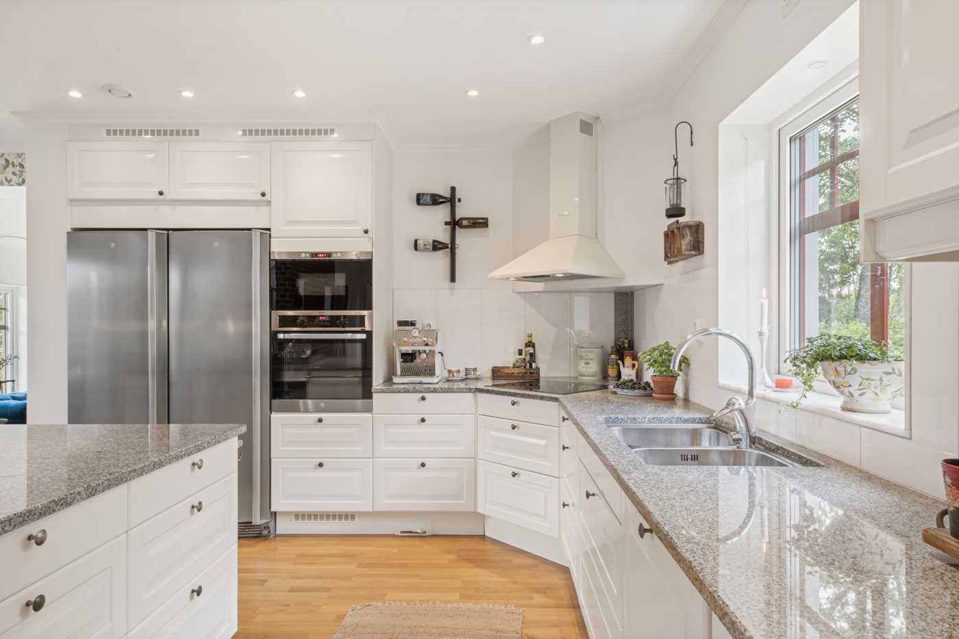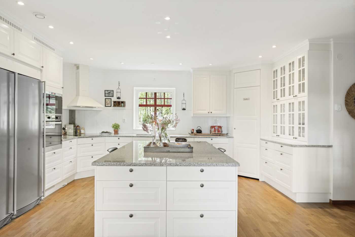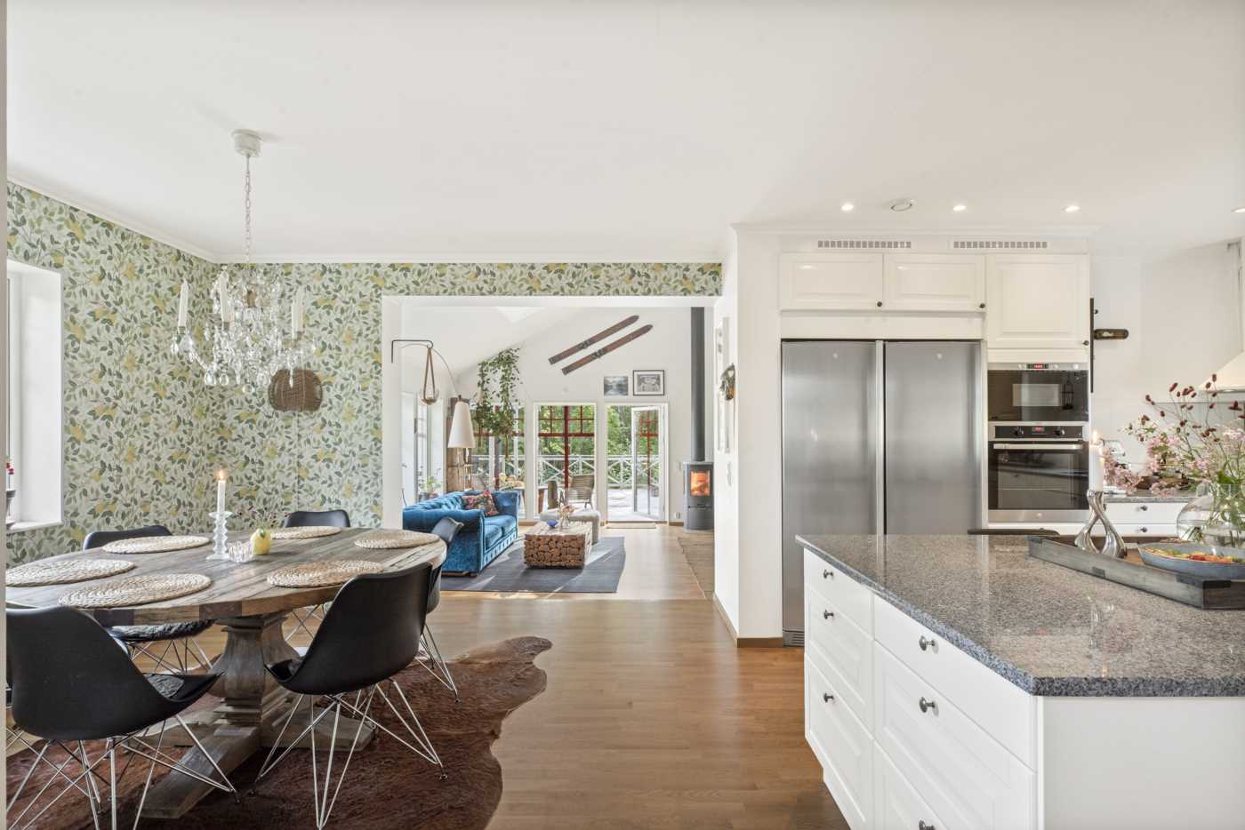 Stort och härligt lantkök med fantastisk förvaring i köksinredning med vita luckor och klassiska attribut som rymligt skafferi och köpmansdisk med vitrinskåp. Här finns även en köksö med två sittplatser som ger både extra förvaring och fin arbetsyta. Det är vitt kakel ovan de vackra arbetsbänkarna i granit med generöst tilltagna arbetsytor och diskhon är placerad framför ett fönster med utsikt mot baksidans lekytor och skogsdungen. I anslutning till köket finns en matplats framför ett fönster med vy mot entrén, här finns plats för stora middagssällskap. Det är vita väggar och infällda spotlights i taket i köksdelen, matplatsen har tapetserade väggar och det är ekparkettgolv med vattenburen golvvärme precis som i resten av huset.