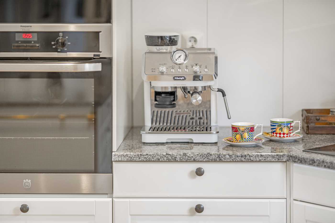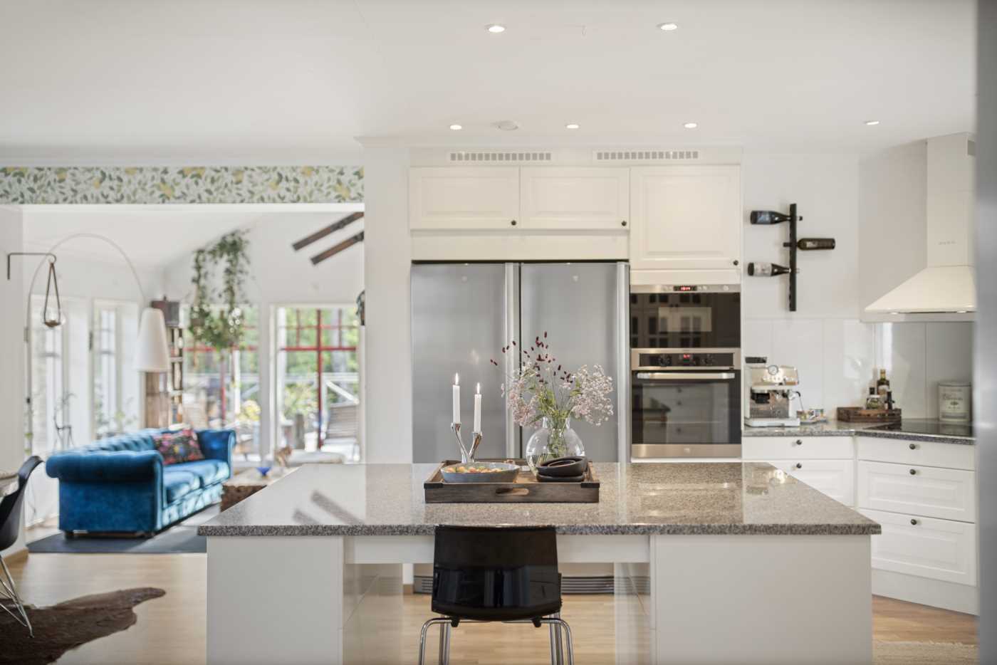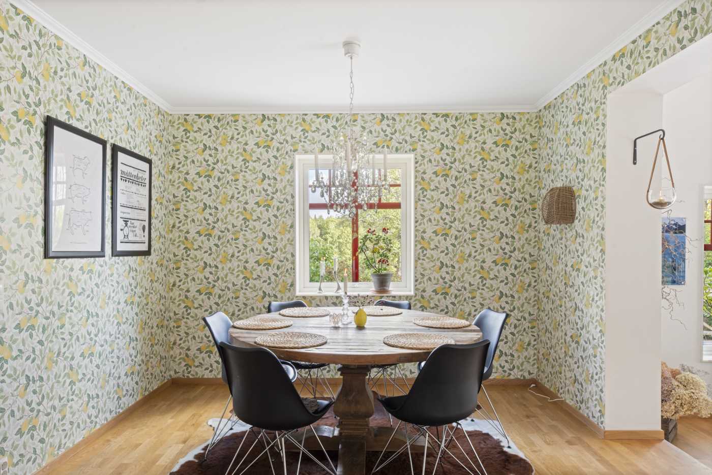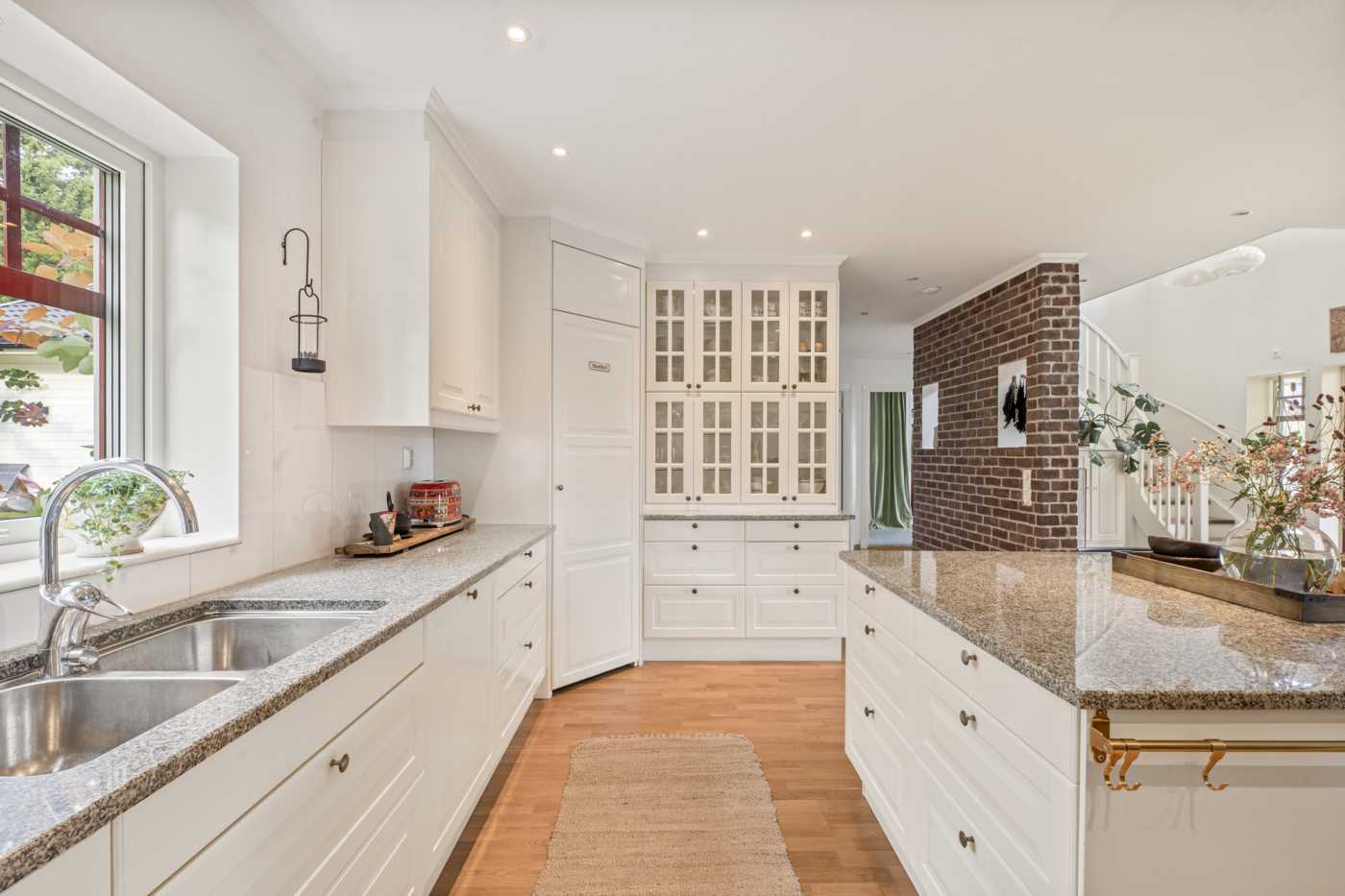 Stort och härligt lantkök med fantastisk förvaring i köksinredning med vita luckor och klassiska attribut som rymligt skafferi och köpmansdisk med vitrinskåp. Här finns även en köksö med två sittplatser som ger både extra förvaring och fin arbetsyta. Det är vitt kakel ovan de vackra arbetsbänkarna i granit med generöst tilltagna arbetsytor och diskhon är placerad framför ett fönster med utsikt mot baksidans lekytor och skogsdungen. I anslutning till köket finns en matplats framför ett fönster med vy mot entrén, här finns plats för stora middagssällskap. Det är vita väggar och infällda spotlights i taket i köksdelen, matplatsen har tapetserade väggar och det är ekparkettgolv med vattenburen golvvärme precis som i resten av huset.