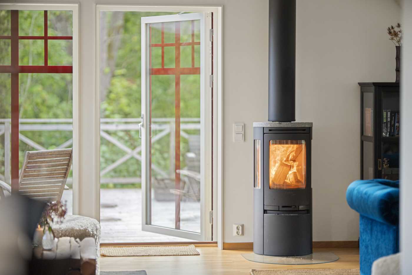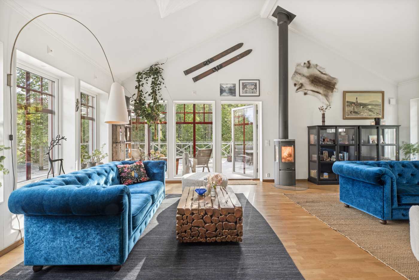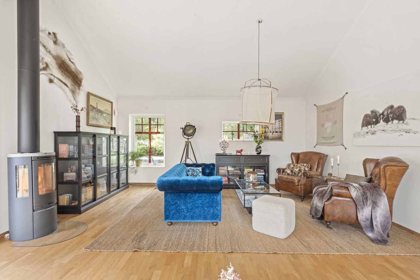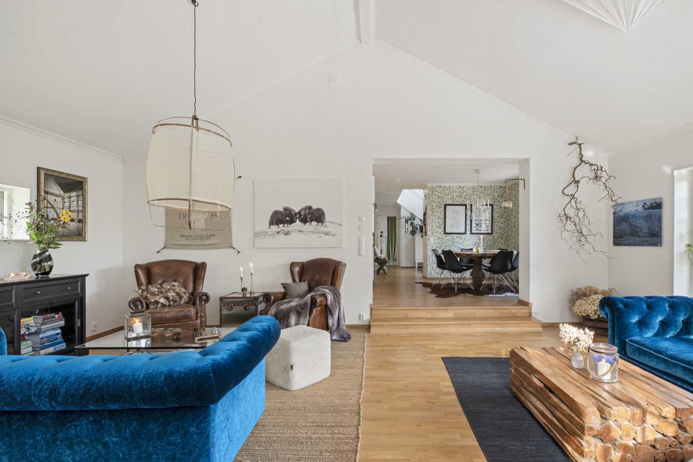 Från köket med matplats är det två trappsteg ner till det magnifika vardagsrummet om ca 45 kvm med ryggåstak som ger fantastisk rymd med en takhöjd om ca 5 m. Rummet har en värmande braskamin från Contura och fint ljusinsläpp via flera fönsterpartier varav ett med golvfönster där en helglasad dörr leder ut till terrassen och de sagolika sällskapsytorna utomhus. Vita väggar och ekparkett.