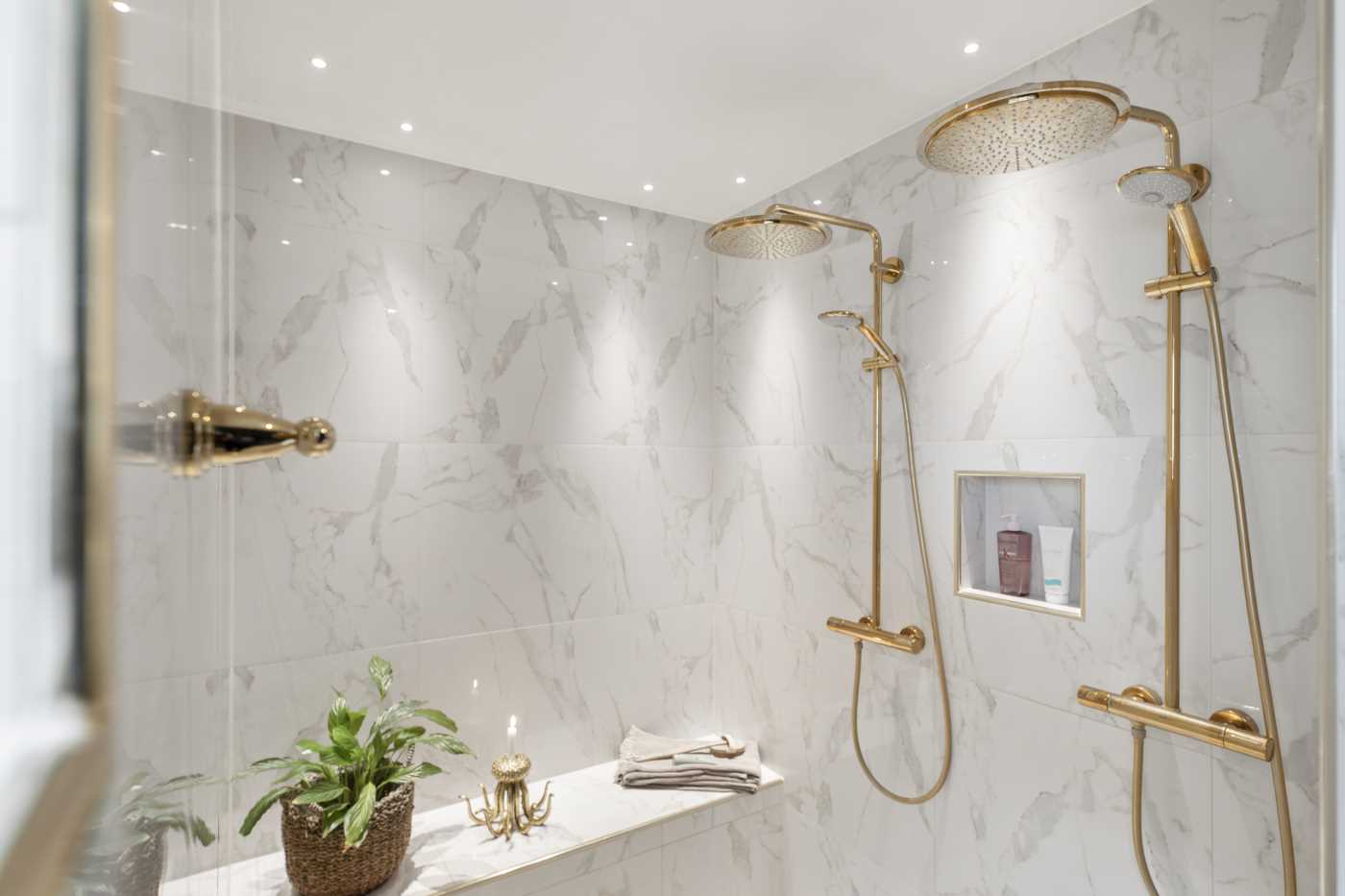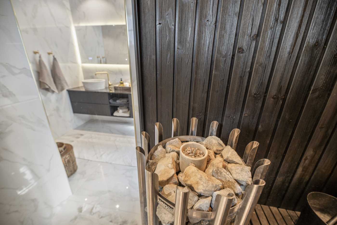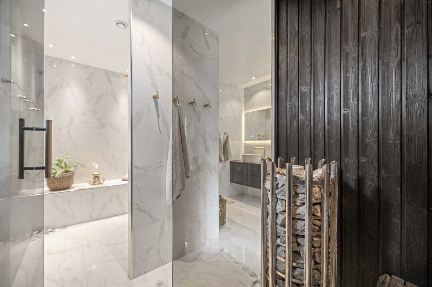 Från dressingroom:et nås denna ljuvliga badrumsdröm med känsla av ett spa. Badrummet går i lyxig marmorkänsla och guldiga toner med inslag av mörkt trä. Här finns både ett stilrent badkar mot en guldfärgad mosaikvägg och en generös dubbeldusch med både nisch för duschprodukter och en kaklad sittbänk. Bastun har tonade glasdörrar, lavar i mörkbetsad asp och infällda spotlights i tak. Under en spegel med belysning och inbyggd sminkspegel är två fristående tvättställ i natursten är placerade på bänkskiva i sten med förvaring under. Wc:n är diskret placerad bakom en vägg. Väggar och golv är klädda med klinker med marmormönster även här med vattenburen golvvärme, ett fullstort fönster och ett mindre ger badrummet fint ljusinsläpp.