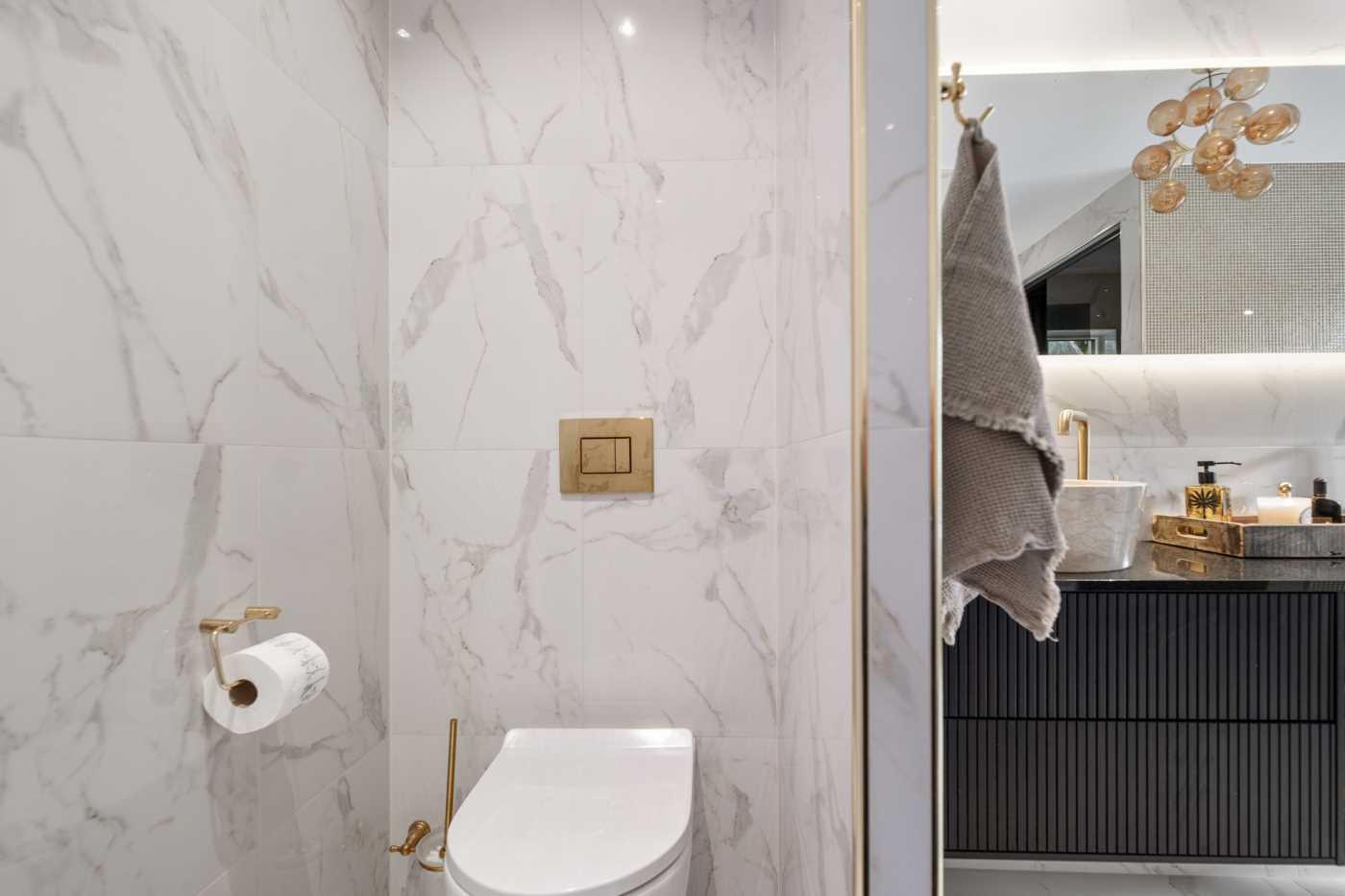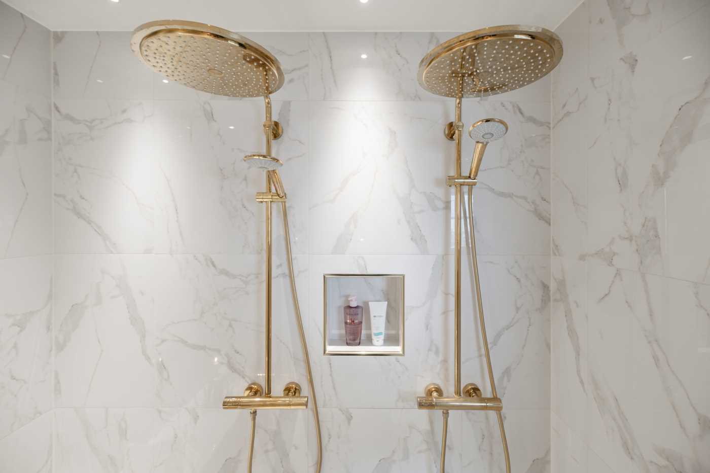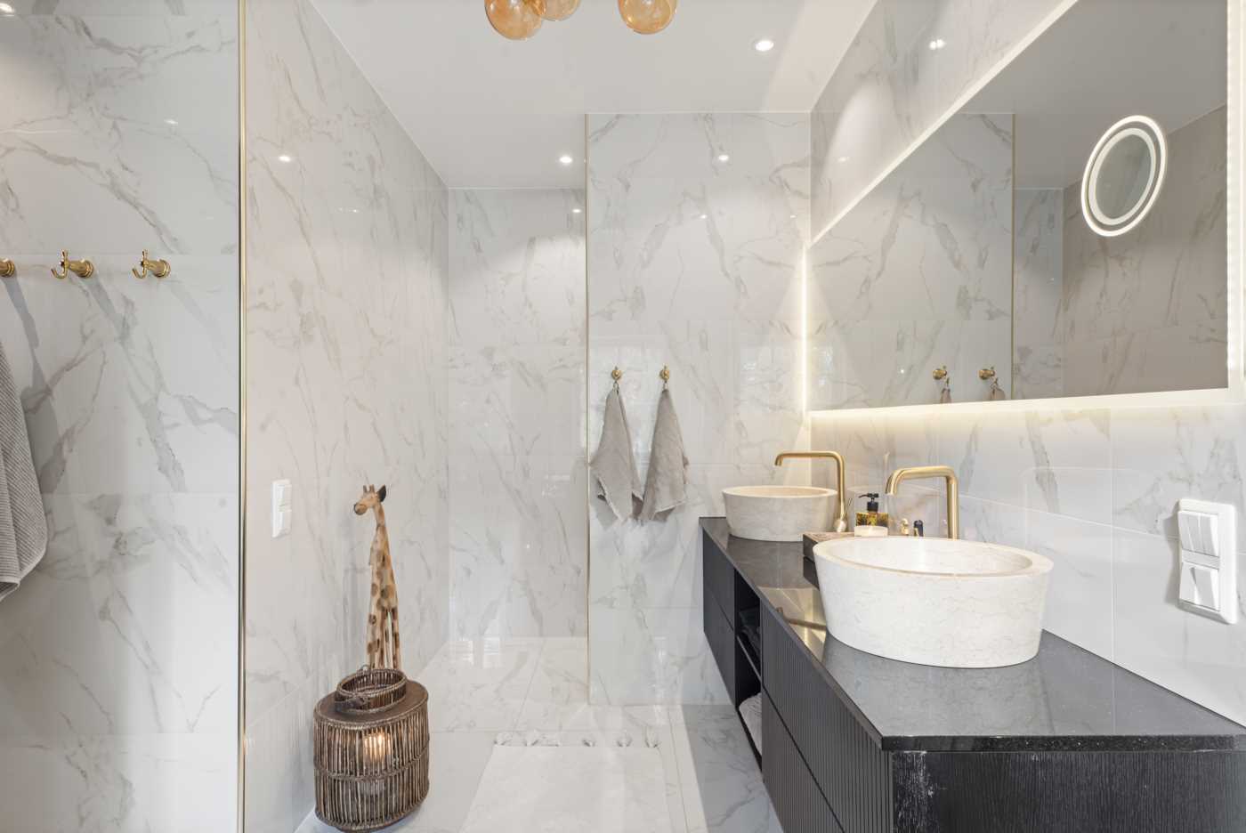 Från dressingroom:et nås denna ljuvliga badrumsdröm med känsla av ett spa. Badrummet går i lyxig marmorkänsla och guldiga toner med inslag av mörkt trä. Här finns både ett stilrent badkar mot en guldfärgad mosaikvägg och en generös dubbeldusch med både nisch för duschprodukter och en kaklad sittbänk. Bastun har tonade glasdörrar, lavar i mörkbetsad asp och infällda spotlights i tak. Under en spegel med belysning och inbyggd sminkspegel är två fristående tvättställ i natursten är placerade på bänkskiva i sten med förvaring under. Wc:n är diskret placerad bakom en vägg. Väggar och golv är klädda med klinker med marmormönster även här med vattenburen golvvärme, ett fullstort fönster och ett mindre ger badrummet fint ljusinsläpp.