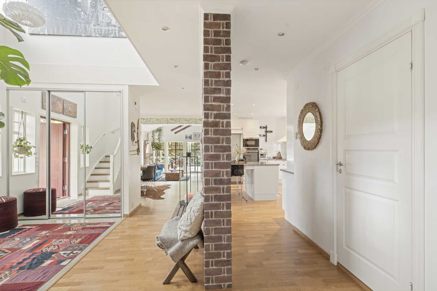 Välkomnande entré via farstukvist med skyddande grönska mot uppfarten, från farstukvisten nås även den inbjudande terrassen som löper från entrén runt husets ena gavel. Hall med härlig rymd då det är öppet upp till övervåningen och fint ljusinsläpp från två mindre fönster i entrén och två stora fönster på det övre planet. I hallen finns generöst med plats för ytterkläder i en skjutdörrsgarderob med spegeldörrar samt ytterligare förvaringsmöjlighet i förråd under trappan. Vita väggar och praktisk klinker i anslutning till entrén som övergår i ekparkett i den inre hallen som även har en vacker tegelvägg. Det är vattenburen golvvärme genomgående i husets båda plan.