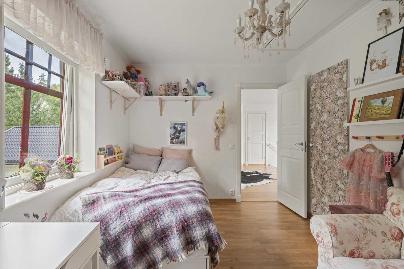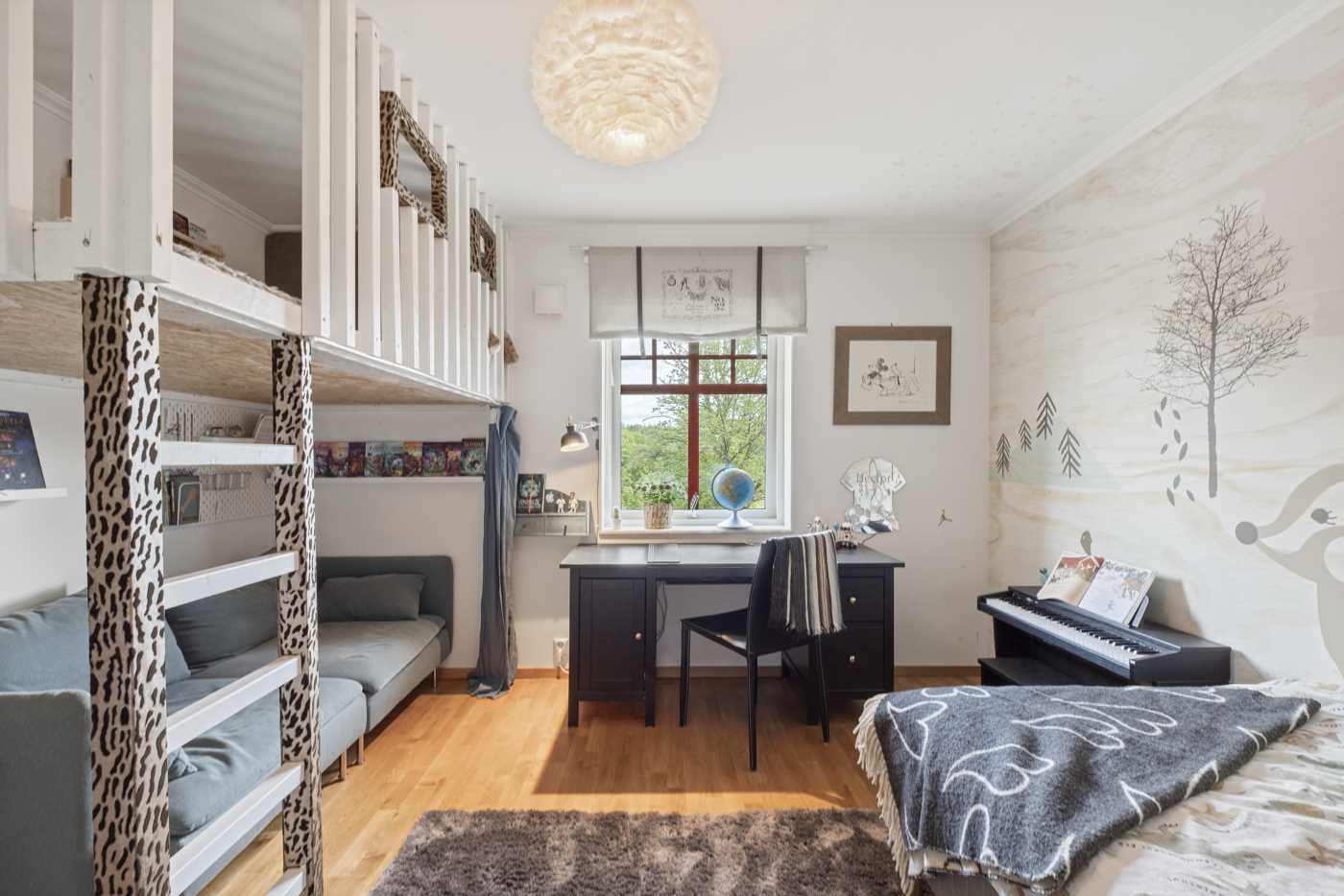 Sovrum med platsbyggt loft (lämnas gärna kvar) med plats för antingen säng eller lekhörna och två platsbyggda garderober. Ljusa väggar i kombination med fondvägg och ekparkett.