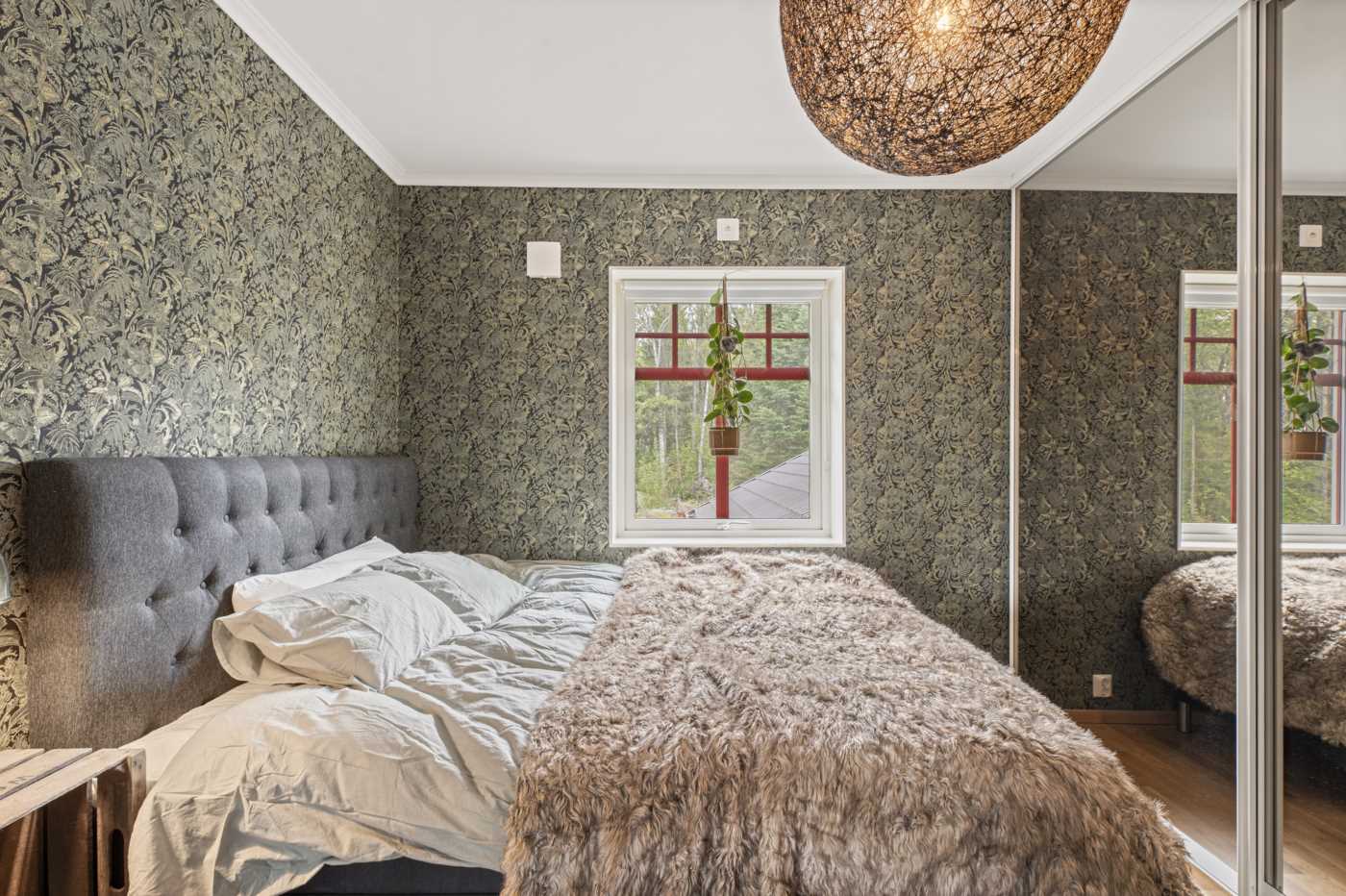 Mysigt sovrum med generöst med förvaring i hel garderobsvägg med skjutdörrar. Snyggt mönstrad tapet och ekparkett.