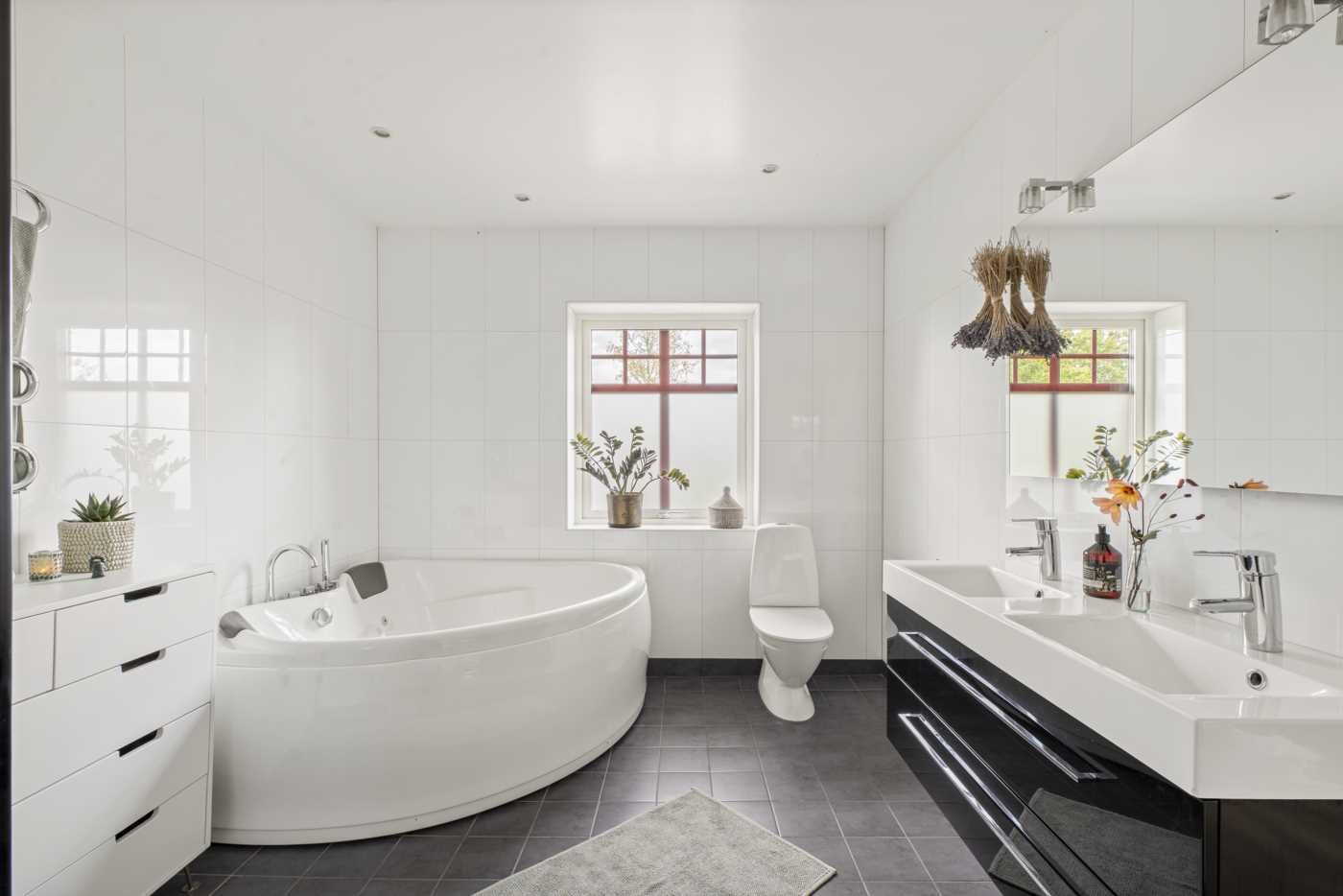 Stort badrum med vitt kakel på väggar och klinker i brun ton med vattenburen golvvärme. Här finns både ett spabadkar och en dusch med vikbara glasdörrar, spegel med belysning ovan en dubbelkommod samt wc. Ljusinsläpp via ett fullstort fönster samt inbyggda spotlights i tak.