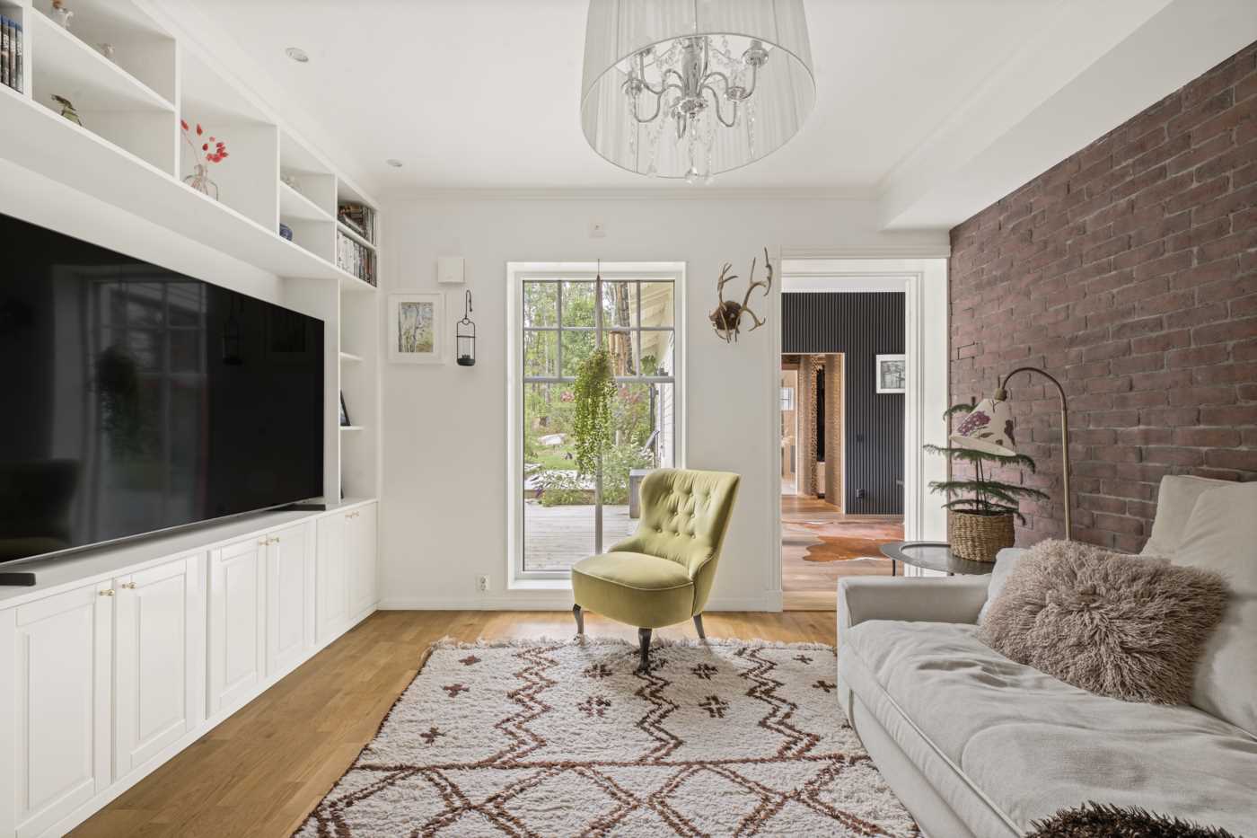 TV-rum med fint ljusinsläpp via ett golvfönster med vy mot husets andra trädäck på baksidan. Här finns en platsbyggd bokhylla med generöst med förvaring i både skåp och hyllor och plats för tv:n. Vita väggar i kombination med en framtagen tegelvägg och ekparkett.