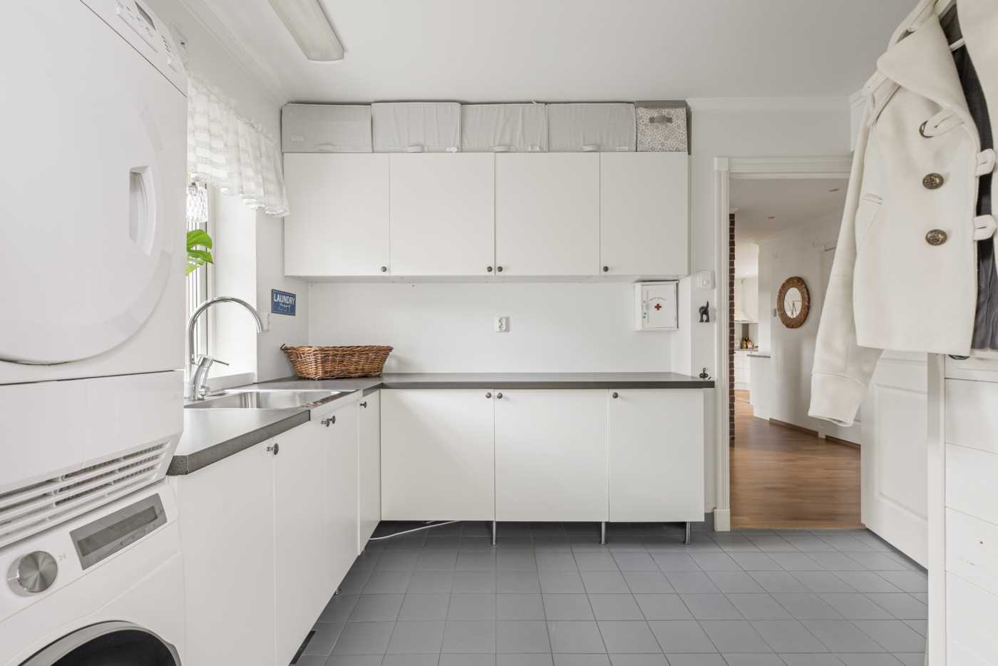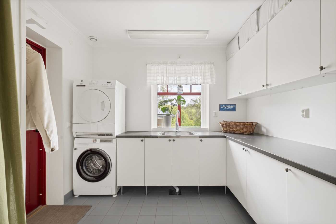 Stor tvättstuga med groventré och plats för ytterkläder i både hatthylla och öppen garderob. Här finns generöst med förvaringsmöjligheter i både över- och underskåp samt fina bänkytor där en ho är placerad framför ett fönster. Tvättstugan är utrustad med tvättpelare med tvättmaskin Samsung -25 och torktumlare Electrolux -13, här finns även husets Frånluftsvärmepump från Comfortzone (2013). Vita väggar och grå klinker.