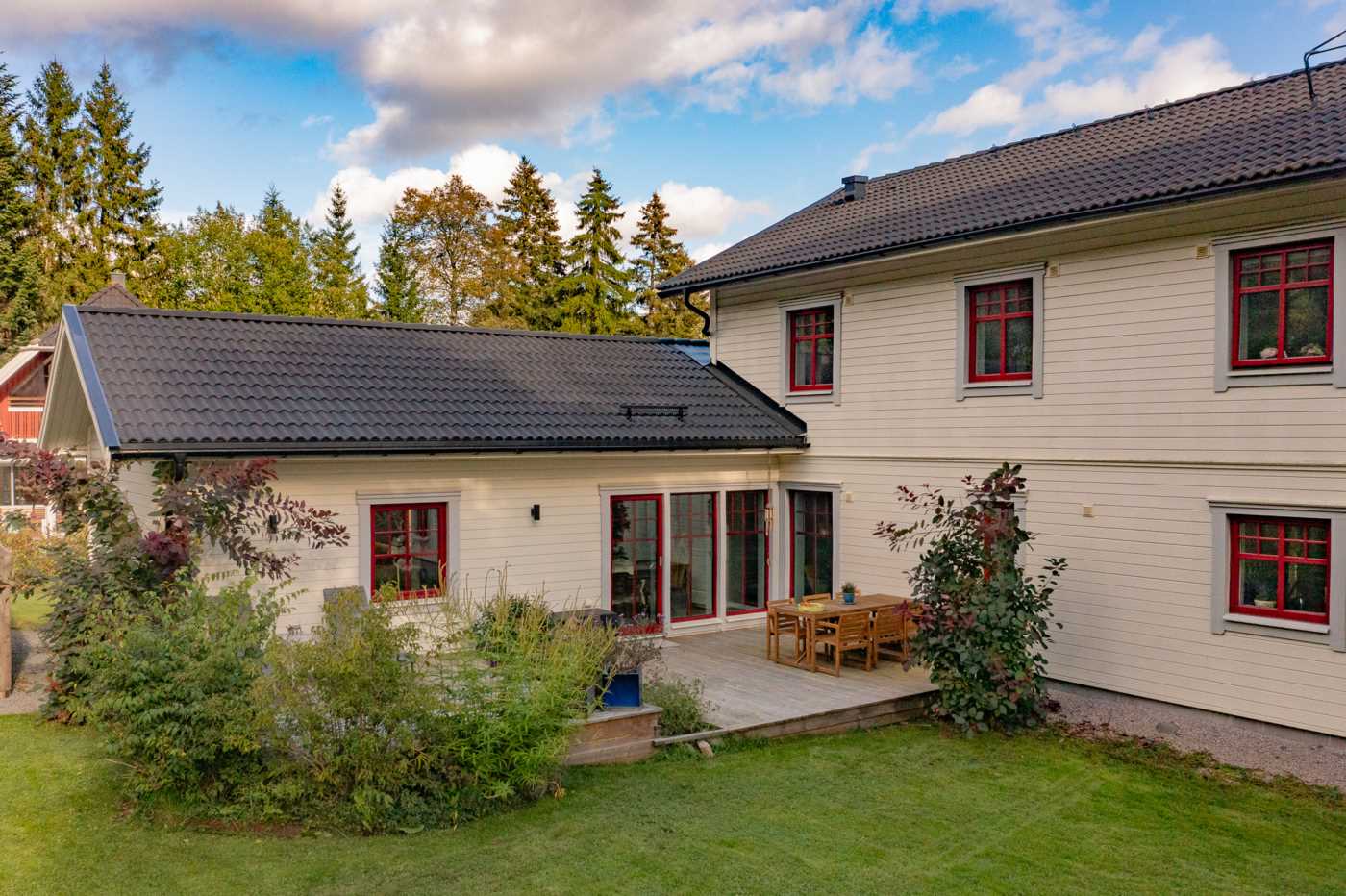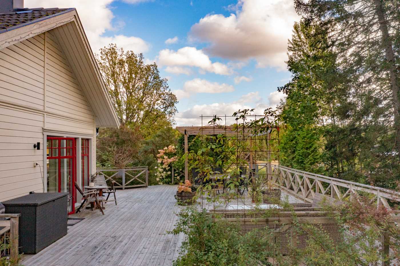 Nu har jag glädjen att presentera denna drömvilla i toppskick om hela 249 kvm boarea som uppfördes 2013 av den kvalitetsmedvetna byggfirman Rohus Bygg. Ägarfamiljen flyttade in när huset var nytt och har under sina år skapat en fantastisk trädgård om 2 238 kvm med stora härliga terrasser runt en stor del av huset. 2021-22 byggdes huset till av den erkänt duktiga byggfirman SBM i en vinkel på ett utsökt vis för att skapa en föräldraavdelning om hela 50 kvm med ett ”master bedroom”, dressingroom och ett stort påkostat hemmaspa med dubbeldusch, badkar och bastu. Man välkomnas in i en stor entré med dubbel takhöjd, praktisk förvaring i en skjutdörrs garderob och strax intill finns ett stort tilltalande kök med arbetsbänkar i granit, ett rymligt skafferi och en härlig matplats. Ett trappsteg ner från köket finner man det stora vardagsrummet om ca 45 kvm med ryggåstak, en värmande braskamin och en glasad dörr som leder ut till trädäcket och vidare ut i trädgården. På entréplan finns även ett stilrent helkaklat duschrum samt en rymlig tvättstuga med groventré och praktiska arbetsytor. En fin trappa leder upp till ett stort och ljust allrum och på detta plan finns även tre fina sovrum samt ett stort helkaklat badrum.