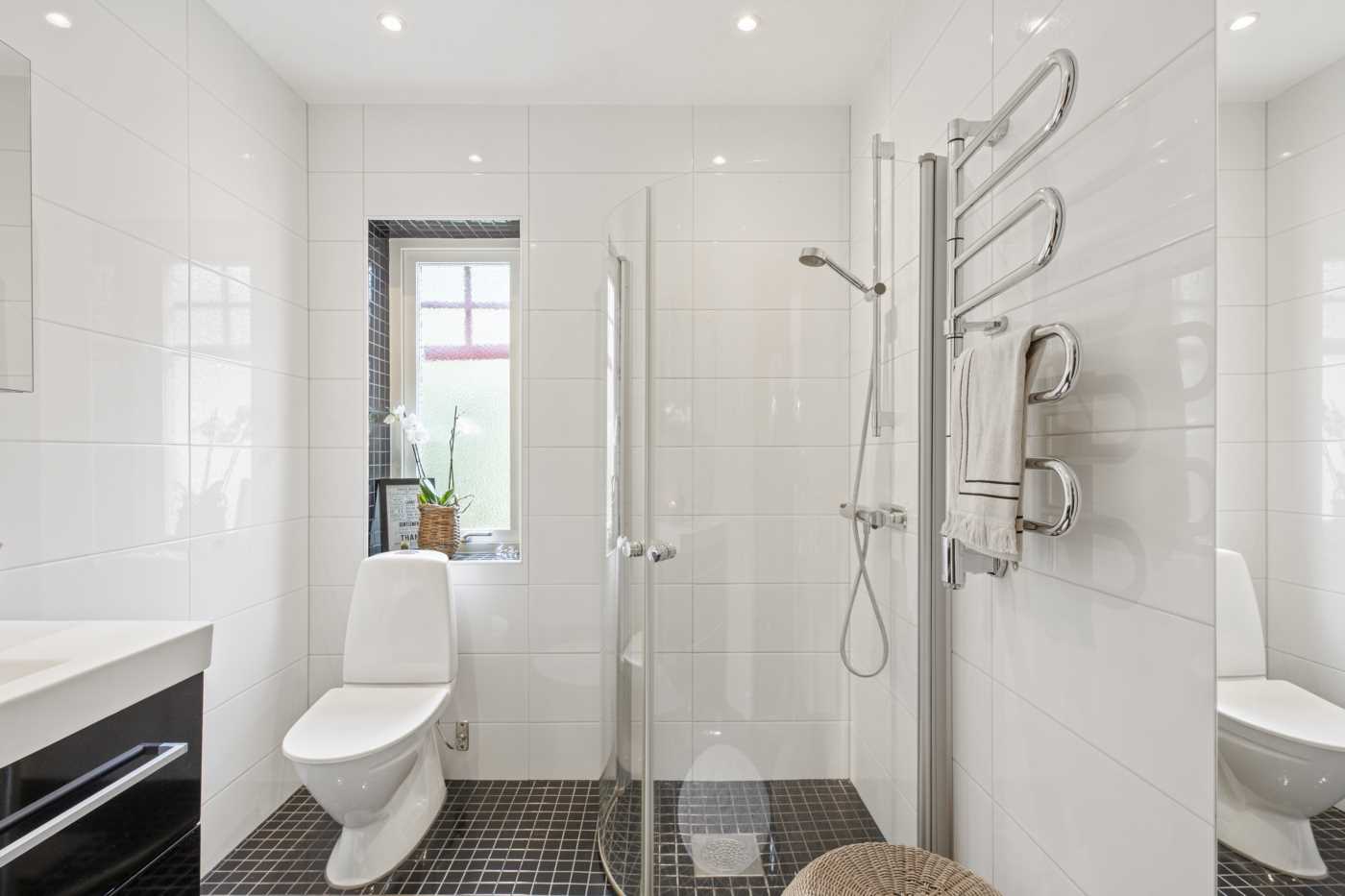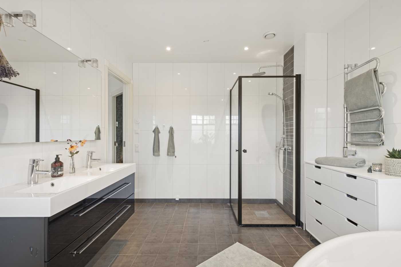 Totalt finns det tre helkaklade duschrum varav ett mycket påkostat med bastu och hemmaspa känsla. Huset värms genom en frånluftsvärmepump genom vattenburen golvvärme på båda planen och 2024 installerades 40 solpaneler med batterbackup.