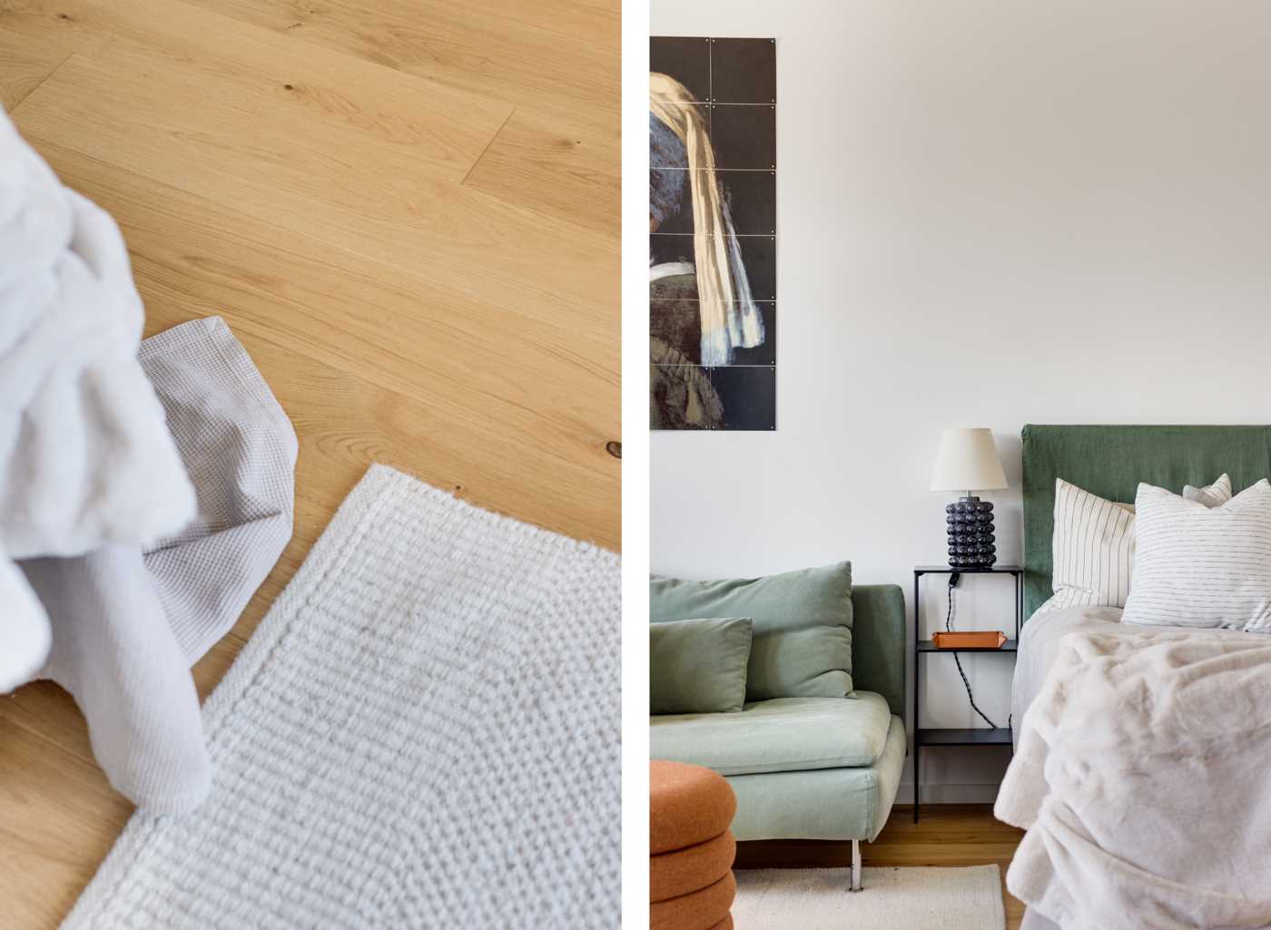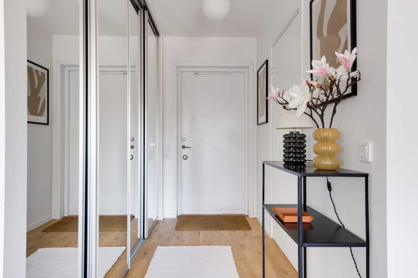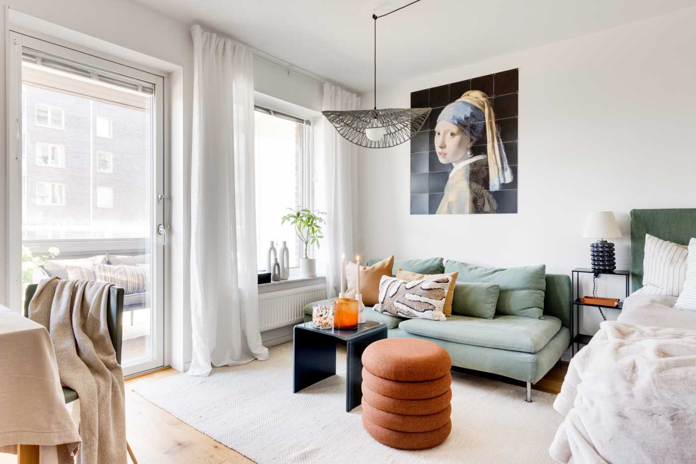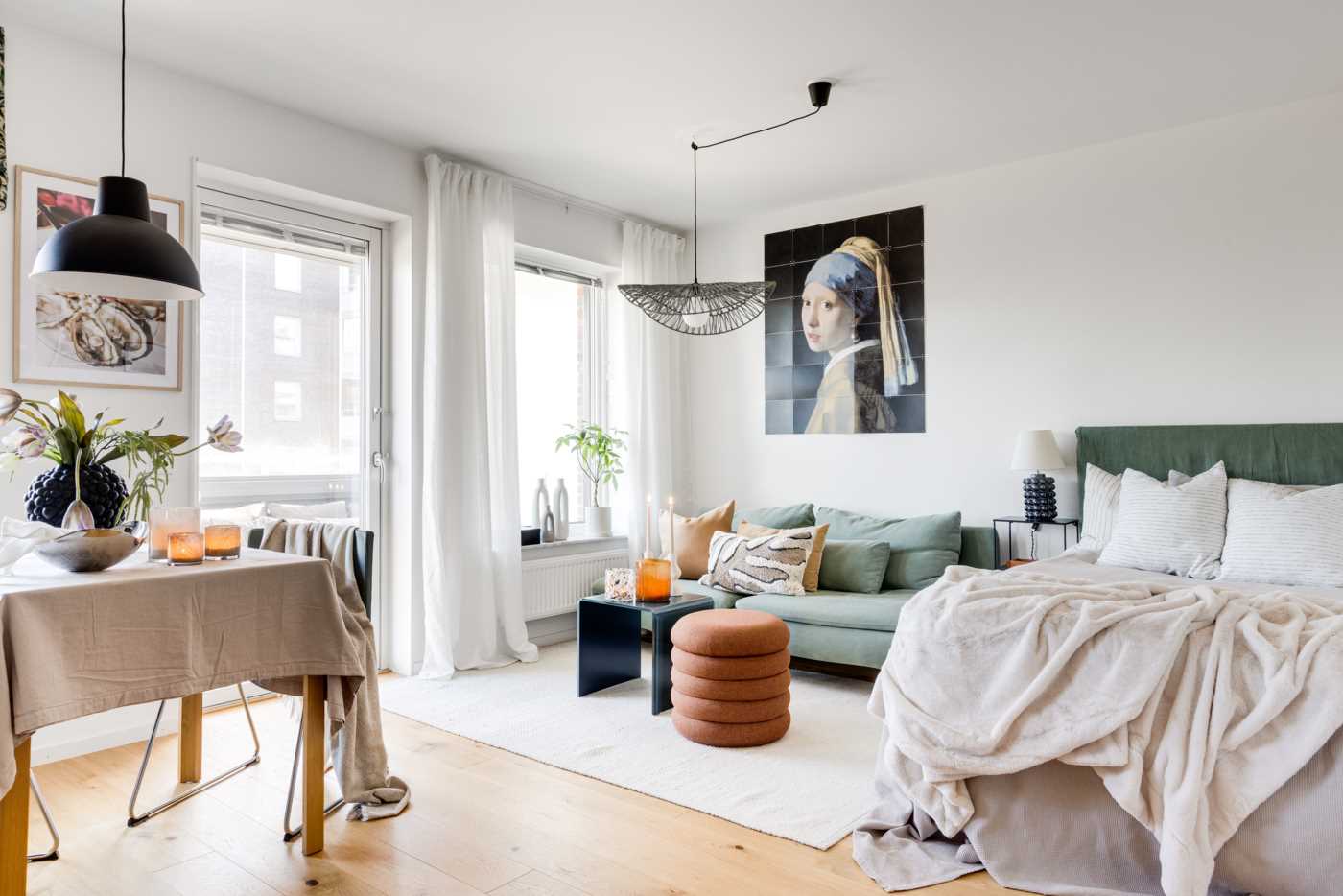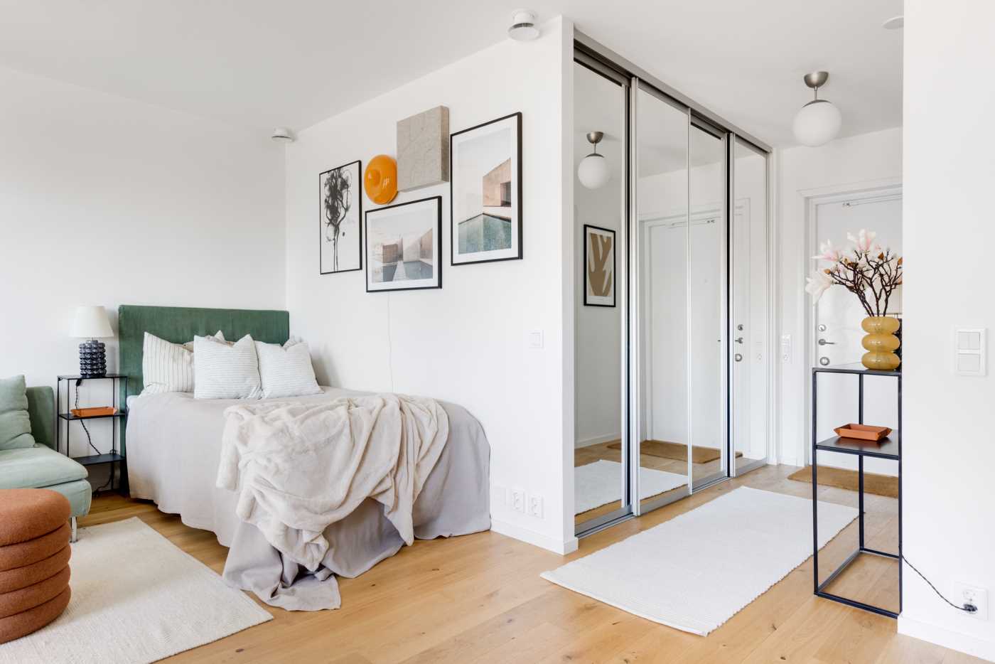 Lägenheten erbjuder ett fullutrustat och modernt kök från Vedum med fina vitvaror, varmgråa släta skåpluckor och gott om arbetsytor. Den smarta planlösningen rymmer ett rymligt vardagsrum med plats för sängen men även för matbord och soffa. De stora fönsterpartierna ger ett härligt ljusinsläpp och från rummet nås den inglasade balkongen, som blir en naturlig förlängning av bostaden och kan nyttjas stora delar av året.